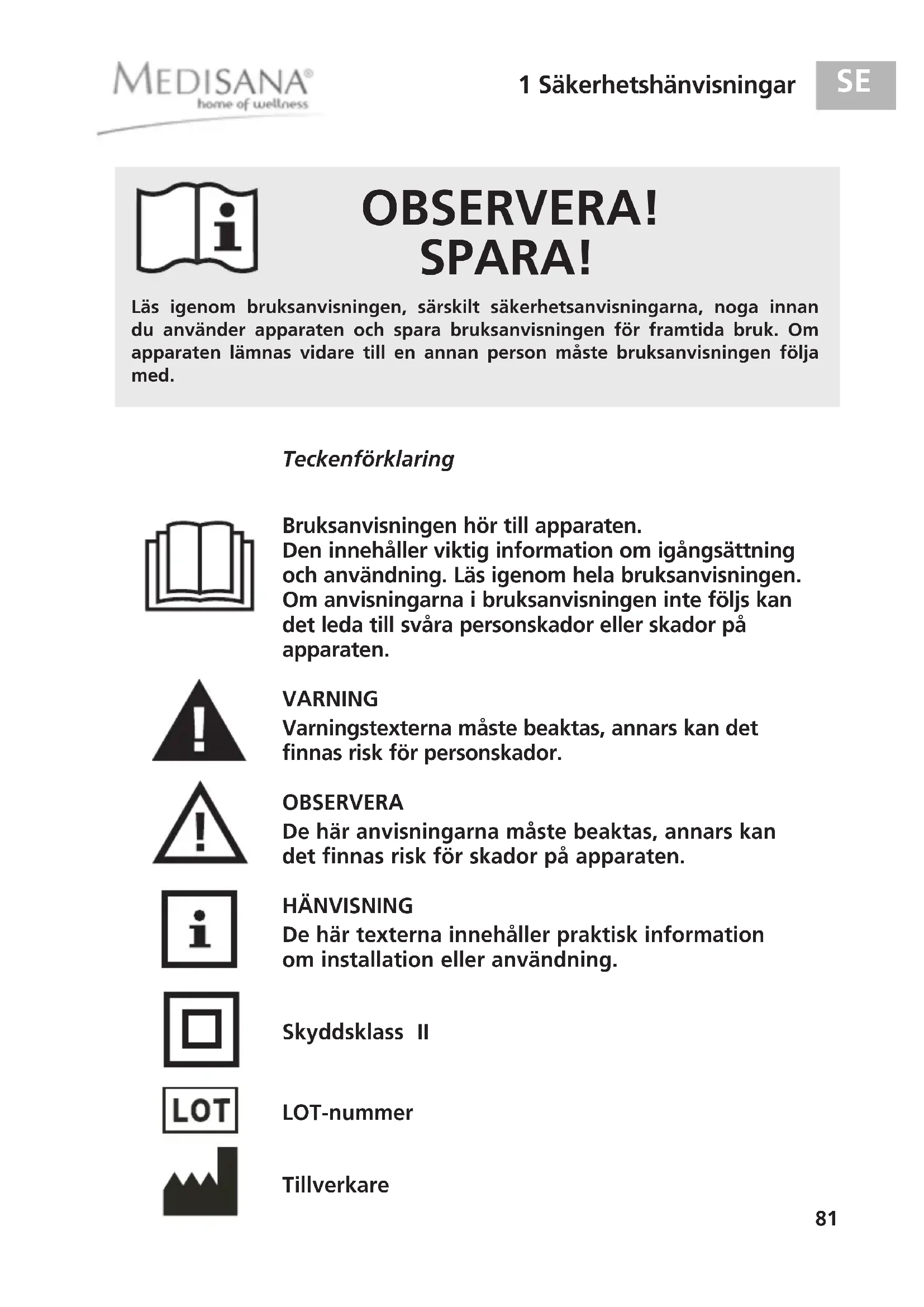 OBSERVERA! SPARA! Bruksanvisningen hör till apparaten. Den innehåller viktig information om igångsättning och användning. Läs igenom hela bruksanvisningen. Om anvisningarna i bruksanvisningen inte följs kan det leda till svåra personskador eller skador på apparaten. VARNING Varningstexterna måste beaktas, annars kan det finnas risk för personskador. OBSERVERA De här anvisningarna måste beaktas, annars kan det finnas risk för skador på apparaten. HÄNVISNING De här texterna innehåller praktisk information om installation eller användning. Skyddsklass II LOT-nummer Tillverkare Läs igenom bruksanvisningen, särskilt säkerhetsanvisningarna, noga innandu använder apparaten och spara bruksanvisningen för framtida bruk. Omapparaten lämnas vidare till en annan person måste bruksanvisningen följa med. Teckenförklaring 88930_MCN_WEST_Final_aktual.qxd:Massagesitz 31.03.2011 10:45 Uhr Seite 8182 1 Säkerhetshänvisningar
