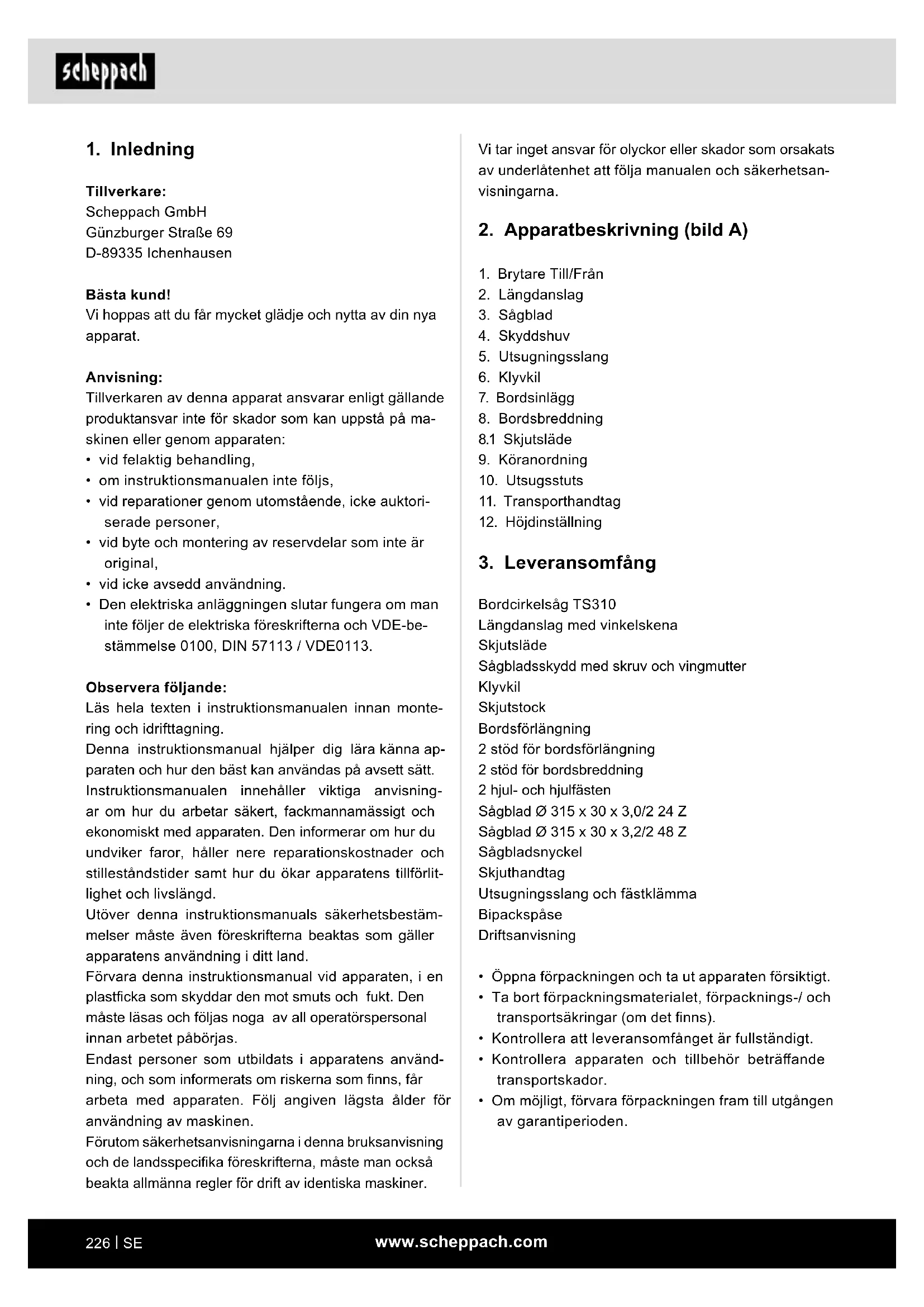 BRUKSANVISNING TS310 SCHEPPACH