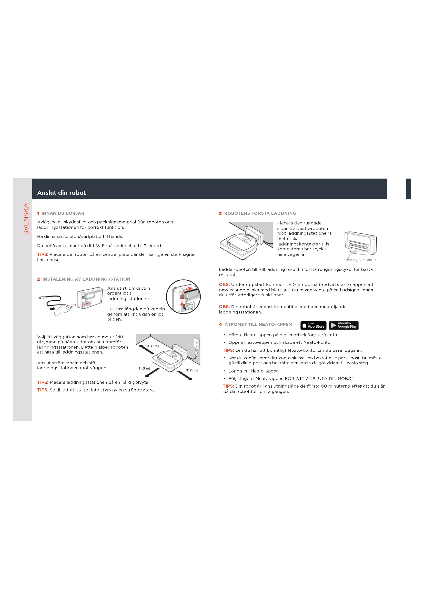 - Akut – 12–18 kuukauden välein Käyttöopas löytyy osoitteesta www.NeatoRobotics.com/UG Katso ohjevideo osoitteesta www.NeatoRobotics.com/support1 INNAN DU BÖRJAR Avlägsna all skyddsfilm och packningsmaterial från roboten och laddningsstationen för korrekt funktion. Ha din smarttelefon/surfplatta till hands. Du behöver namnet på ditt WiFi-nätverk och ditt lösenord. TIPS: Placera din router på en central plats där den kan ge en stark signal ihela huset.