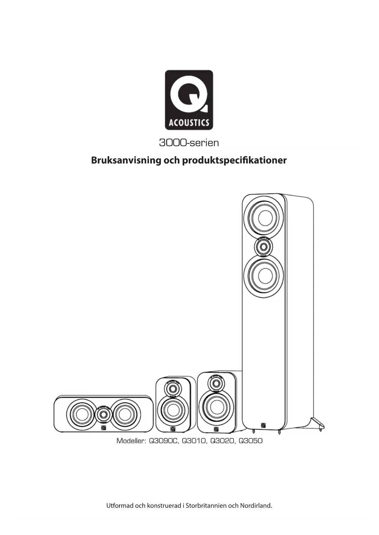 430 × 150 × 200 6,0 кгwww.Qacoustics.co.uk Q15410-IS_r2 RUUtformad och konstruerad i Storbritannien och Nordirland. 3000-serien Bruksanvisning och produktspecikationer Modeller: Q3090C, Q3010, Q3020, Q3050VIKTIG INFORMATION - LÄS NOGGRANT Läs dessa anvisningar. Behåll dessa anvisningar. Beakta alla varningsmeddelanden. Följ alla anvisningar. Använd inte denna enhet nära vatten. Rengör endast med en torr trasa. Blockera inte några ventilationsöppningar. Installera enligt tillverkarens anvisningar. Använd endast tillbehör som godkänts av tillverkaren. Använd endast tillsammans med vagn, ställning, trebensstativ, fäste eller bord enligt tillverkarens specikationer eller som säljs tillsammans med enheten. Vid användning av vagn, var försiktig när vagnen och enheten yttas för att undvika personskador om ekipaget välter. Varning: Ändringar eller modieringar som inte uttryckligen har godkänts av tillverkaren kan medföra att enheten inte längre får användas. Service: Utrustning som behöver service ska returneras till återförsäljaren eller till servicerepresentanten för ditt område. Adresser till utsedda ombud i Storbritannien nns i den här bruksanvisningen. Säkerhetsinformation