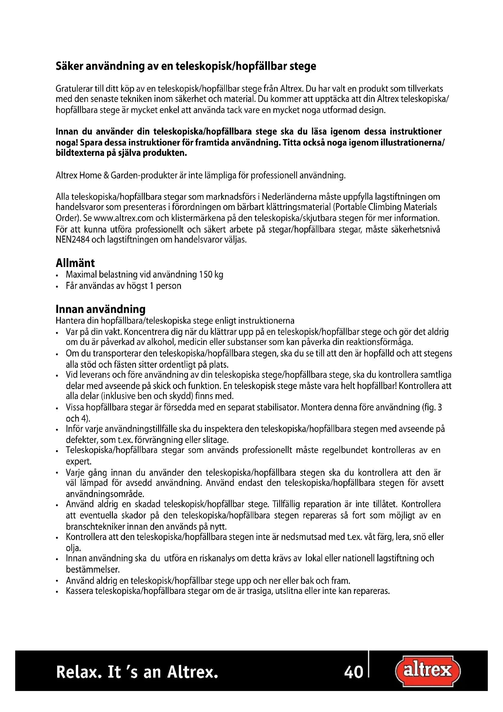 b.40 41 Relax. It ’s an Altrex. Säker användning av en teleskopisk/hopfällbar stege Gratulerar till ditt köp av en teleskopisk/hopfällbar stege från Altrex. Du har valt en produkt som tillverkats med den senaste tekniken inom säkerhet och material. Du kommer att upptäcka att din Altrex teleskopiska/ hopfällbara stege är mycket enkel att använda tack vare en mycket noga utformad design. Innan du använder din teleskopiska/hopfällbara stege ska du läsa igenom dessa instruktioner noga! Spara dessa instruktioner för framtida användning. Titta också noga igenom illustrationerna/ bildtexterna på själva produkten. Altrex Home & Garden-produkter är inte lämpliga för professionell användning. Alla teleskopiska/hopfällbara stegar som marknadsförs i Nederländerna måste uppfylla lagstiftningen om handelsvaror som presenteras i förordningen om bärbart klättringsmaterial (Portable Climbing Materials Order). Se www.altrex.com och klistermärkena på den teleskopiska/skjutbara stegen för mer information. För att kunna utföra professionellt och säkert arbete på stegar/hopfällbara stegar, måste säkerhetsnivå NEN2484 och lagstiftningen om handelsvaror väljas. Allmänt Maximal belastning vid användning 150 kg Får användas av högst 1 person Innan användning Hantera din hopfällbara/teleskopiska stege enligt instruktionerna Var på din vakt. Koncentrera dig när du klättrar upp på en teleskopisk/hopfällbar stege och gör det aldrig om du är påverkad av alkohol, medicin eller substanser som kan påverka din reaktionsförmåga. Om du transporterar den teleskopiska/hopfällbara stegen, ska du se till att den är hopfälld och att stegens alla stöd och fästen sitter ordentligt på plats. Vid leverans och före användning av din teleskopiska stege/hopfällbara stege, ska du kontrollera samtliga delar med avseende på skick och funktion. En teleskopisk stege måste vara helt hopfällbar! Kontrollera att alla delar (inklusive ben och skydd) finns med. Vissa hopfällbara stegar är försedda med en separat stabilisator. Montera denna före användning (fig. 3 och 4). Inför varje användningstillfälle ska du inspektera den teleskopiska/hopfällbara stegen med avseende på defekter, som t.ex. förvrängning eller slitage. Teleskopiska/hopfällbara stegar som används professionellt måste regelbundet kontrolleras av en expert. Varje gång innan du använder den teleskopiska/hopfällbara stegen ska du kontrollera att den är väl lämpad för avsedd användning. Använd endast den teleskopiska/hopfällbara stegen för avsett användningsområde. Använd aldrig en skadad teleskopisk/hopfällbar stege. Tillfällig reparation är inte tillåtet. Kontrollera att eventuella skador på den teleskopiska/hopfällbara stegen repareras så fort som möjligt av en branschtekniker innan den används på nytt. Kontrollera att den teleskopiska/hopfällbara stegen inte är nedsmutsad med t.ex. våt färg, lera, snö eller olja. Innan användning ska du utföra en riskanalys om detta krävs av lokal eller nationell lagstiftning och bestämmelser. Använd aldrig en teleskopisk/hopfällbar stege upp och ner eller bak och fram. Kassera teleskopiska/hopfällbara stegar om de är trasiga, utslitna eller inte kan repareras.