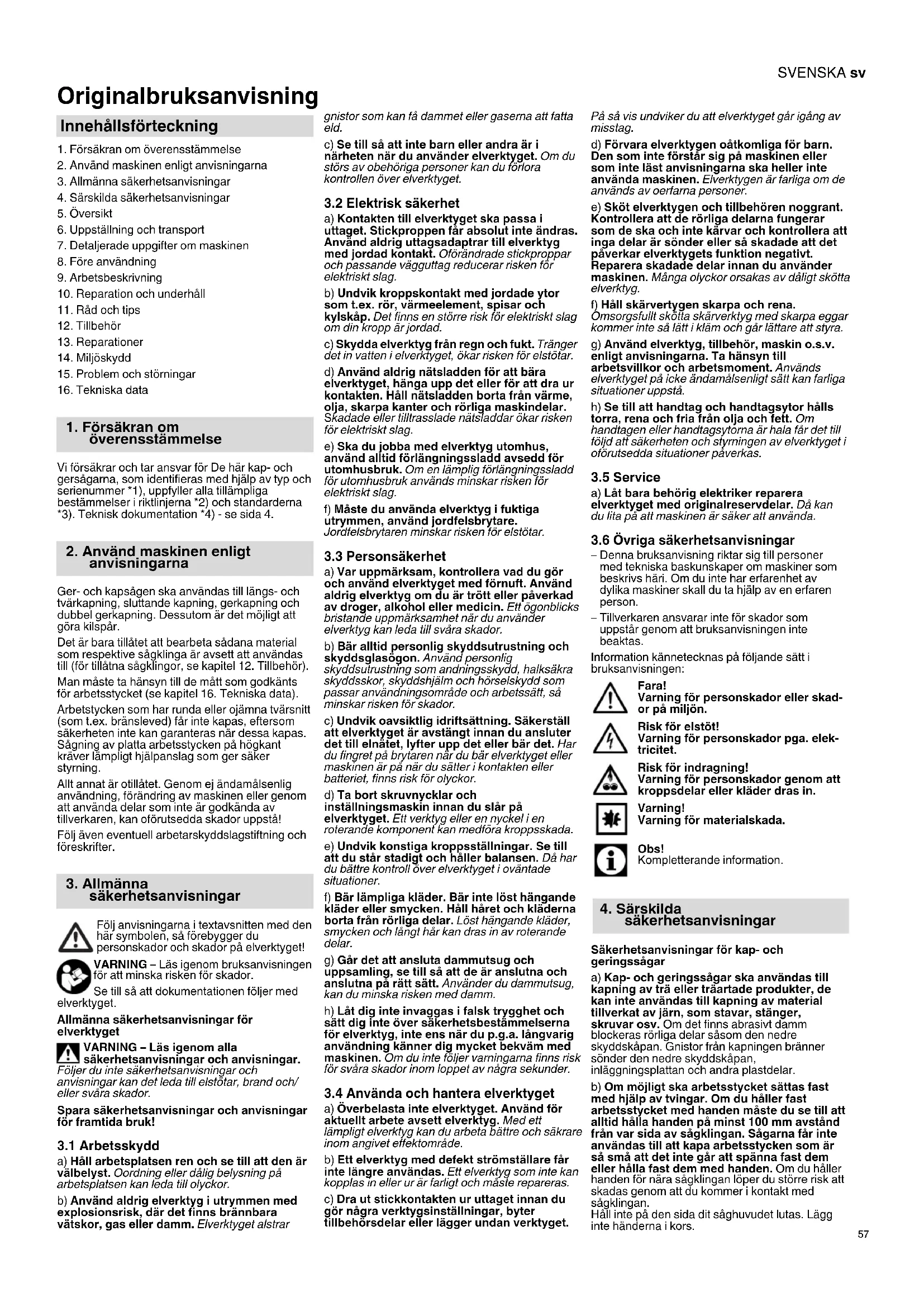 – Denna bruksanvisning riktar sig till personer med tekniska baskunskaper om maskiner som beskrivs häri. Om du inte har erfarenhet av dylika maskiner skall du ta hjälp av en erfaren person. – Tillverkaren ansvarar inte för skador som uppstår genom att bruksanvisningen inte beaktas. Information kännetecknas på följande sätt i bruksanvisningen: Fara! Varning för personskador eller skad- or på miljön. Risk för elstöt! Varning för personskador pga. elek- tricitet. Risk för indragning! Varning för personskador genom att kroppsdelar eller kläder dras in. Varning! Varning för materialskada. Obs! Kompletterande information. Säkerhetsanvisningar för kap- och geringssågar a) Kap- och geringssågar ska användas till kapning av trä eller träartade produkter, de kan inte användas till kapning av material tillverkat av järn, som stavar, stänger, skruvar osv. Om det finns abrasivt damm blockeras rörliga delar såsom den nedre skyddskåpan. Gnistor från kapningen bränner sönder den nedre skyddskåpan, inläggningsplattan och andra plastdelar. b) Om möjligt ska arbetsstycket sättas fast med hjälp av tvingar. Om du håller fast arbetsstycket med handen måste du se till att alltid hålla handen på minst 100 mm avstånd från var sida av sågklingan. Sågarna får inte användas till att kapa arbetsstycken som är så små att det inte går att spänna fast dem eller hålla fast dem med handen. Om du håller handen för nära sågklingan löper du större risk att skadas genom att du kommer i kontakt med sågklingan. Håll inte på den sida dit såghuvudet lutas. Lägg inte händerna i kors. Innehållsförteckning