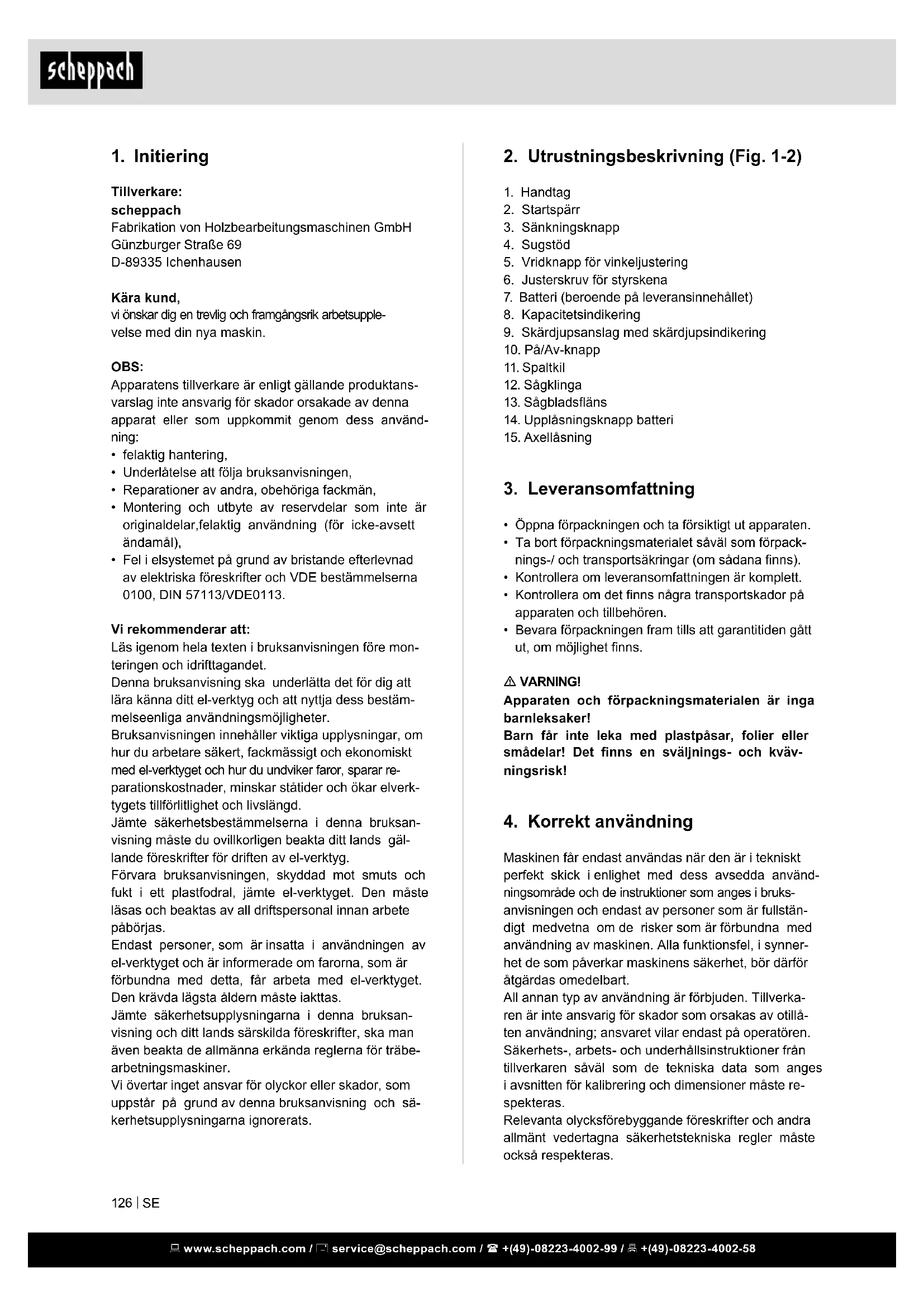 Tillverkare: scheppach Fabrikation von Holzbearbeitungsmaschinen GmbH Günzburger Straße 69 D-89335 Ichenhausen Kära kund, vi önskar dig en trevlig och framgångsrik arbetsupple- velse med din nya maskin. OBS: Apparatens tillverkare är enligt gällande produktans- varslag inte ansvarig för skador orsakade av denna apparat eller som uppkommit genom dess använd- ning: