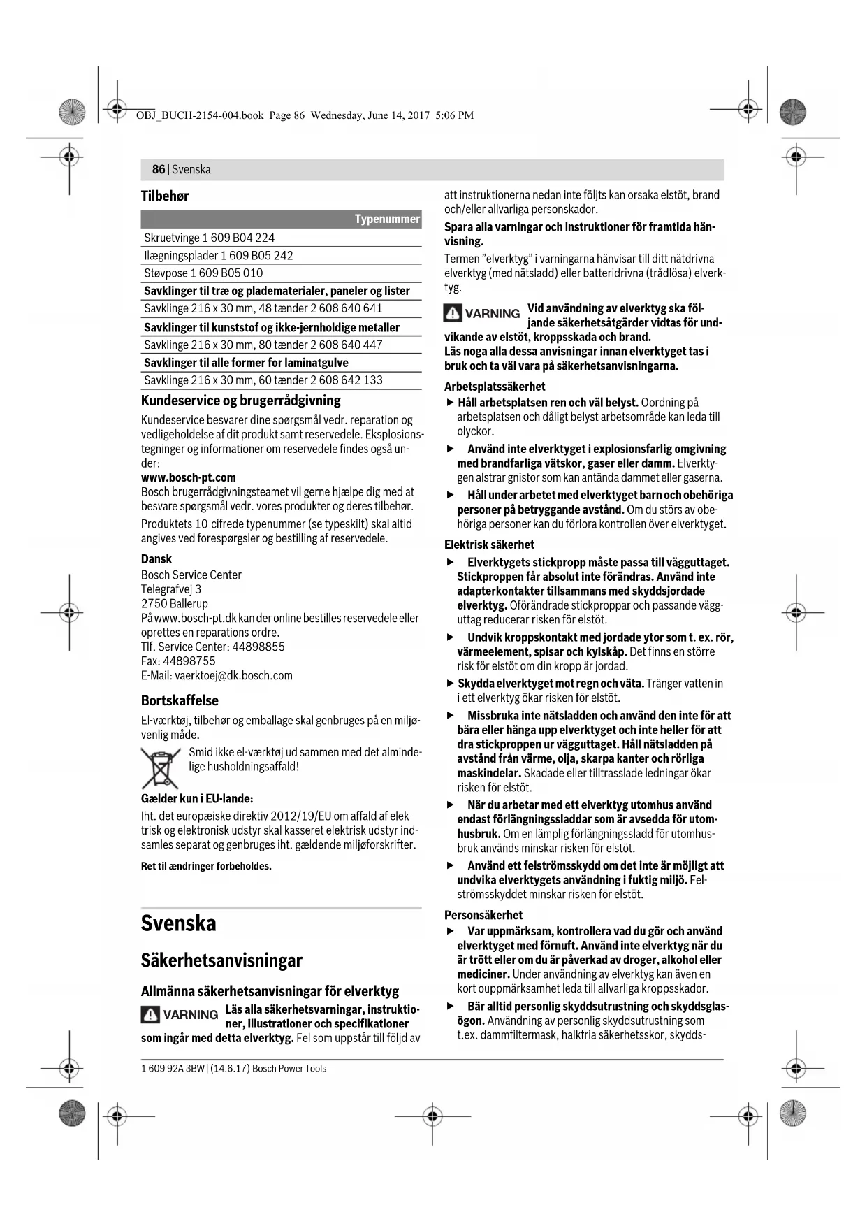 Indstilling: (se billede O2) – Løsne spændegrebet 10. – Løsne kontramøtrikken på anslagsskruen 9 med en almin- delig ring- eller gaffelnøgle (10mm). – Drej anslagsskruen så meget ind eller ud, til benet på vin- kellæren flugter med hele savklingens længde. – Spænd spændegrebet 10 igen. – S pænd herefter kontramøtrikken til anslagsskruen 9 igen. Hvis vinkelviseren 32 efter indstillingen ikke er i en linje med 45°-mærket på skalaen 31, kontrolleres først en gang til 0°-indstillingen for geringsvinklen og vinkelviseren. Herefter gentages indstillingen af 45°-geringsvinklen. Positionering af vinkelviser (vandret) (se Fig. P) – Stil el-værktøjet i arbejdsstilling. –Drej savbordet 22 indtil hakket 28 for 0°. Armen 26 skal falde rigtigt i hak. Kontrol: Vinkelviseren 24 skal være i en linje med 0°-mærket på skala- en 5. Indstilling: –Løsn skruen 45 med en kærvskruetrækker og indstil vin- kelviseren langs med 0°-mærket. – Spænd skruen fast igen. Transport (se Fig. Q) Før el-værktøjet transporteres, skal du gennemføre følgende skridt: – Løsne stilleskruen 11, hvis den er spændt. Træk værktøjs- armen helt frem og spænd stilleskruen igen. – Stil el-værktøjet i transportstilling. – Fjern alle tilbehørsdele, der ikke kan monteres fast på el- værktøjet. Ubenyttede savklinger skal helst opbevares i en lukket be- holder, når de transporteres. – Værktøjet løftes eller transporteres ved at stikke fingrene ind i fordybningerne 4 på siden af savbordet 22. Brug altid transportanordningerne og aldrig beskyttel- sesanordningerne til transport af el-værktøjet. Vedligeholdelse og service Vedligeholdelse og rengøring Træk stikket ud af stikkontakten, før der udføres arbej- de på el-værktøjet. Hvis det er nødvendigt at erstatte tilslutningsledningen, skal dette arbejde udføres af Bosch eller på et autoriseret service- værksted for Bosch el-værktøj for at undgå farer. Rengøring El-værktøj og ventilationsåbninger skal altid holdes rene for at sikre et godt og sikkert arbejde. Pendulbeskyttelsesskærmen skal altid kunne bevæges frit og lukkes automatisk. Derfor skal området omkring beskyttel- sesskærmen altid være rent. Fjern støv og spåner med trykluft eller en pensel efter hver ar- bejdsgang. Rengør gliderullen med regelmæssige mellemrum 20. OBJ_BUCH-2154-004.book Page 85 Wednesday, June 14, 2017 5:06 PM86 | Svenska 1 609 92A 3BW | (14.6.17) Bosch Power Tools Tilbehør Kundeservice og brugerrådgivning Kundeservice besvarer dine spørgsmål vedr. reparation og vedligeholdelse af dit produkt samt reservedele. Eksplosions- tegninger og informationer om reservedele findes også un- der: www.bosch-pt.com Bosch brugerrådgivningsteamet vil gerne hjælpe dig med at besvare spørgsmål vedr. vores produkter og deres tilbehør. Produktets 10-cifrede typenummer (se typeskilt) skal altid angives ved forespørgsler og bestilling af reservedele. Dansk Bosch Service Center Telegrafvej 3 2750 Ballerup På www.bosch-pt.dk kan der online bestilles reservedele eller oprettes en reparations ordre. Tlf. Service Center: 44898855 Fax: 44898755 E-Mail: vaerktoej@dk.bosch.com Bortskaffelse El-værktøj, tilbehør og emballage skal genbruges på en miljø- venlig måde. Smid ikke el-værktøj ud sammen med det alminde- lige husholdningsaffald! Gælder kun i EU-lande: Iht. det europæiske direktiv 2012/19/EU om affald af elek- trisk og elektronisk udstyr skal kasseret elektrisk udstyr ind- samles separat og genbruges iht. gældende miljøforskrifter. Ret til ændringer forbeholdes. Svenska Säkerhetsanvisningar Allmänna säkerhetsanvisningar för elverktyg Läs alla säkerhetsvarningar, instruktio- ner, illustrationer och specifikationer som ingår med detta elverktyg. Fel som uppstår till följd av att instruktionerna nedan inte följts kan orsaka elstöt, brand och/eller allvarliga personskador. Spara alla varningar och instruktioner för framtida hän- visning. Termen ”elverktyg” i varningarna hänvisar till ditt nätdrivna elverktyg (med nätsladd) eller batteridrivna (trådlösa) elverk- tyg. Vid användning av elverktyg ska föl- jande säkerhetsåtgärder vidtas för und- vikande av elstöt, kroppsskada och brand. Läs noga alla dessa anvisningar innan elverktyget tas i bruk och ta väl vara på säkerhetsanvisningarna. Arbetsplatssäkerhet Håll arbetsplatsen ren och väl belyst. Oordning på arbetsplatsen och dåligt belyst arbetsområde kan leda till olyckor. Använd inte elverktyget i explosionsfarlig omgivning med brandfarliga vätskor, gaser eller damm. Elverkty- gen alstrar gnistor som kan antända dammet eller gaserna. Håll under arbetet med elverktyget barn och obehöriga personer på betryggande avstånd. Om du störs av obe- höriga personer kan du förlora kontrollen över elverktyget. Elektrisk säkerhet Elverktygets stickpropp måste passa till vägguttaget. Stickproppen får absolut inte förändras. Använd inte adapterkontakter tillsammans med skyddsjordade elverktyg. Oförändrade stickproppar och passande vägg- uttag reducerar risken för elstöt. Undvik kroppskontakt med jordade ytor som t. ex. rör, värmeelement, spisar och kylskåp. Det finns en större risk för elstöt om din kropp är jordad. Skydda elverktyget mot regn och väta. Tränger vatten in i ett elverktyg ökar risken för elstöt. Missbruka inte nätsladden och använd den inte för att bära eller hänga upp elverktyget och inte heller för att dra stickproppen ur vägguttaget. Håll nätsladden på avstånd från värme, olja, skarpa kanter och rörliga maskindelar. Skadade eller tilltrasslade ledningar ökar risken för elstöt. När du arbetar med ett elverktyg utomhus använd endast förlängningssladdar som är avsedda för utom- husbruk. Om en lämplig förlängningssladd för utomhus- bruk används minskar risken för elstöt. Använd ett felströmsskydd om det inte är möjligt att undvika elverktygets användning i fuktig 