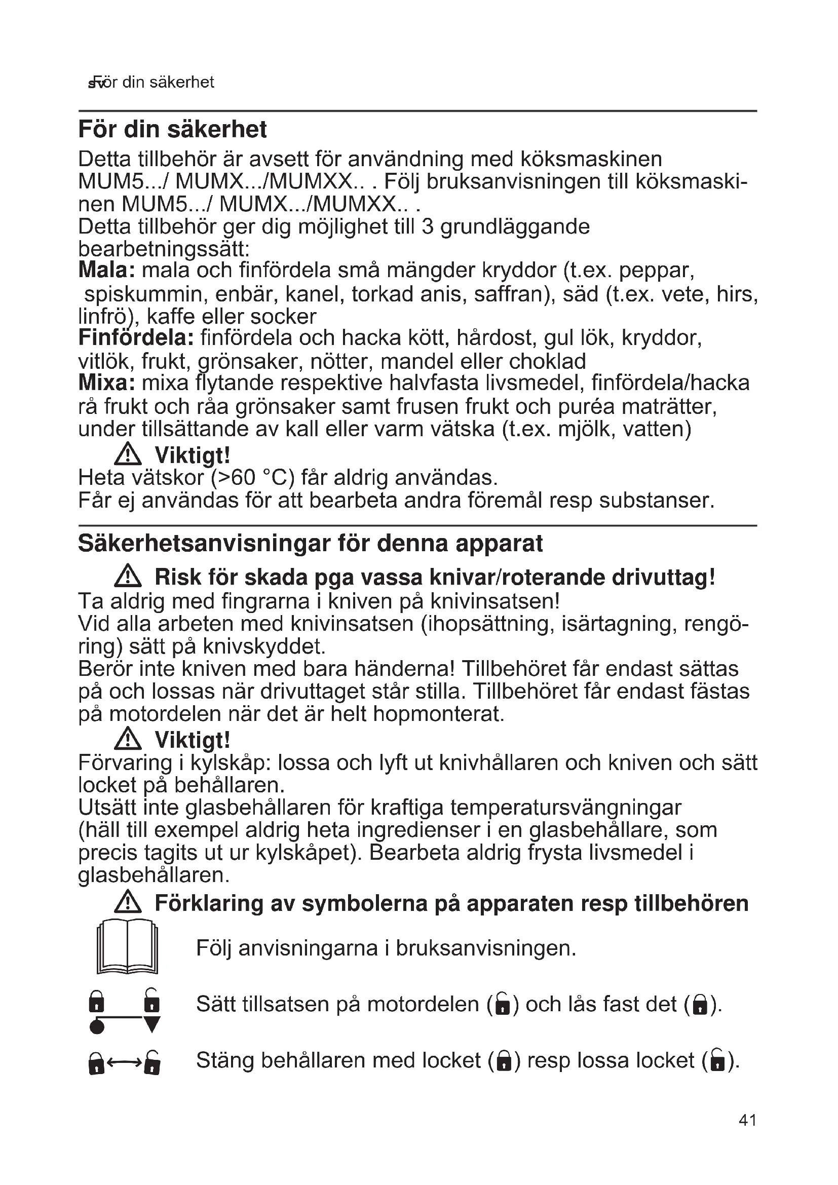 För din säkerhet Detta tillbehör är avsett för användning med köksmaskinen MUM5.../ MUMX.../MUMXX.. . Följ bruksanvisningen till köksmaski nen MUM5.../ MUMX.../MUMXX.. . Detta tillbehör ger dig möjlighet till 3 grundläggande bearbetningssätt: Mala: mala och nfördela små mängder kryddor (t.ex. peppar, spiskummin, enbär, kanel, torkad anis, saffran), säd (t.ex. vete, hirs, linfrö), kaffe eller socker Finfördela: nfördela och hacka kött, hårdost, gul lök, kryddor, vitlök, frukt, grönsaker, nötter, mandel eller choklad Mixa: mixa ytande respektive halvfasta livsmedel, nfördela/hacka rå frukt och råa grönsaker samt frusen frukt och puréa maträtter, under tillsättande av kall eller varm vätska (t.ex. mjölk, vatten) W Viktigt! Heta vätskor (>60 °C) får aldrig användas. Får ej användas för att bearbeta andra föremål resp substanser. Säkerhetsanvisningar för denna apparat W Risk för skada pga vassa knivar/roterande drivuttag! Ta aldrig med ngrarna i kniven på knivinsatsen! Vid alla arbeten med knivinsatsen (ihopsättning, isärtagning, rengö ring) sätt på knivskyddet. Berör inte kniven med bara händerna! Tillbehöret får endast sättas på och lossas när drivuttaget står stilla. Tillbehöret får endast fästas på motordelen när det är helt hopmonterat. W Viktigt! Förvaring i kylskåp: lossa och lyft ut knivhållaren och kniven och sätt locket på behållaren. Utsätt inte glasbehållaren för kraftiga temperatursvängningar (häll till exempel aldrig heta ingredienser i en glasbehållare, som precis tagits ut ur kylskåpet). Bearbeta aldrig frysta livsmedel i glasbehållaren. W Förklaring av symbolerna på apparaten resp tillbehören