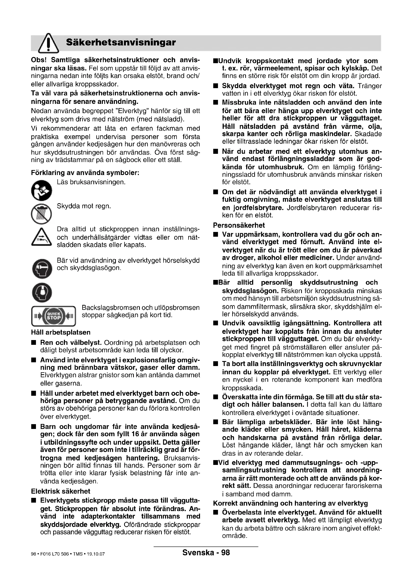 Ret til ændringer forbeholdes Overensstemmelseserklæring F016 L70 506 - Titel.book Seite 97 Dienstag, 23. Oktober 2007 1:28 13 97 • F016 L70 506 • TMS • 19.10.07Svenska - 98 Obs! Samtliga säkerhetsinstruktioner och anvis- ningar ska läsas. Fel som uppstår till följd av att anvis- ningarna nedan inte följts kan orsaka elstöt, brand och/ eller allvarliga kroppsskador. Ta väl vara på säkerhetsinstruktionerna och anvis- ningarna för senare användning. Nedan använda begreppet ”Elverktyg” hänför sig till ett elverktyg som drivs med nätström (med nätsladd). Vi rekommenderar att låta en erfaren fackman med praktiska exempel undervisa personer som första gången använder kedjesågen hur den manövreras och hur skyddsutrustningen bör användas. Öva först såg- ning av trädstammar på en sågbock eller ett ställ. Förklaring av använda symboler: Läs bruksanvisningen. Skydda mot regn. Dra alltid ut stickproppen innan inställnings- och underhållsåtgärder vidtas eller om nät- sladden skadats eller kapats. Bär vid användning av elverktyget hörselskydd och skyddsglasögon. Backslagsbromsen och utlöpsbromsen stoppar sågkedjan på kort tid. Håll arbetsplatsen ■ Ren och välbelyst. Oordning på arbetsplatsen och dåligt belyst arbetsområde kan leda till olyckor. ■ Använd inte elverktyget i explosionsfarlig omgiv- ning med brännbara vätskor, gaser eller damm. Elverktygen alstrar gnistor som kan antända dammet eller gaserna. ■ Håll under arbetet med elverktyget barn och obe- höriga personer på betryggande avstånd. Om du störs av obehöriga personer kan du förlora kontrollen över elverktyget. ■ Barn och ungdomar får inte använda kedjeså- gen; dock får den som fyllt 16 år använda sågen i utbildningssyfte och under uppsikt. Detta gäller även för personer som inte i tillräcklig grad är för- trogna med kedjesågen hantering. Bruksanvis- ningen bör alltid finnas till hands. Personer som är trötta eller inte klarar fysisk belastning får inte an- vända kedjesågen. Elektrisk säkerhet ■ Elverktygets stickpropp måste passa till väggutta- get. Stickproppen får absolut inte förändras. An- vänd inte adapterkontakter tillsammans med skyddsjordade elverktyg. Oförändrade stickproppar och passande vägguttag reducerar risken för elstöt. ■ Undvik kroppskontakt med jordade ytor som t. ex. rör, värmeelement, spisar och kylskåp. Det finns en större risk för elstöt om din kropp är jordad. ■ Skydda elverktyget mot regn och väta. Tränger vatten in i ett elverktyg ökar risken för elstöt. ■ Missbruka inte nätsladden och använd den inte för att bära eller hänga upp elverktyget och inte heller för att dra stickproppen ur vägguttaget. Håll nätsladden på avstånd från värme, olja, skarpa kanter och rörliga maskindelar. Skadade eller tilltrasslade ledningar ökar risken för elstöt. ■ När du arbetar med ett elverktyg utomhus an- vänd endast förlängningssladdar som är god- kända för utomhusbruk. Om en lämplig förläng- ningssladd för utomhusbruk används minskar risken för elstöt. ■ Om det är nödvändigt att använda elverktyget i fuktig omgivning, måste elverktyget anslutas till en jordfelsbrytare. Jordfelsbrytaren reducerar ris- ken för en elstöt. Personsäkerhet ■ Var uppmärksam, kontrollera vad du gör och an- vänd elverktyget med förnuft. Använd inte el- verktyget när du är trött eller om du är påverkad av droger, alkohol eller mediciner. Under använd- ning av elverktyg kan även en kort ouppmärksamhet leda till allvarliga kroppsskador. ■ Bär alltid personlig skyddsutrustning och skyddsglasögon. Risken för kroppsskada minskas om med hänsyn till arbetsmiljön skyddsutrustning så- som dammfiltermask, slirsäkra skor, skyddshjälm el- ler hörselskydd används. ■ Undvik oavsiktlig igångsättning. Kontrollera att elverktyget har kopplats från innan du ansluter stickproppen till vägguttaget. Om du bär elverkty- get med fingret på strömställaren eller ansluter på- kopplat elverktyg till nätströmmen kan olycka uppstå. ■ Ta bort alla inställningsverktyg och skruvnycklar innan du kopplar på elverktyget. Ett verktyg eller en nyckel i en roterande komponent kan medföra kroppsskada. ■ Överskatta inte din förmåga. Se till att du står sta- digt och håller balansen. I detta fall kan du lättare kontrollera elverktyget i oväntade situationer. ■ Bär lämpliga arbetskläder. Bär inte löst häng- ande kläder eller smycken. Håll håret, kläderna och handskarna på avstånd från rörliga delar. Löst hängande kläder, långt hår och smycken kan dras in av roterande delar. ■ Vid elverktyg med dammutsugnings- och -upp- samlingsutrustning kontrollera att anordning- arna är rätt monterade och att de används på kor- rekt sätt. Dessa anordningar reducerar faroriskerna i samband med damm. Korrekt användning och hantering av elverktyg ■ Överbelasta inte elverktyget. Använd för aktuellt arbete avsett elverktyg. Med ett lämpligt elverktyg kan du arbeta bättre och säkrare inom angivet effekt- område. Säkerhetsanvisningar F016 L70 506 - Titel.book Seite 98 Dienstag, 23. Oktober 2007 1:28 13 98 • F016 L70 506 • TMS • 19.10.07Svenska - 99 ■ Ett elverktyg med defekt strömställare får inte längre användas. Ett elverktyg som inte kan kopp- las in eller ur är farligt och måste repareras. ■ Dra stickproppen ur vägguttaget innan inställ- ningar utförs, tillbehörsdelar byts ut eller elverk- tyget lagras. Denna skyddsåtgärd förhindrar oav- siktlig inkoppling av elverktyget. ■ Förvara elverktygen oåtkomliga för barn. Låt el- verktyget inte användas av personer som inte är förtrogna med dess användning eller inte läst denna anvisning. Elverktygen är farliga om de an- vänds av oerfarna personer. ■ Sköt elverktyget omsorgsfullt. Kontrollera att rörliga komponenter fungerar felfritt och inte kär- var, att komponente