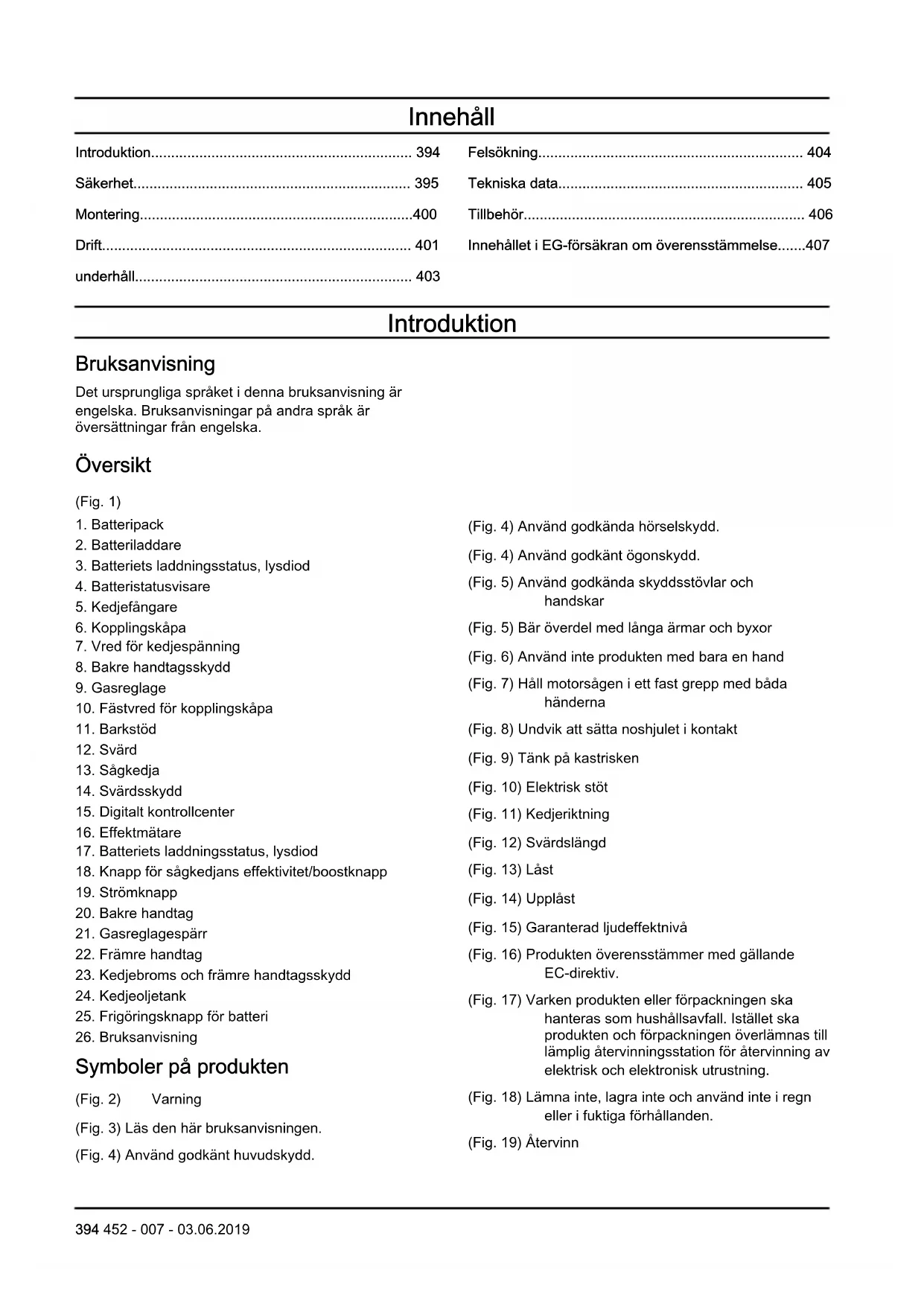 Symboler på produkten (Fig. 2) Varning (Fig. 3) Läs den här bruksanvisningen. (Fig. 4) Använd godkänt huvudskydd. (Fig. 4) Använd godkända hörselskydd. (Fig. 4) Använd godkänt ögonskydd. (Fig. 5) Använd godkända skyddsstövlar och handskar (Fig. 5) Bär överdel med långa ärmar och byxor (Fig. 6) Använd inte produkten med bara en hand (Fig. 7) Håll motorsågen i ett fast grepp med båda händerna (Fig. 8) Undvik att sätta noshjulet i kontakt (Fig. 9) Tänk på kastrisken (Fig. 10) Elektrisk stöt (Fig. 11) Kedjeriktning (Fig. 12) Svärdslängd (Fig. 13) Låst (Fig. 14) Upplåst (Fig. 15) Garanterad ljudeffektnivå (Fig. 16) Produkten överensstämmer med gällande EC-direktiv. (Fig. 17) Varken produkten eller förpackningen ska hanteras som hushållsavfall. Istället ska produkten och förpackningen överlämnas till lämplig återvinningsstation för återvinning av elektrisk och elektronisk utrustning. (Fig. 18) Lämna inte, lagra inte och använd inte i regn eller i fuktiga förhållanden. (Fig. 19) Återvinn 394 452 - 007 - 03.06.2019Notera: Övriga symboler/dekaler på produkten avser specifika krav för certifieringar på andra kommersiella marknader. Produktansvar Enligt lagstiftningen för produktansvar ansvarar vi inte för skador som vår produkt orsakar om: