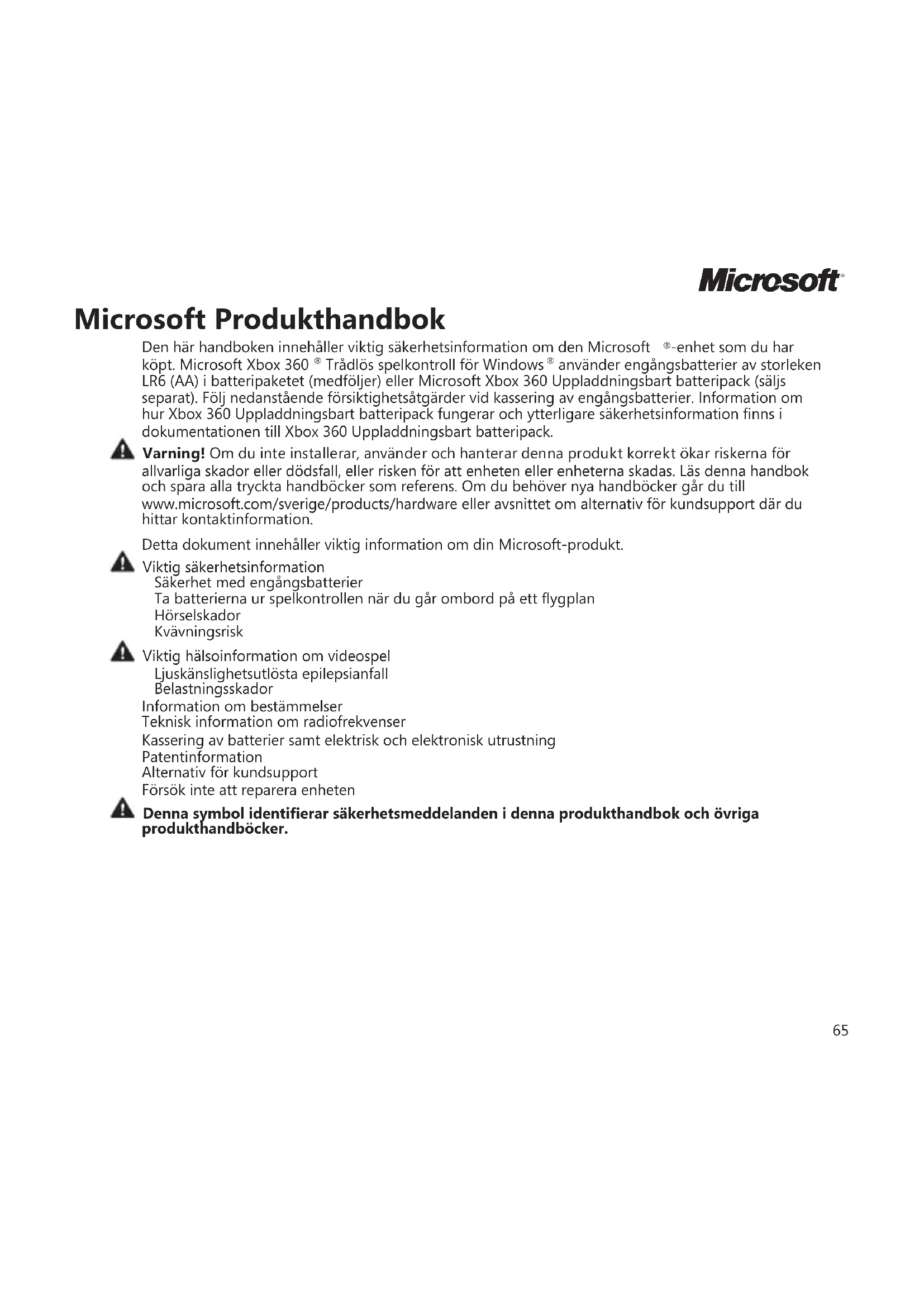 använder engångsbatterier av storleken LR6 (AA) i batteripaketet (medföljer) eller Microsoft Xbox 360 Uppladdningsbart batteripack (säljs separat). Följ nedanstående försiktighetsåtgärder vid kassering av engångsbatterier. Information om hur Xbox 360 Uppladdningsbart batteripack fungerar och ytterligare säkerhetsinformation nns i dokumentationen till Xbox 360 Uppladdningsbart batteripack. Varning! Om du inte installerar, använder och hanterar denna produkt korrekt ökar riskerna för allvarliga skador eller dödsfall, eller risken för att enheten eller enheterna skadas. Läs denna handbok och spara alla tryckta handböcker som referens. Om du behöver nya handböcker går du till www.microsoft.com/sverige/products/hardware eller avsnittet om alternativ för kundsupport där du hittar kontaktinformation. Detta dokument innehåller viktig information om din Microsoft-produkt. Viktig säkerhetsinformation Säkerhet med engångsbatterier Ta batterierna ur spelkontrollen när du går ombord på ett ygplan Hörselskador Kvävningsrisk Viktig hälsoinformation om videospel Ljuskänslighetsutlösta epilepsianfall Belastningsskador Information om bestämmelser Teknisk information om radiofrekvenser Kassering av batterier samt elektrisk och elektronisk utrustning Patentinformation Alternativ för kundsupport Försök inte att reparera enheten Denna symbol identierar säkerhetsmeddelanden i denna produkthandbok och övriga produkthandböcker.