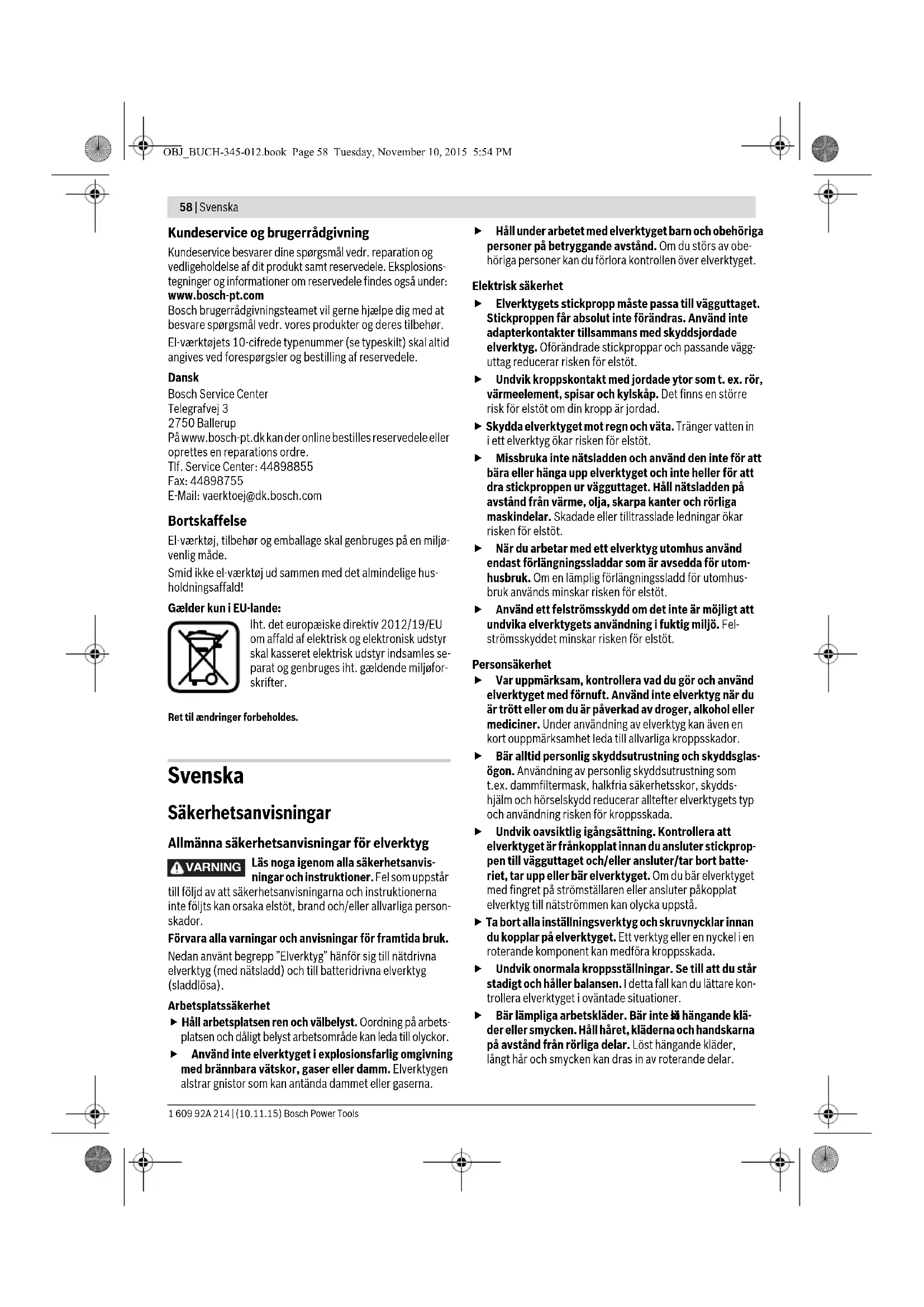 OBJ_BUCH-345-012.book Page 56 Tuesday, November 10, 2015 5:54 PMDansk | 57 Bosch Power Tools 1 609 92A 214 | (10.11.15) Støvsugeren skal være egnet til det materiale, som skal op- suges. Anvend en specialstøvsuger til opsugning af særligt sund- hedsfarligt, kræftfremkaldende eller tørt støv. Støvopsugningen 16 tages af ved at dreje fastgørelsesskruen 15 i position og trække støvopsugningen af el-værktøjets gearhoved. Brug Ibrugtagning Kontrollér netspændingen! Strømkildens spænding skal stemme overens med angivelserne på el-værktøjets type- skilt. Tænd/sluk El-værktøjet tændes ved at skubbe start-stop-kontakten 1 frem, så „I“ fremkommer på kontakten. El-værktøjet slukkes ved at skubbe start-stop-kontakten 1 tilbage, så „0“ fremkommer på kontakten. For at spare på energien bør du kun tænde for el-værktøjet, når du bruger det. Indstilling af svingtal Med stillehjulet indstilling af svingtal 2 kan du indstille det nødvendige svingtal under driften. Det krævede svingtal afhænger af arbejdsmaterialet og ar- bejdsbetingelserne; det fastlægges bedst ved praktiske forsøg. Til savning i samt gennemsavning og slibning af hårde materi- aler som f.eks. træ eller metal anbefales det at bruge svingtal- trinnene „6“, til bløde materialer som f.eks. kunststof sving- taltrinnet „4“. Arbejdsvejledning El-værktøjet må først lægges fra, når det står helt stille. Træk stikket ud af stikkontakten, før der udføres ar- bejde på el-værktøjet. Bemærk: Sørg for, at ventilationsåbningerne 3 på el-værktø- jet ikke tildækkes under arbejdet, da el-værktøjets levetid ellers forringes. Sørg for, at værktøjets belægning er ubeskadiget, når der arbejdes med HCS-værktøj. Arbejdsprincip Det oscillerende drev sætter indsatsværktøjet i svingninger – op til 21000 gange/minuttet med 2,8° frem og tilbage. Det muliggør præcist arbejde i et lille område. Arbejd med lavt og jævnt modtryk, da ar- bejdsydelsen ellers forringes, og indsats- værktøjet kan blokere. Bevægel-værktøjet frem og tilbage under arbejdet, så indsatsværktøjet ikke opvar- mes alt for meget og ikke blokerer. Savning Anvend kun ubeskadigede, fejlfrie savklinger. Bøjede eller uskarpe savklinger kan brække, påvirke snittet nega- tivt eller føre til tilbageslag. Gældende lovbestemmelser og anbefalinger fra mate- rialefabrikanterne skal overholdes, når der saves i let- te byggematerialer. Ved dyksavning må der kun bearbejdes bløde materia- ler som f.eks. træ, gipskarton el.lign.! Kontrollér før savning med HCS-savklinger i træ, spånplader, byggematerialer osv. disse for fremmedlegemer som f.eks. søm, skruer o.lign. Fjern fremmedlegemerne i givet fald eller anvend bi-metal-savklinger. Gennemskære Bemærk: Vær ved gennemskæring af vægfliser opmærksom på, at værktøjet slides hurtigt, hvis det anvendes i længere tid. Slibe Afslibningsarbejdet og slibebilledet bestemmes især af det valgte slibeblad, det valgte svingtaltrin og det tryk, som bru- geren udøver på maskinen. Kun fejlfrie slibeblade sikrer et godt sliberesultat og skåner el-værktøjet. Sørg for jævnt slibetryk, da dette er med til at forlænge slibe- bladenes levetid. Et overdrevet tryk fører ikke til en større slibekapacitet, men derimod til et større slid af el-værktøj og slibepapir. Til punktnøjagtig slibning af hjørner, kanter og vanskeligt til- gængelige områder kan man også bare bruge spidsen eller en af slibesålens kanter. Slibebladet kan opvarmes stærkt ved punktuelt slibearbejde. Reducer svingtal og modtryk og lad slibebladet afkøle med re- gelmæssige mellemrum. Anvend ikke et slibeblad, der forinden har været brug til slib- ning af metal, til andre materialer. Anvend kun originalt Bosch slibetilbehør. Tilslut altid en støvopsugning til slibning. Skrabning Vælg et højt svingtaltrin til skrabning. Arbejd på blød undergrund (f.eks. træ) i en flad vinkel og med et lille modtryk. Ellers kan spartlen skære ned i undergrunden. Vedligeholdelse og service Vedligeholdelse og rengøring Træk stikket ud af stikkontakten, før der udføres arbej- de på el-værktøjet. El-værktøj og el-værktøjets ventilationsåbninger skal altid holdes rene for at sikre et godt og sikkert arbejde. Rengør riff-indsatsværktøj (tilbehør) med en trådbørste med regelmæssige mellemrum. Hvis det er nødvendigt at erstatte tilslutningsledningen, skal dette arbejde udføres af Bosch eller på et autoriseret service- værksted for Bosch el-værktøj for at undgå farer. OBJ_BUCH-345-012.book Page 57 Tuesday, November 10, 2015 5:54 PM58 | Svenska 1 609 92A 214 | (10.11.15) Bosch Power Tools Kundeservice og brugerrådgivning Kundeservice besvarer dine spørgsmål vedr. reparation og vedligeholdelse af dit produkt samt reservedele. Eksplosions- tegninger og informationer om reservedele findes også under: www.bosch-pt.com Bosch brugerrådgivningsteamet vil gerne hjælpe dig med at besvare spørgsmål vedr. vores produkter og deres tilbehør. El-værktøjets 10-cifrede typenummer (se typeskilt) skal altid angives ved forespørgsler og bestilling af reservedele. Dansk Bosch Service Center Telegrafvej 3 2750 Ballerup På www.bosch-pt.dk kan der online bestilles reservedele eller oprettes en reparations ordre. Tlf. Service Center: 44898855 Fax: 44898755 E-Mail: vaerktoej@dk.bosch.com Bortskaffelse El-værktøj, tilbehør og emballage skal genbruges på en miljø- venlig måde. Smid ikke el-værktøj ud sammen med det almindelige hus- holdningsaffald! Gælder kun i EU-lande: Iht. det europæiske direktiv 2012/19/EU om affald af elektrisk og elektronisk udstyr skal kasseret elektrisk udstyr indsamles se- parat og genbruges iht. gældende miljøfor- skrifter. Ret til ændringer forbeholdes. Svenska Säkerhetsanvisningar Allmänna säkerhetsanvisningar för elverktyg Läs noga igenom alla säkerhetsanvis- ningar och instruktioner. Fel som uppstår till följd av att säkerhetsanvisnin