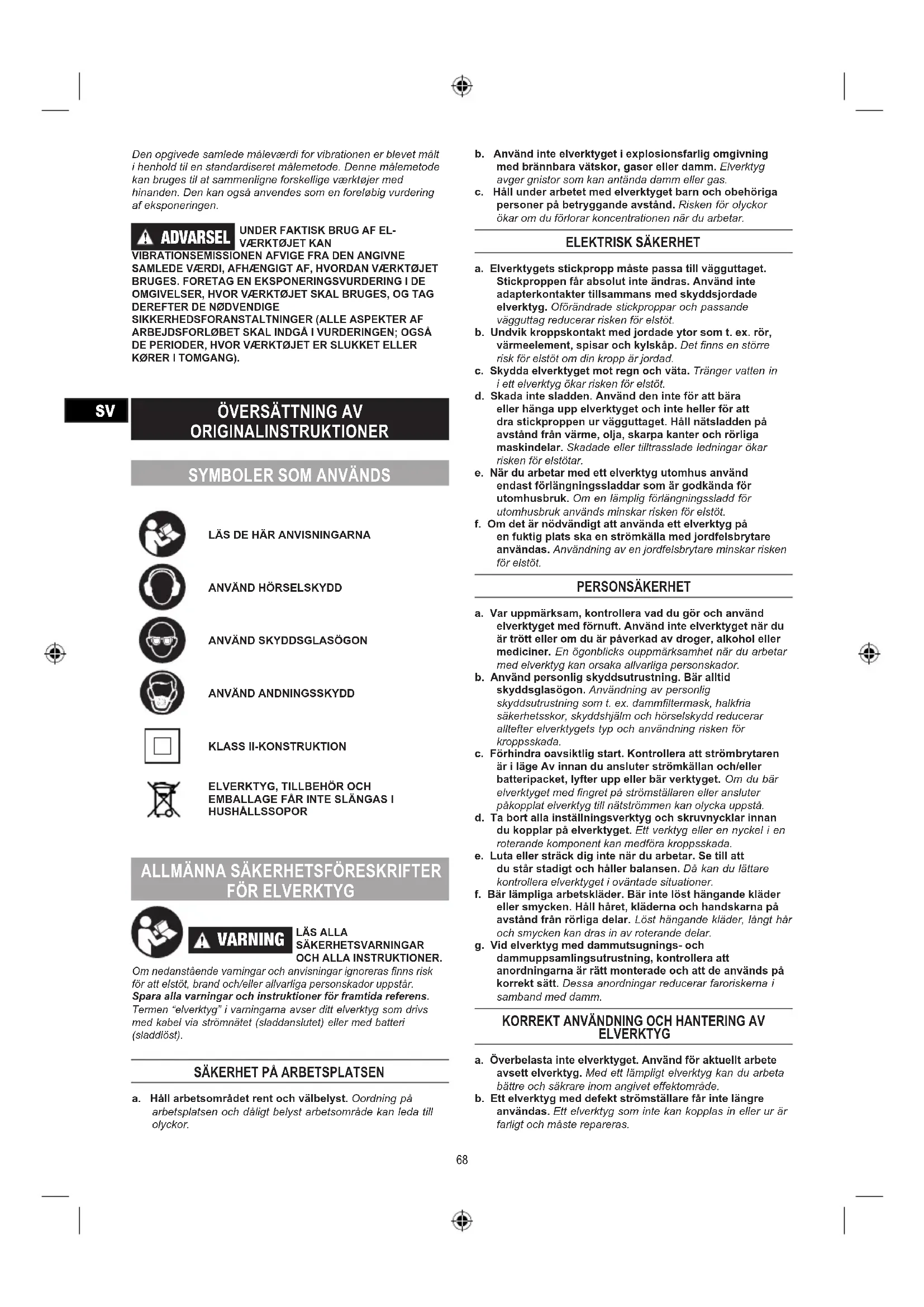 a. Elverktygets stickpropp måste passa till vägguttaget. Stickproppen får absolut inte ändras. Använd inte adapterkontakter tillsammans med skyddsjordade elverktyg. Oförändrade stickproppar och passande vägguttag reducerar risken för elstöt. b. Undvik kroppskontakt med jordade ytor som t. ex. rör, värmeelement, spisar och kylskåp. Det nns en större risk för elstöt om din kropp är jordad. c. Skydda elverktyget mot regn och väta. Tränger vatten in i ett elverktyg ökar risken för elstöt. d. Skada inte sladden. Använd den inte för att bära eller hänga upp elverktyget och inte heller för att dra stickproppen ur vägguttaget. Håll nätsladden på avstånd från värme, olja, skarpa kanter och rörliga maskindelar. Skadade eller tilltrasslade ledningar ökar risken för elstötar. e. När du arbetar med ett elverktyg utomhus använd endast förlängningssladdar som är godkända för utomhusbruk. Om en lämplig förlängningssladd för utomhusbruk används minskar risken för elstöt. f. Om det är nödvändigt att använda ett elverktyg på en fuktig plats ska en strömkälla med jordfelsbrytare användas. Användning av en jordfelsbrytare minskar risken för elstöt. PERSONSÄKERHET a. Var uppmärksam, kontrollera vad du gör och använd elverktyget med förnuft. Använd inte elverktyget när du är trött eller om du är påverkad av droger, alkohol eller mediciner. En ögonblicks ouppmärksamhet när du arbetar med elverktyg kan orsaka allvarliga personskador. b. Använd personlig skyddsutrustning. Bär alltid skyddsglasögon. Användning av personlig skyddsutrustning som t. ex. dammltermask, halkfria säkerhetsskor, skyddshjälm och hörselskydd reducerar alltefter elverktygets typ och användning risken för kroppsskada. c. Förhindra oavsiktlig start. Kontrollera att strömbrytaren är i läge Av innan du ansluter strömkällan och/eller batteripacket, lyfter upp eller bär verktyget. Om du bär elverktyget med ngret på strömställaren eller ansluter påkopplat elverktyg till nätströmmen kan olycka uppstå. d. Ta bort alla inställningsverktyg och skruvnycklar innan du kopplar på elverktyget. Ett verktyg eller en nyckel i en roterande komponent kan medföra kroppsskada. e. Luta eller sträck dig inte när du arbetar. Se till att du står stadigt och håller balansen. Då kan du lättare kontrollera elverktyget i oväntade situationer. f. Bär lämpliga arbetskläder. Bär inte löst hängande kläder eller smycken. Håll håret, kläderna och handskarna på avstånd från rörliga delar. Löst hängande kläder, långt hår och smycken kan dras in av roterande delar. g. Vid elverktyg med dammutsugnings- och dammuppsamlingsutrustning, kontrollera att anordningarna är rätt monterade och att de används på korrekt sätt. Dessa anordningar reducerar faroriskerna i samband med damm.