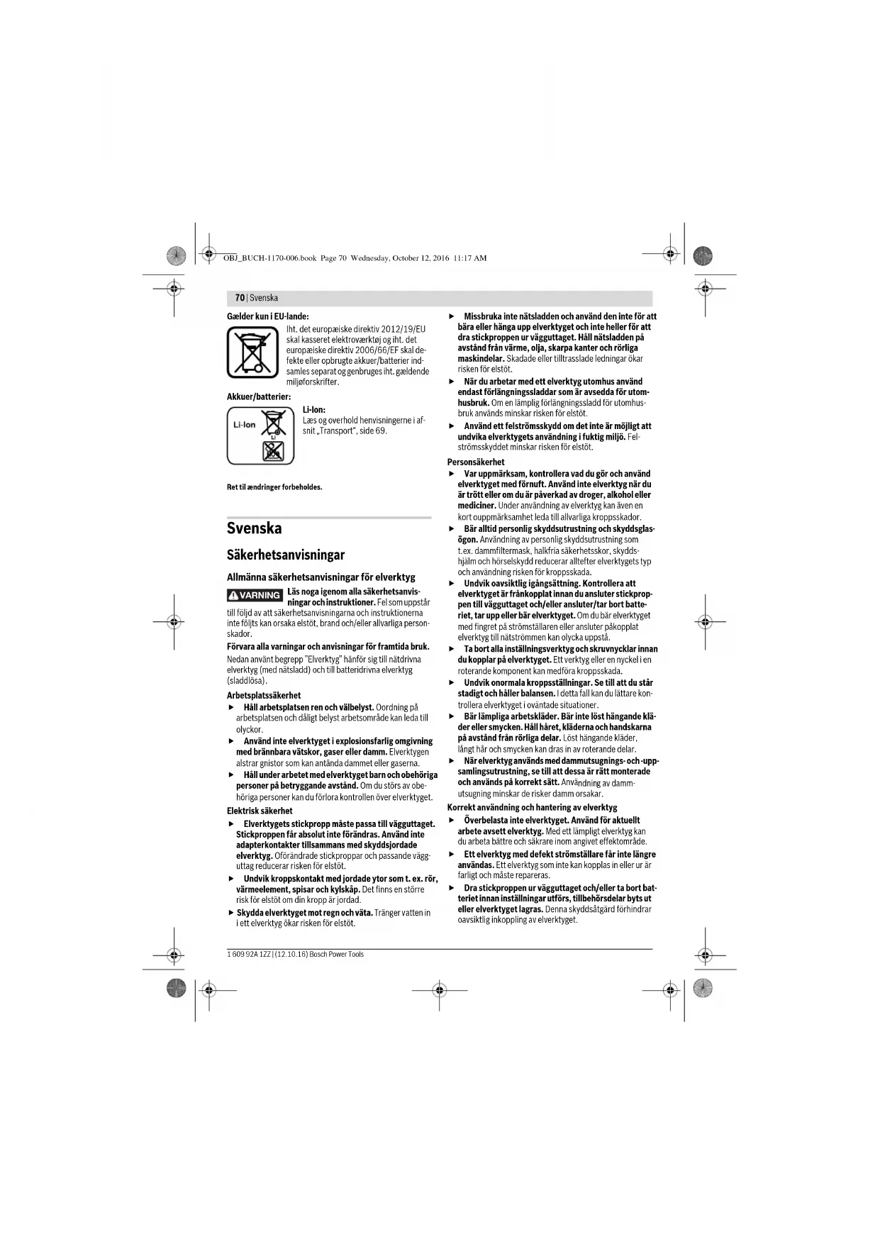 - Begränsad effekt vid temperaturer <0 °C Henk Becker Executive Vice President Engineering Helmut Heinzelmann Head of Product Certification PT/ECS OBJ_BUCH-1170-006.book Page 72 Wednesday, October 12, 2016 11:17 AMSvenska | 73 Bosch Power Tools 1 609 92A 1ZZ | (12.10.16) Batteriets laddningsindikering Batteriladdningsindikatorn 4 signalerar vid påslaget elverktyg den batterikapacitet som ännu finns att tillgå och vid eventuell överbelastning av verktyget. Blinkar batteriladdningsindikatorn 4 med rött ljus är elverk- tyget överbelastat. Beakta anvisningarna i avsnittet ”Tempe- raturberoende överbelastningsskydd”, sidan 76. Verktygsbyte Ta bort batteriet innan åtgärder utförs på elverktyget samt före transport och lagring. Om strömställaren Till/Från oavsiktligt påverkas finns risk för personskada. Använd skyddshandskar vid verktygsbyte. Risk finns för kroppsskada om insatsverktyg berörs. Val av insatsverktyg Tabellen nedan tar upp exempel på insatsverktyg. Ytterligare insatsverktyg finns i Bosch omfångsrika tillbehörsprogram. Indikering Kapacitet Kontinuerligt grönt ljus >70 % Kontinuerligt gult ljus 30–70 % Kontinuerligt rött ljus <30 % Insatsverktyg Material Användning Bimetall segment- sågklinga Trävirke, plast, ickejärn- metall Kap- och insågssnitt; även för sågning invid kanter, i hörn och på svårtillgängliga platser; exempel: avkortning av monterade golvlister eller dörrkar- mar, insågning vid passning av golvpaneler Slipplatta för slip- papper Serie Delta 93 mm Beroende på slippappret Ytslipning av ränder, i hörn eller på svåråtkomliga ställen; alltefter slippapper t.ex. för slipning av trä, färg, sten Sågblad i kolstål för trä Trävirke, mjuk plast Kapning och djupa instickssnitt; även för sågning nära kant, i hörn och på svåråtkomliga ställen; exempel: smalt instickssnitt i massivt trä för montering av ett ventilationsgaller Sågblad i kolstål för trä Trävirke, mjuk plast Mindre kap- eller insågssnitt; exempel: urtag i möbler för kabelanslutningar Bimetallsågblad för metall Metall (t.ex. icke härdade spikar, skruvar, klena pro- filer), icke-järnmetaller Mindre kap- eller insågssnitt; exempel: avkortning av profiler, kapning av fästelement såsom klämmor Räfflad segment- sågklinga i hårdme- tall Cementfogar, mjuka vägg- plattor, glasfiberarmerad plast och andra nötande material Skärning och kapning invid kanter, i hörn och på svårtill- gängliga platser; exempel: rengöring av fogar mellan väggplattor efter för- bättringar, sågning av urtag i stenplattor, gipsplattor eller plast HM-riff-deltaplatta Cementbruk, betongres- ter, trä, abrasivt material Raspning och slipning på hård undergrund; exempel: borttagning av cementbruk och kakellim (t.ex. vid ersättning av skadade kakel) Räfflad cement- bruksskrapa i hård- metall För borttagning av cementbruk, fogar, epoxi- plast, glasfiberarmerad plast och andra nötande material Vägg- och golvkakelfogar samt cementbruk och foglim (även i rätvinkliga hörn) Skavkniv, styv Mattor, golvbeläggning Skavning på hård undergrund; exempel: borttagning av matt- och kakellim OBJ_BUCH-1170-006.book Page 73 Wednesday, October 12, 2016 11:17 AM74 | Svenska 1 609 92A 1ZZ | (12.10.16) Bosch Power Tools Montering/byte av insatsverktyg Ta vid behov bort eventuellt monterat insatsverktyg. Ta bort insatsverktyget genom att lossa skruven 10 med sex- kantnyckeln 11 och sedan ta loss verktyget. Placera insatsverktyget (t.ex. ett sågblad 9) på verktygsfästet 7 så att verktygets urtag hakar i verktygsfästets kammar. Insatsverktyget kan placeras i valfritt spärrläge på verktygs- fäste för en säker och vilsam arbetsställning. Placera verkty- get så att gapet är riktat nedåt (verktygsbeteckningen kan läsas ovanifrån, som bilden på grafiksidan visar). Montera insatsverktyget med skruven 10. Dra år skruven 10 stadigt med sexkantnyckel 11. Kontrollera att insatsverktyget sitter stadigt. Felaktigt eller dåligt fastsatta insatsverktyg kan lossa under arbetet och leda till personskada. Montering/byte av slippapper på slipplattan Slipplattan 12 är försedd med en kardborrsväv för snabb och enkel infästning av slippapperen med kardborrssystem. Knacka slipplattans 12 kardborrsväv ren innan slippapperet 13 sätts på för att uppnå optimal infästning. Lägg upp slippapperet 13 kant i kant med en sida på slipplat- tan 12, tryck sedan kraftigt fast slippapperet på slipplattan. För att optimal dammutsugning ska kunna garanteras måste slippapperets hål överensstämma med slipplattans. För borttagning av slippapperet 13 grip tag i ett hör och dra av papperet från slipplattan 12. Alla typer av slippapper, poler- och rengöringsfilt i Serie Delta 93 mm i Bosch tillbehörsprogram kan användas. Sliptillbehör som fiber/polerfilt placeras på samma sätt på slipplattan. Val av slippapper Slippapper finns att tillgå i olika utföranden som motsvarar material som ska bearbetas och önskad nedslipningseffekt: Damm-/spånutsugning Dammet från material som t. ex. blyhaltig målning, vissa träslag, mineraler och metall kan vara hälsovådligt. Berö- ring eller inandning av dammet kan orsaka allergiska reak- tioner och/eller andningsbesvär hos användaren eller per- soner som uppehåller sig i närheten. Vissa damm från ek eller bok anses vara cancerogena, spe- ciellt då i förbindelse med tillsatsämnen för träbehandling (kromat, träkonserveringsmedel). Endast yrkesmän får bearbeta asbesthaltigt material. – Använd om möjligt en för materialet lämplig dammut- sugning. – Se till att arbetsplatsen är väl ventilerad. – Vi rekommenderar ett andningsskydd i filterklass P2. Beakta de föreskrifter som i aktuellt land gäller för bearbetat material. Undvik dammanhopning på arbetsplatsen. Damm kan lätt självantändas. Bimetallkniv med segmentvågsslip- ning Isolationsmaterial, isole- ringsplattor, golvplattor, stegljudsisole