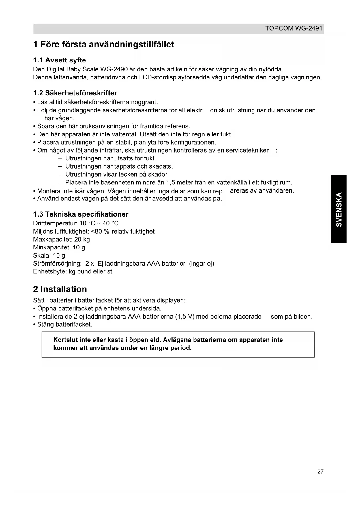 O-Ld Låg ström - Byt batterier Överbelastning. Babyn väger över 20 kg. 6 Rengöring Rengör vågen med en lätt fuktad eller antistatisk trasa. Använd aldrig rengöringsmedel eller slipande lösningsmedel. 7 Avyttra apparaten (miljö) I slutet av livscykeln ska produkten inte kastas i de vanliga hushållssoporna utan lämnas på en avfallsstation för återvinning av elektronisk utrustning. Symbole n på produkten, bruksanvisningen och/eller förpackningen anger detta.29 SVENSKA TOPCOM WG-2491 En del av produktmaterialet kan återanvändas om du tar det till ett återvinningsställe. Genom att återanvända vissa delar eller råmaterial från använda produkter kan du göra en betydande insats för att skydda miljön. Kontakta dina lokala myndigheter för mer information om insamlingsställen i ditt område. Batterierna ska tas bort innan enheten kasseras. Kassera batterierna på ett miljövänligt sätt i enligh et med de bestämmelser som gäller i ditt land. 8 Topcoms garanti
