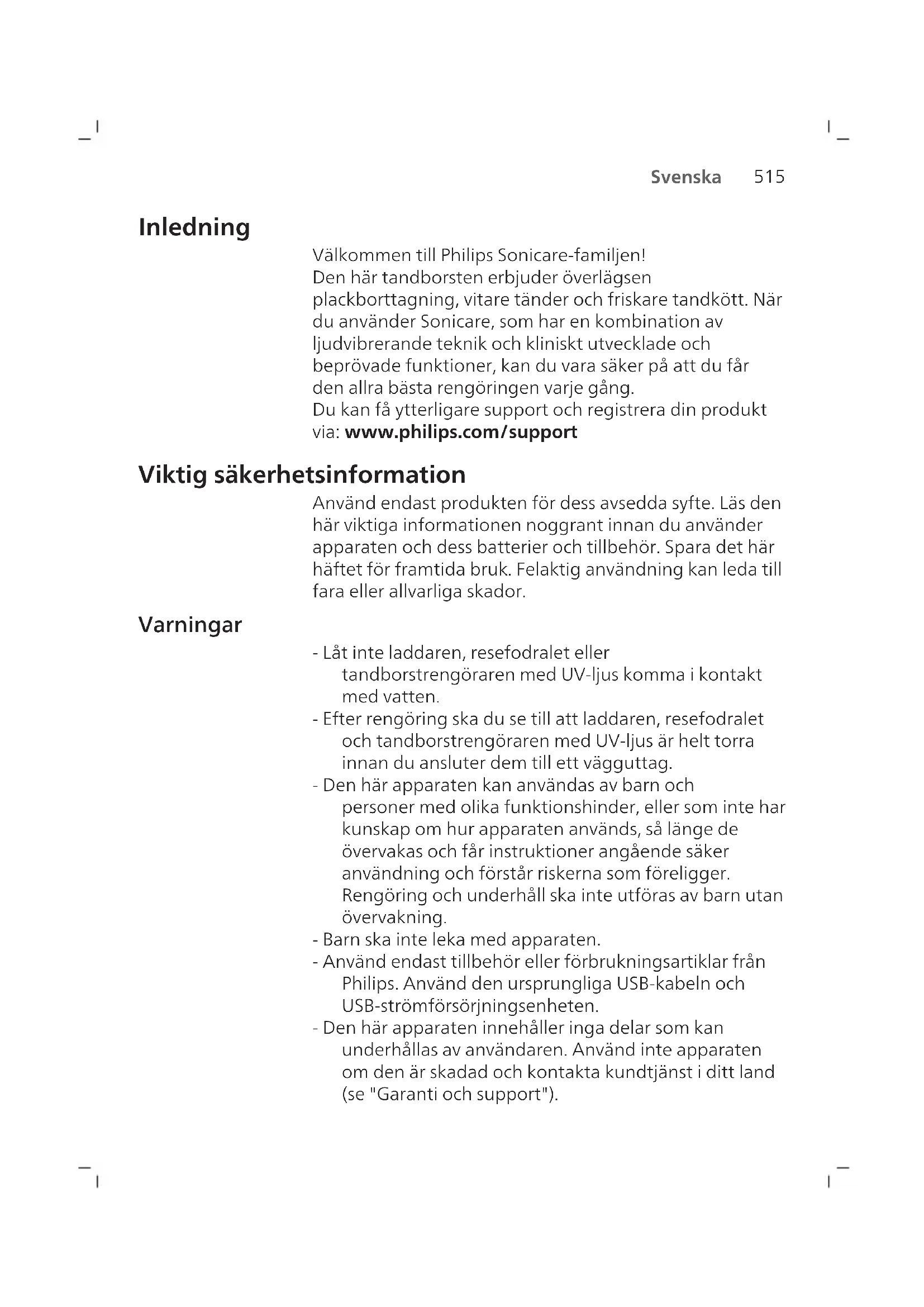 Svenska Inledning Välkommen till Philips Sonicare-familjen! Den här tandborsten erbjuder överlägsen plackborttagning, vitare tänder och friskare tandkött. När du använder Sonicare, som har en kombination av ljudvibrerande teknik och kliniskt utvecklade och beprövade funktioner, kan du vara säker på att du får den allra bästa rengöringen varje gång. Du kan få ytterligare support och registrera din produkt via: www.philips.com/support Viktig säkerhetsinformation Använd endast produkten för dess avsedda syfte. Läs den här viktiga informationen noggrant innan du använder apparaten och dess batterier och tillbehör. Spara det här häftet för framtida bruk. Felaktig användning kan leda till fara eller allvarliga skador. Varningar - Låt inte laddaren, resefodralet eller tandborstrengöraren med UV-ljus komma i kontakt med vatten. - Efter rengöring ska du se till att laddaren, resefodralet och tandborstrengöraren med UV-ljus är helt torra innan du ansluter dem till ett vägguttag. - Den här apparaten kan användas av barn och personer med olika funktionshinder, eller som inte har kunskap om hur apparaten används, så länge de övervakas och får instruktioner angående säker användning och förstår riskerna som föreligger. Rengöring och underhåll ska inte utföras av barn utan övervakning. - Barn ska inte leka med apparaten. - Använd endast tillbehör eller förbrukningsartiklar från Philips. Använd den ursprungliga USB-kabeln och USB-strömförsörjningsenheten. - Den här apparaten innehåller inga delar som kan underhållas av användaren. Använd inte apparaten om den är skadad och kontakta kundtjänst i ditt land (se "Garanti och support").516 Svenska - Använd inte USB-kabeln eller USB- strömförsörjningsenheten om den är skadad. - Använd inte laddaren, resefodralet och/eller tandborstrengöraren med UV-ljus utomhus eller i närheten av uppvärmda ytor. - Rengör inga delar i diskmaskin. - Apparaten har utformats endast för rengöring av tänder, tandkött och tunga. - Förvara alltid tandborstrengöraren med UV-ljus utom räckhåll för barn. - Använd inte tandborstrengöraren med UV-ljus om UV-lysdioden/-lampan fortfarande lyser när tandborstrengöraren är öppen. UV-ljus kan vara skadligt för ögon och hud. - Använd endast tandborstrengöraren med skyddsskärmen på plats. - Rör inte tandborstrengörare med UV-ljus UV-lampa när den är varm. - Sluta använda ett borsthuvud om det har skadade eller böjda strån. Byt ut borsthuvudet var tredje månad eller oftare vid märkbart slitage. - Undvik direkt kontakt med produkter som innehåller eteriska oljor eller kokosolja. Kontakten kan leda till att borsten lossnar. - Maximal höjd över havet vid användning är 4500meter. MEDICINSKA VARNINGAR - Sluta använda apparaten och rådfråga en tandläkare/läkare om kraftig blödning uppstår efter användning, om det fortsätter att blöda efter en veckas användning eller om du upplever obehag eller smärta. - Om du har genomgått operation i munnen eller tandköttet de senaste två månaderna ska du rådgöra med din tandläkare innan du använder apparaten. - Om du har en pacemaker eller någon annan implanterad enhet bör du rådgöra med din läkare eller tillverkaren av den implanterade enheten före användning. - Om du har hälsoproblem bör du rådfråga läkare innan du använder apparaten.517 Svenska - Apparaten är avsedd för egenvård och inte för att användas på flera patienter på en tandläkarmottagning eller -klinik. Säkerhetsföreskrifter för batteri - Denna apparat innehåller batterier som endast får tas bort av fackmän. - Använd endast produkten för dess avsedda syfte. Läs den här informationen noggrant innan du använder produkten och dess batterier och tillbehör, och spara den för framtida bruk. Felaktig användning kan leda till fara eller allvarliga skador. Olika tillbehör kan medfölja olika modeller. - Använd endast tillbehör och förbrukningsartiklar från Philips. Använd endast den löstagbara strömförsörjningsenheten TCBxxxx (ingångsvärden: 100–240V~, 50/60Hz, 1,5W), HX6100 (ingångsvärden: 100–240V~, 50/60Hz, 1,4W), HX6110 (ingångsvärden: 100–240V~, 50/60Hz, 1,5W), HX6160 (ingångsvärden: 100–240V~, 50/60Hz, 6W), WAAxxxx (ingångsvärden: 100–240 V~; 50/60 Hz; 3,5 W). - Utsätt inte produkten eller batterierna för eld och utsätt dem heller inte för direkt solljus eller för höga temperaturer. - Sluta använda och ladda produkten om den blir onormalt varm, luktar, ändrar färg eller om det tar längre tid än vanligt att ladda den. Kontakta även din lokala Philips-återförsäljare. - Placera inte produkten eller batterierna i mikrovågsugnar eller på induktionsplattor. - För att förhindra att batterierna värms upp eller avger giftiga eller farliga ämnen ska du inte öppna, ändra, sticka hål på, skada eller ta isär produkten eller batterierna. Kortslut inte och överladda inte batterierna och ladda inte batterierna med omvänd polaritet. - Den här apparaten har batterier som inte är utbytbara. När batteriet är slut ska apparaten kasseras på rätt sätt, se avsnittet om Återvinning.518 Svenska - Undvik kontakt med huden eller ögonen om batterierna är skadade eller läcker. Skölj omedelbart med rikligt med vatten och kontakta läkare in detta händer. - Se till att händerna, produkten och batterier är torra när du hanterar batterierna. - Ladda och använd produkten vid en temperatur mellan 0 °C och 40 °C. - Låt inte batteriernas poler komma i kontakt med metallföremål (t.ex. mynt, hårspännen eller ringar) efter borttagning för att undvika kortslutning. Slå inte in batterier i aluminiumfolie. Tejpa batteripolerna eller lägg batterierna i en plastpåse innan du kasserar dem. - Apparaten har en uppladdningsbar litiumjoncell. MÅSTE ÅTERVINNAS ELLER KASSERAS PÅ RÄTT SÄTT. Förvarings- och transportförhållanden Temperatur -10 °C till 60 