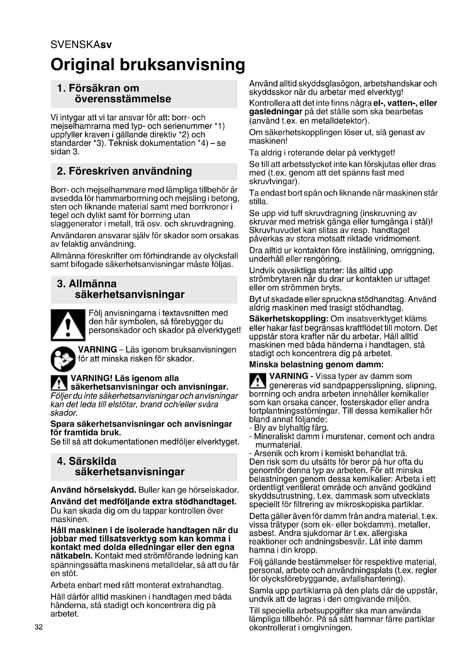 Vi intygar att vi tar ansvar för att: borr- och mejselhamrarna med typ- och serienummer *1) uppfyller kraven i gällande direktiv *2) och standarder *3). Teknisk dokumentation *4) – se sidan 3. Borr- och mejselhammare med lämpliga tillbehör är avsedda för hammarborrning och mejsling i betong, sten och liknande material samt med borrkronor i tegel och dylikt samt för borrning utan slaggenerator i metall, trä osv. och skruvdragning. Användaren ansvarar själv för skador som orsakas av felaktig användning. Allmänna föreskrifter om förhindrande av olycksfall samt bifogade säkerhetsanvisningar måste följas. Följ anvisningarna i textavsnitten med den här symbolen, så förebygger du personskador och skador på elverktyget! VARNING – Läs igenom bruksanvisningen för att minska risken för skador. VARNING! Läs igenom alla säkerhetsanvisningar och anvisningar. Följer du inte säkerhetsanvisningar och anvisningar kan det leda till elstötar, brand och/eller svåra skador. Spara säkerhetsanvisningar och anvisningar för framtida bruk. Se till så att dokumentationen medföljer elverktyget. Använd hörselskydd. Buller kan ge hörselskador. Använd det medföljande extra stödhandtaget. Du kan skada dig om du tappar kontrollen över maskinen. Håll maskinen i de isolerade handtagen när du jobbar med tillsatsverktyg som kan komma i kontakt med dolda elledningar eller den egna nätkabeln. Kontakt med strömförande ledning kan spänningssätta maskinens metalldelar, så att du får en stöt. Arbeta enbart med rätt monterat extrahandtag. Håll därför alltid maskinen i handtagen med båda händerna, stå stadigt och koncentrera dig på arbetet. Använd alltid skyddsglasögon, arbetshandskar och skyddsskor när du arbetar med elverktyg! Kontrollera att det inte finns några el-, vatten-, eller gasledningar på det ställe som ska bearbetas (använd t.ex. en metalldetektor). Om säkerhetskopplingen löser ut, slå genast av maskinen! Ta aldrig i roterande delar på verktyget! Se till att arbetsstycket inte kan förskjutas eller dras med (t.ex. genom att det spänns fast med skruvtvingar). Ta endast bort spån och liknande när maskinen står stilla. Se upp vid tuff skruvdragning (inskruvning av skruvar med metrisk gänga eller tumgänga i stål)! Skruvhuvudet kan slitas av resp. handtaget påverkas av stora motsatt riktade vridmoment. Dra alltid ur kontakten före inställning, omriggning, underhåll eller rengöring. Undvik oavsiktliga starter: lås alltid upp strömbrytaren när du drar ur kontakten ur uttaget eller om strömmen bryts. Byt ut skadade eller spruckna stödhandtag. Använd aldrig maskinen med trasigt stödhandtag. Säkerhetskoppling: Om insatsverktyget kläms eller hakar fast begränsas kraftflödet till motorn. Det uppstår stora krafter när du arbetar. Håll alltid maskinen med båda händerna i handtagen, stå stadigt och koncentrera dig på arbetet. Minska belastning genom damm: VARNING - Vissa typer av damm som genereras vid sandpappersslipning, slipning, borrning och andra arbeten innehåller kemikalier som kan orsaka cancer, fosterskador eller andra fortplantningsstörningar. Till dessa kemikalier hör bland annat följande: - Bly av blyhaltig färg. - Mineraliskt damm i murstenar, cement och andra murmaterial. - Arsenik och krom i kemiskt behandlat trä. Den risk som du utsätts för beror på hur ofta du genomför denna typ av arbeten. För att minska belastningen genom dessa kemikalier: Arbeta i ett ordentligt ventilerat område och använd godkänd skyddsutrustning, t.ex. dammask som utvecklats speciellt för filtrering av mikroskopiska partiklar. Detta gäller även för damm från andra material, t.ex. vissa trätyper (som ek- eller bokdamm), metaller, asbest. Andra sjukdomar är t.ex. allergiska reaktioner och andningsbesvär. Låt inte damm hamna i din kropp. Följ gällande bestämmelser för respektive material, personal, arbete och användningsplats (t.ex. regler för olycksförebyggande, avfallshantering). Samla upp partiklarna på den plats där de uppstår, undvik att de lagras i den omgivande miljön. Till speciella arbetsuppgifter ska man använda lämpliga tillbehör. På så sätt hamnar färre partiklar okontrollerat i omgivningen. Original bruksanvisning