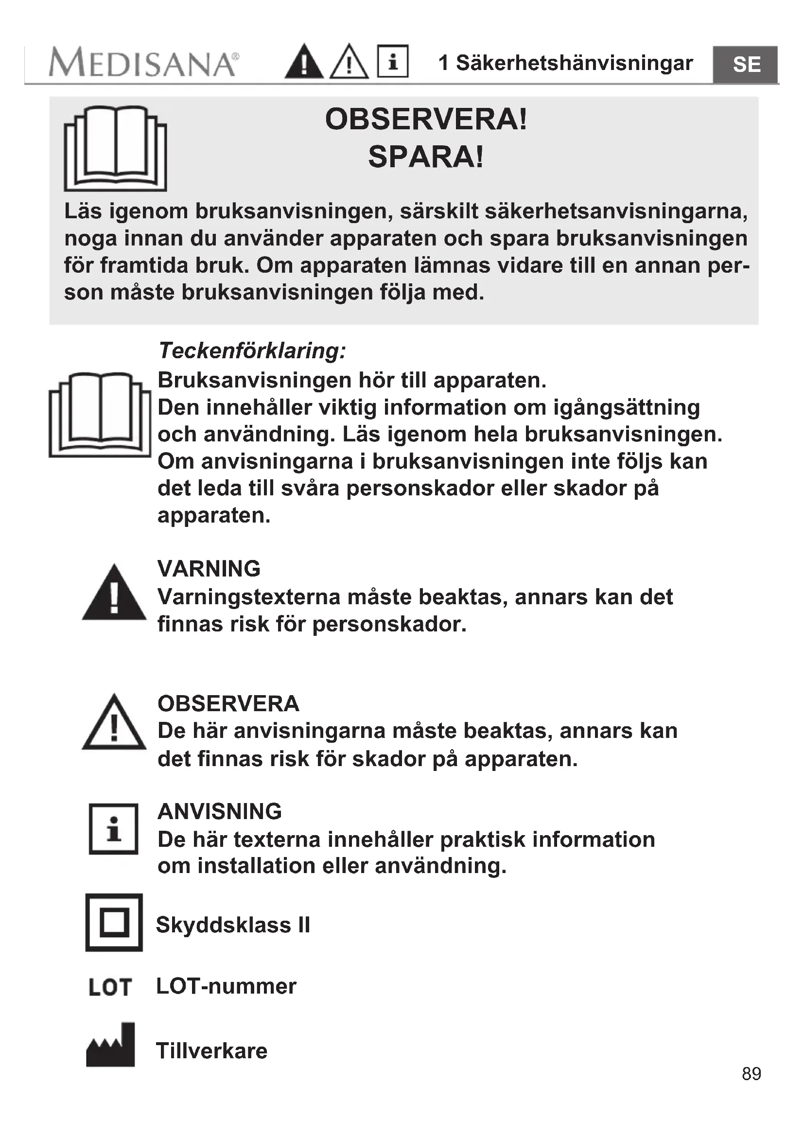 Tillverkare Skyddsklass II90 1 Säkerhetshänvisningar