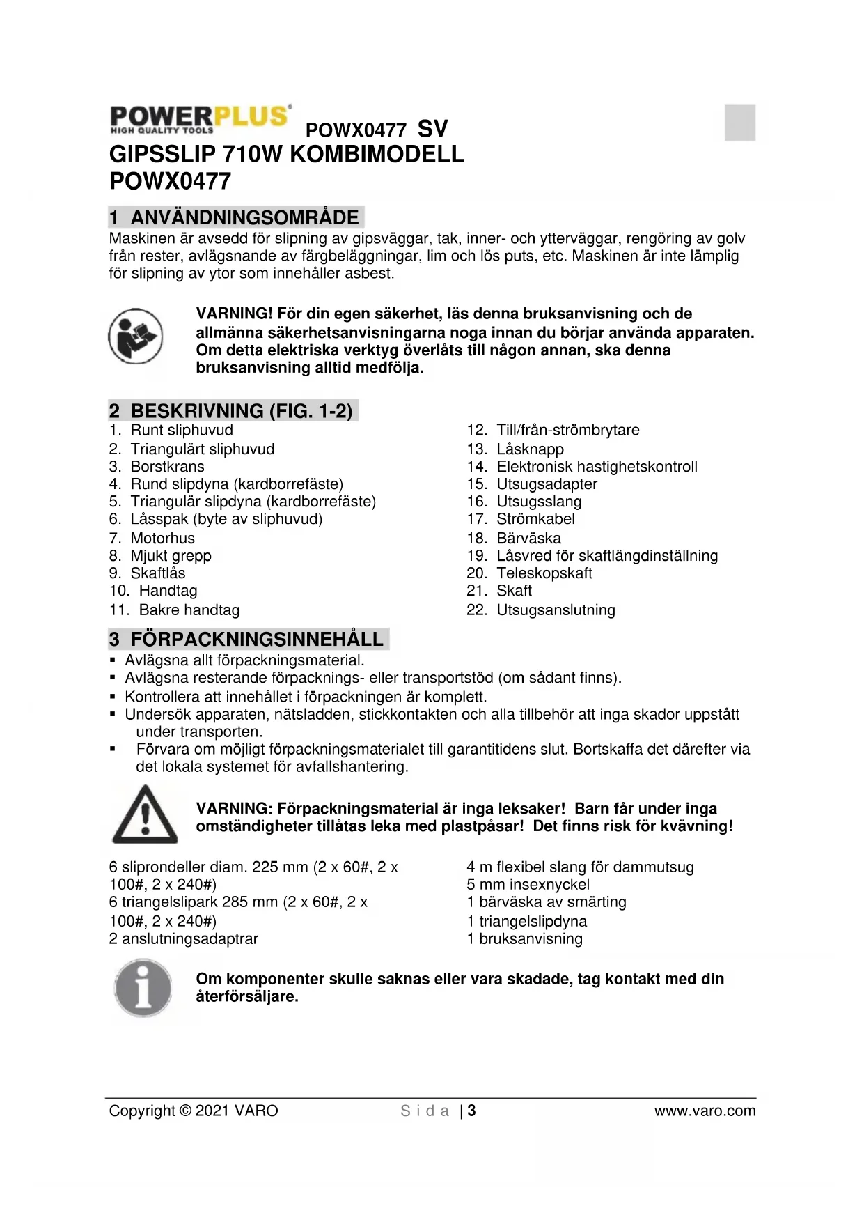 VARO N.V. - Vic. Van Rompuy N.V.- Joseph Van Instraat 9 - BE2500 Lier - BELGIEN, förklarar att, Produkt: Gipsslip 710 W kombimodell Varumärke: POWERplus Modell: POWX0477 överensstämmer med väsentliga krav och andra relevanta bestämmelser i tillämpliga Europeiska direktiv, baserat på tillämpningen av Europeiska harmoniserade standarder. Varje ej godkänd ändring av apparaten gör denna deklaration ogiltig. Europeiska direktiv (inklusive, i tillämpliga fall, ändringar till dessa, fram till dagen för undertecknandet): 2011/65/EU 2006/42/EC 2014/30/EU Europeiska harmoniserade standarder (inklusive, i tillämpliga fall, ändringar till dessa, fram till dagen för undertecknandet): EN62841-1 : 2015 EN62841-2-4 : 2014 EN55014-1 : 2017 EN55014-2 : 2015 EN61000-3-2 : 2014 EN61000-3-3 : 2013 Ansvarig för den tekniska dokumentationen: Philippe Vankerkhove, VARO - Vic. Van Rompuy N.V. Undertecknad agerar på uppdrag av företagets VD, Ludo Mertens Tillämpningsansvarig - Registrerings- och regelfrågor 08/06/2021, Lier - BelgiumPOWX0477 FI Copyright © 2021 VARO S i v u | 1 www.varo.com 1 KÄYTTÖ .......................................................................................... 3