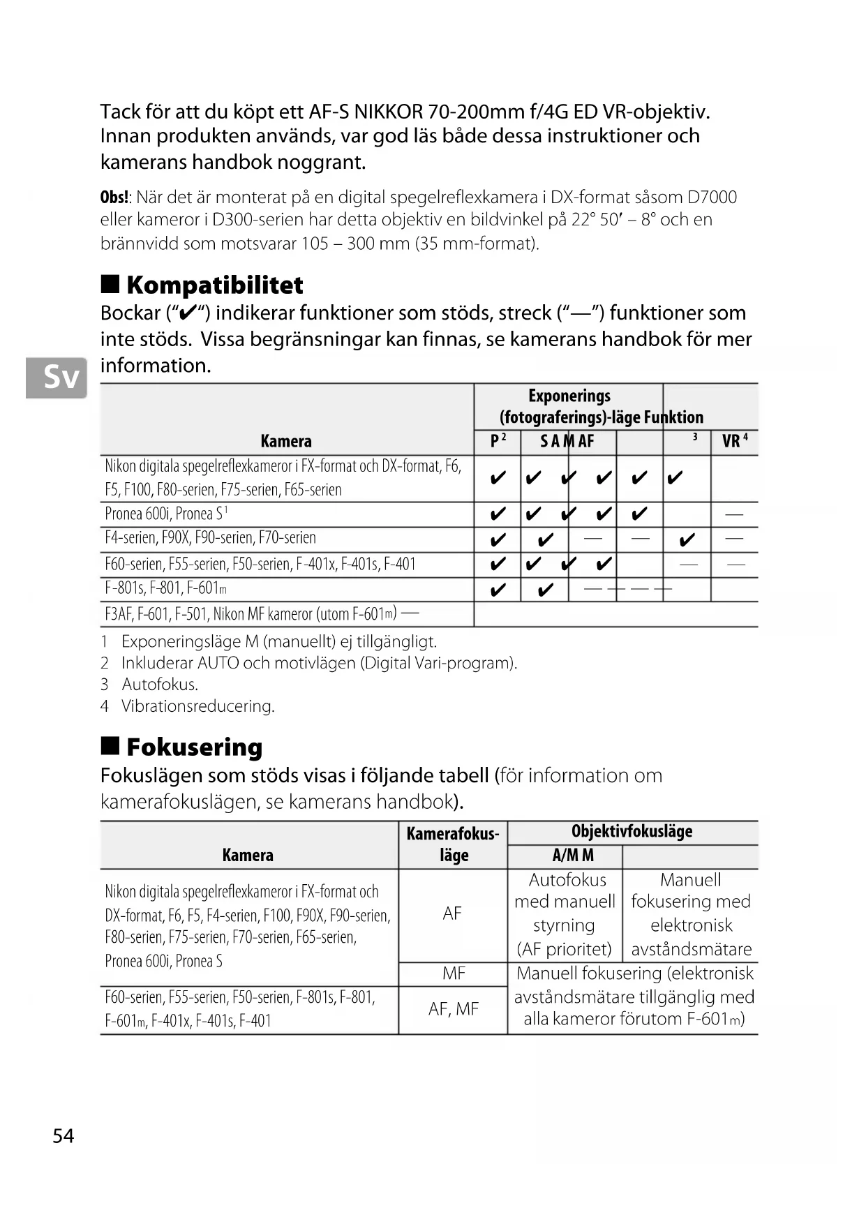 Tack för att du köpt ett AF‑S NIKKOR 70‑200mm f/4G ED VR‑objektiv. Innan produkten används, var god läs både dessa instruktioner och kamerans handbok noggrant. Obs!: När det är monterat på en digital spegelreflexkamera i DX-format såsom D7000 eller kameror i D300-serien har detta objektiv en bildvinkel på 22° 50′ – 8° och en brännvidd som motsvarar 105 – 300 mm (35 mm-format). Kompatibilitet Bockar (“✔“) indikerar funktioner som stöds, streck (“—”) funktioner som inte stöds. Vissa begränsningar kan finnas, se kamerans handbok för mer information. Kamera Exponerings (fotograferings)‑läge Funktion