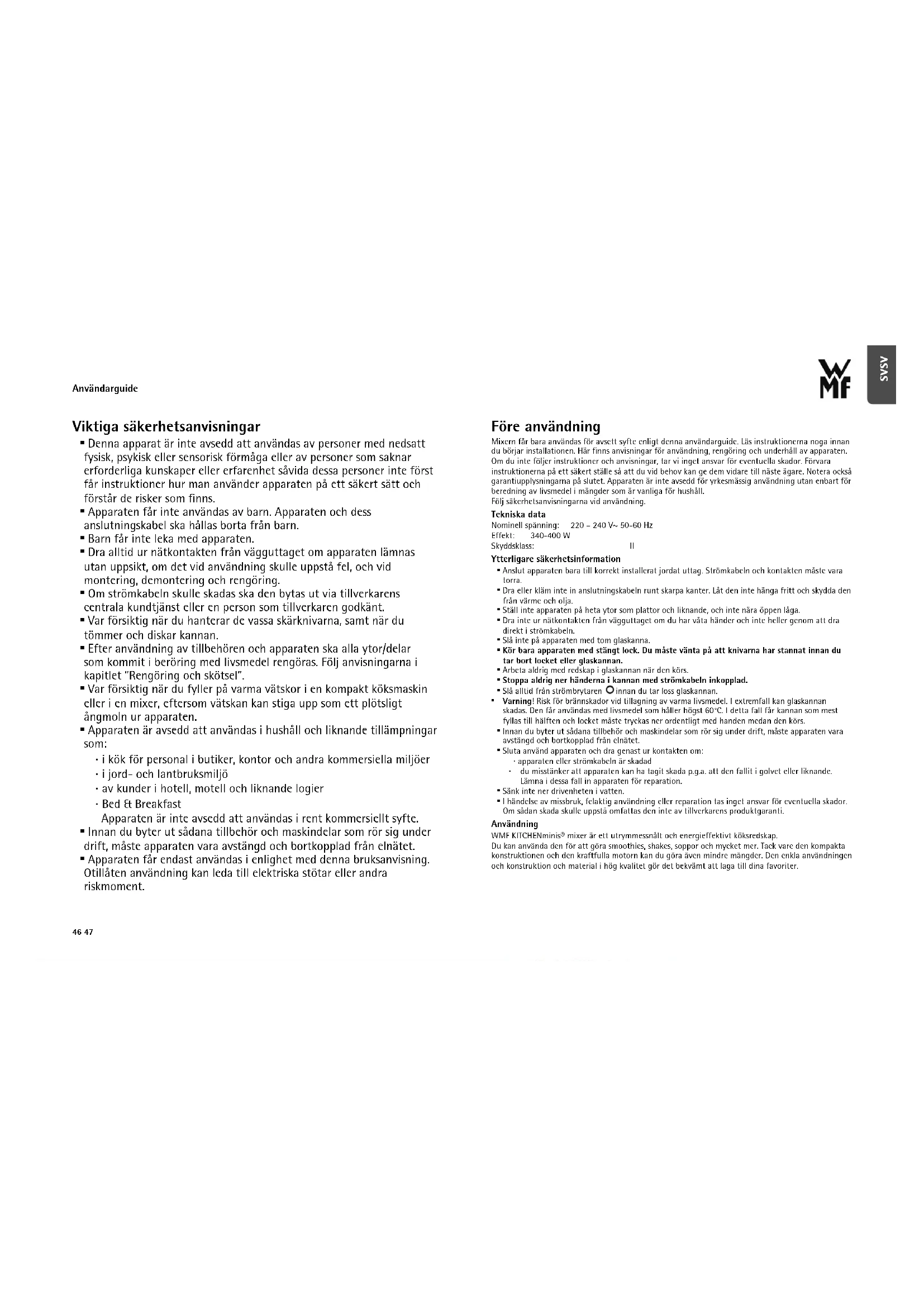 - Apparaten får endast användas i enlighet med denna bruksanvisning. Otillåten användning kan leda till elektriska stötar eller andra riskmoment. Före användning Mixern får bara användas för avsett syfte enligt denna användarguide. Läs instruktionerna noga innan du börjar installationen. Här finns anvisningar för användning, rengöring och underhåll av apparaten. Om du inte följer instruktioner och anvisningar, tar vi inget ansvar för eventuella skador. Förvara instruktionerna på ett säkert ställe så att du vid behov kan ge dem vidare till näste ägare. Notera också garantiupplysningarna på slutet. Apparaten är inte avsedd för yrkesmässig användning utan enbart för beredning av livsmedel i mängder som är vanliga för hushåll. Följ säkerhetsanvisningarna vid användning. Tekniska data Nominell spänning: 220 – 240 V~ 50-60 Hz Effekt: 340-400 W Skyddsklass: II Ytterligare säkerhetsinformation