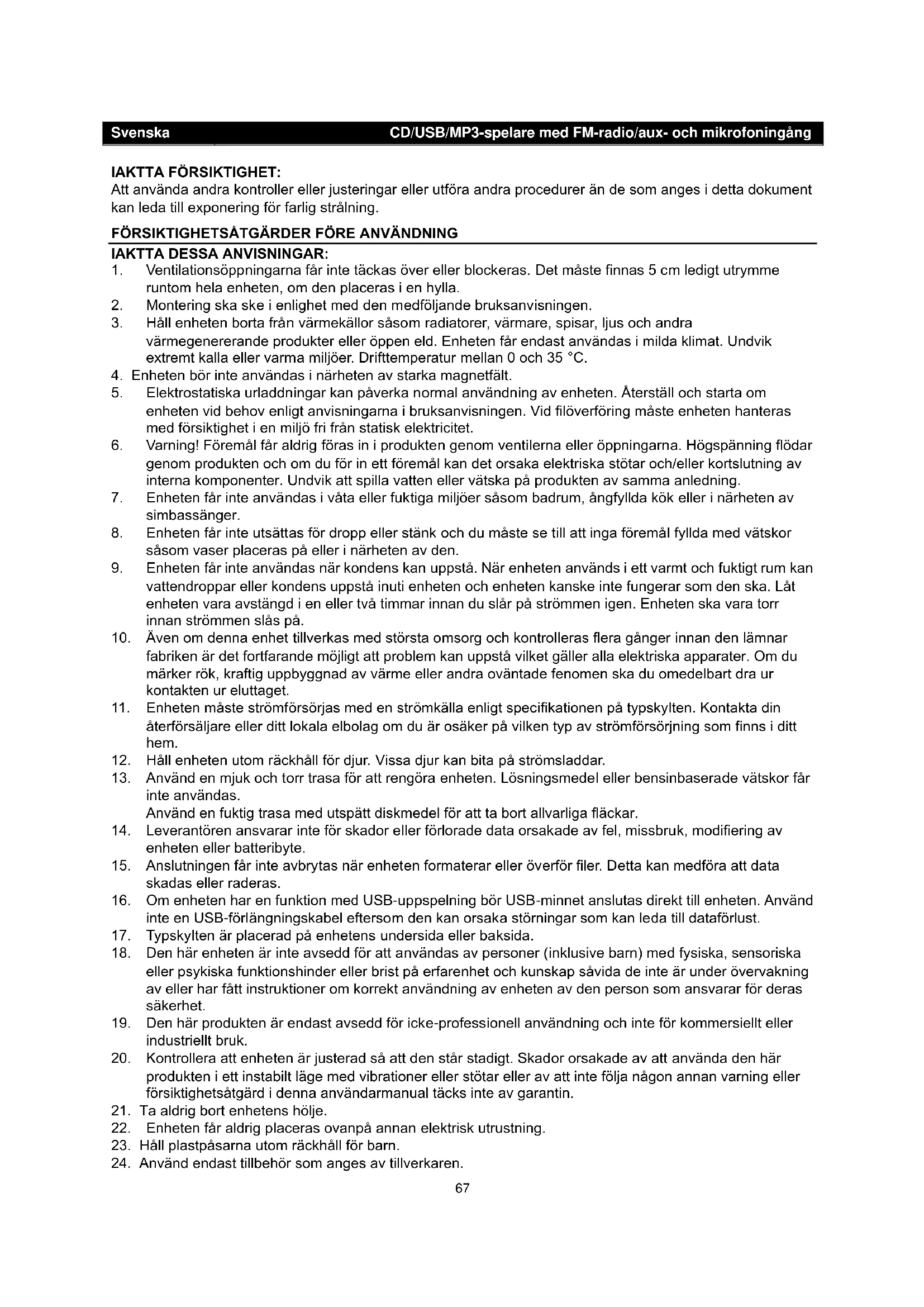 Iaktta försiktighet: Att använda andra kontroller eller justeringar eller utföra andra procedurer än de som anges i detta dokument kan leda till exponering för farlig strålning. Den här enheten får endast justeras eller repareras av kvalificerad servicepersonal. Viktigt: Eftersom rörelser i cd-mekanismen och de känsliga kretsarna kan orsaka störningar på radiomottagare i närheten, bör enheten stängas av när annan radioutrustning används. På grund av MCU-styrningens komplexitet ska enhetens strömförsörjning frånkopplas om enheten slutar fungera under drift! Detta är inte ett fel i systemet!72