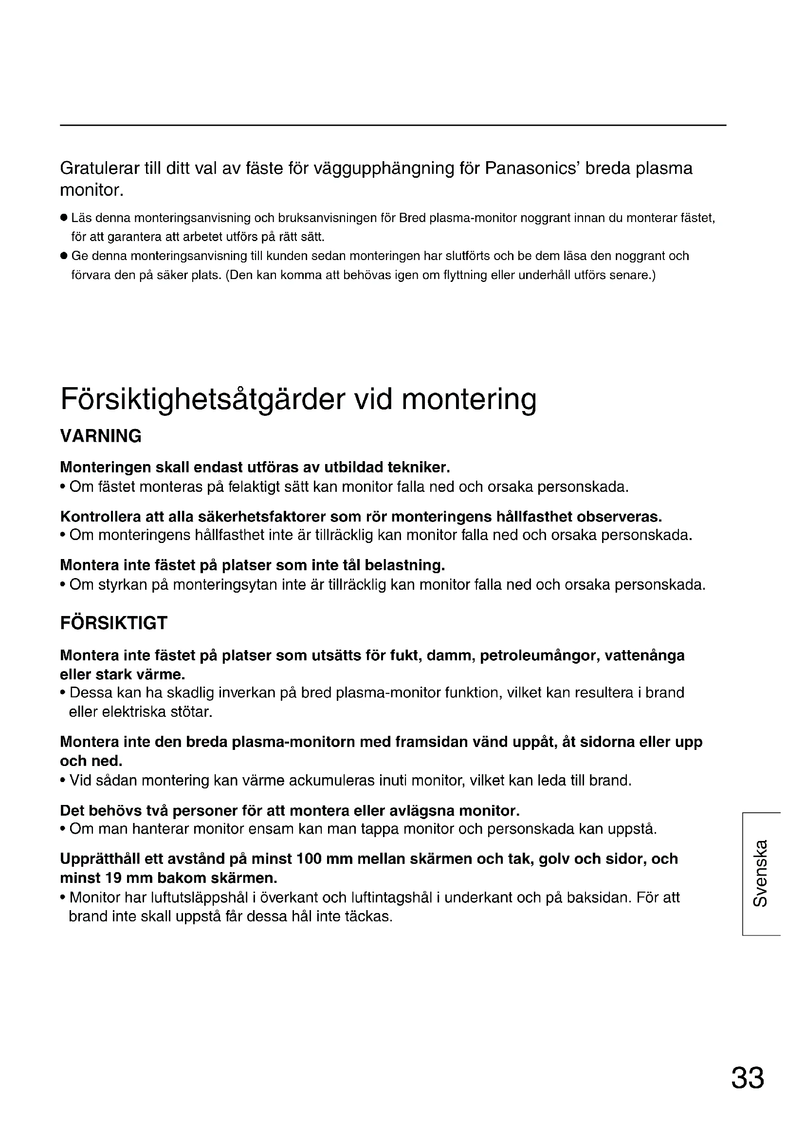 Läs denna monteringsanvisning och bruksanvisningen för Bred plasma-monitor noggrant innan du monterar fästet, för att garantera att arbetet utförs på rätt sätt.