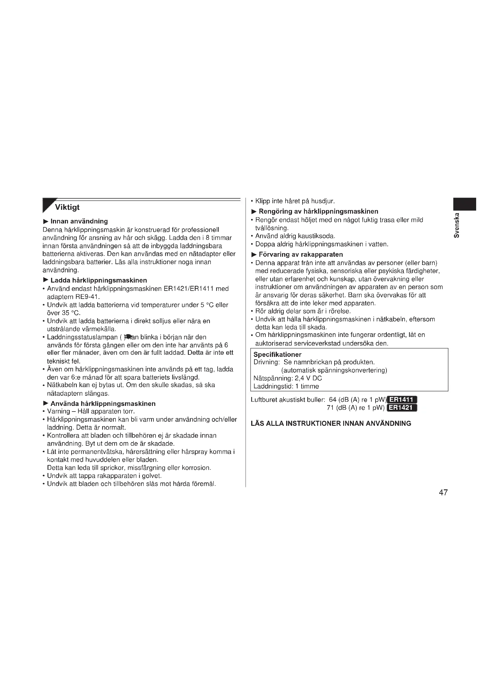 Klipp inte håret på husdjur. Rengöring av hårklippningsmaskinen Rengör endast höljet med en något fuktig trasa eller mild tvållösning. Använd aldrig kaustiksoda. Doppa aldrig hårklippningsmaskinen i vatten. Förvaring av rakapparaten Denna apparat från inte att användas av personer (eller barn) med reducerade fysiska, sensoriska eller psykiska färdigheter, eller utan erfarenhet och kunskap, utan övervakning eller instruktioner om användningen av apparaten av en person som är ansvarig för deras säkerhet. Barn ska övervakas för att försäkra att de inte leker med apparaten. Rör aldrig delar som är i rörelse. Undvik att hålla hårklippningsmaskinen i nätkabeln, eftersom detta kan leda till skada. Om hårklippningsmaskinen inte fungerar ordentligt, låt en auktoriserad serviceverkstad undersöka den. Specikationer Drivning: Se namnbrickan på produkten. (automatisk spänningskonvertering) Nätspänning: 2,4 V DC Laddningstid: 1 timme Luftburet akustiskt buller: 64 (dB (A) re 1 pW) ER1411 71 (dB (A) re 1 pW) ER1421 LÄS ALLA INSTRUKTIONER INNAN ANVÄNDNING
