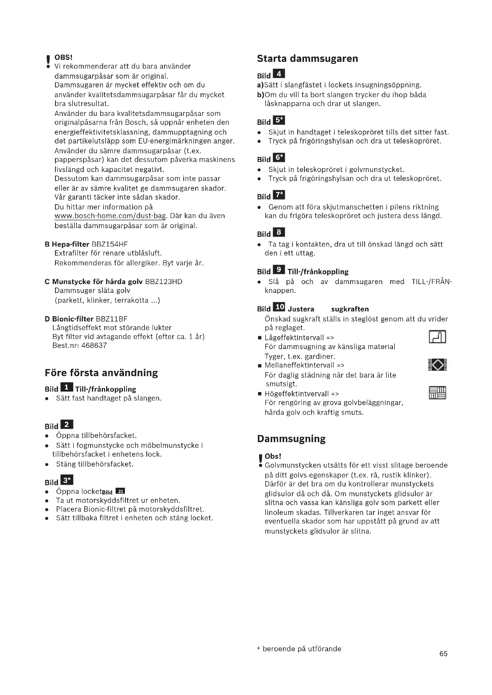 OBS! Vi rekommenderar att du bara använder dammsugarpåsar som är original. Dammsugaren är mycket effektiv och om du använder kvalitetsdammsugarpåsar får du mycket bra slutresultat. Använder du bara kvalitetsdammsugarpåsar som originalpåsarna från Bosch, så uppnår enheten den energieffektivitetsklassning, dammupptagning och det partikelutsläpp som EU-energimärkningen anger. Använder du sämre dammsugarpåsar (t.ex. papperspåsar) kan det dessutom påverka maskinens livslängd och kapacitet negativt. Dessutom kan dammsugarpåsar som inte passar eller är av sämre kvalitet ge dammsugaren skador. Vår garanti täcker inte sådan skador. Du hittar mer information på www.bosch-home.com/dust-bag . Där kan du även beställa dammsugarpåsar som är original. B Hepa-filter BBZ154HF Extrafilter för renare utblåsluft. Rekommenderas för allergiker. Byt varje år. C Munstycke för hårda golv BBZ123HD Dammsuger släta golv (parkett, klinker, terrakotta …) D Bionic-filter BBZ11BF Långtidseffekt mot störande lukter Byt filter vid avtagande effekt (efter ca. 1 år) Best.nr: 468637 Före första användning Bild Till-/frånkoppling Sätt fast handtaget på slangen. Bild Öppna tillbehörsfacket. Sätt i fogmunstycke och möbelmunstycke i tillbehörsfacket i enhetens lock. Stäng tillbehörsfacket. Bild Öppna locket. Bild Ta ut motorskyddsfiltret ur enheten. Placera Bionic-filtret på motorskyddsfiltret. Sätt tillbaka filtret i enheten och stäng locket.