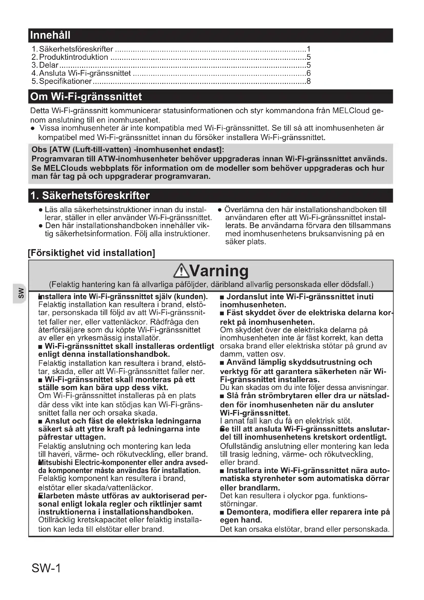 - 5.Specikationer Innehåll Om Wi-Fi-gränssnittet DettaWi-Fi-gränssnittkommunicerarstatusinformationenochstyrkommandonafrånMELCloudge- nomanslutningtilleninomhusenhet. ●VissainomhusenheterärintekompatiblamedWi-Fi-gränssnittet.Setillsåattinomhusenhetenär kompatibelmedWi-Fi-gränssnittetinnanduförsökerinstalleraWi-Fi-gränssnittet. [Försiktighet vid installation] Varning (Felaktighanteringkanfåallvarligapåföljder,däriblandallvarligpersonskadaellerdödsfall.) p. 8