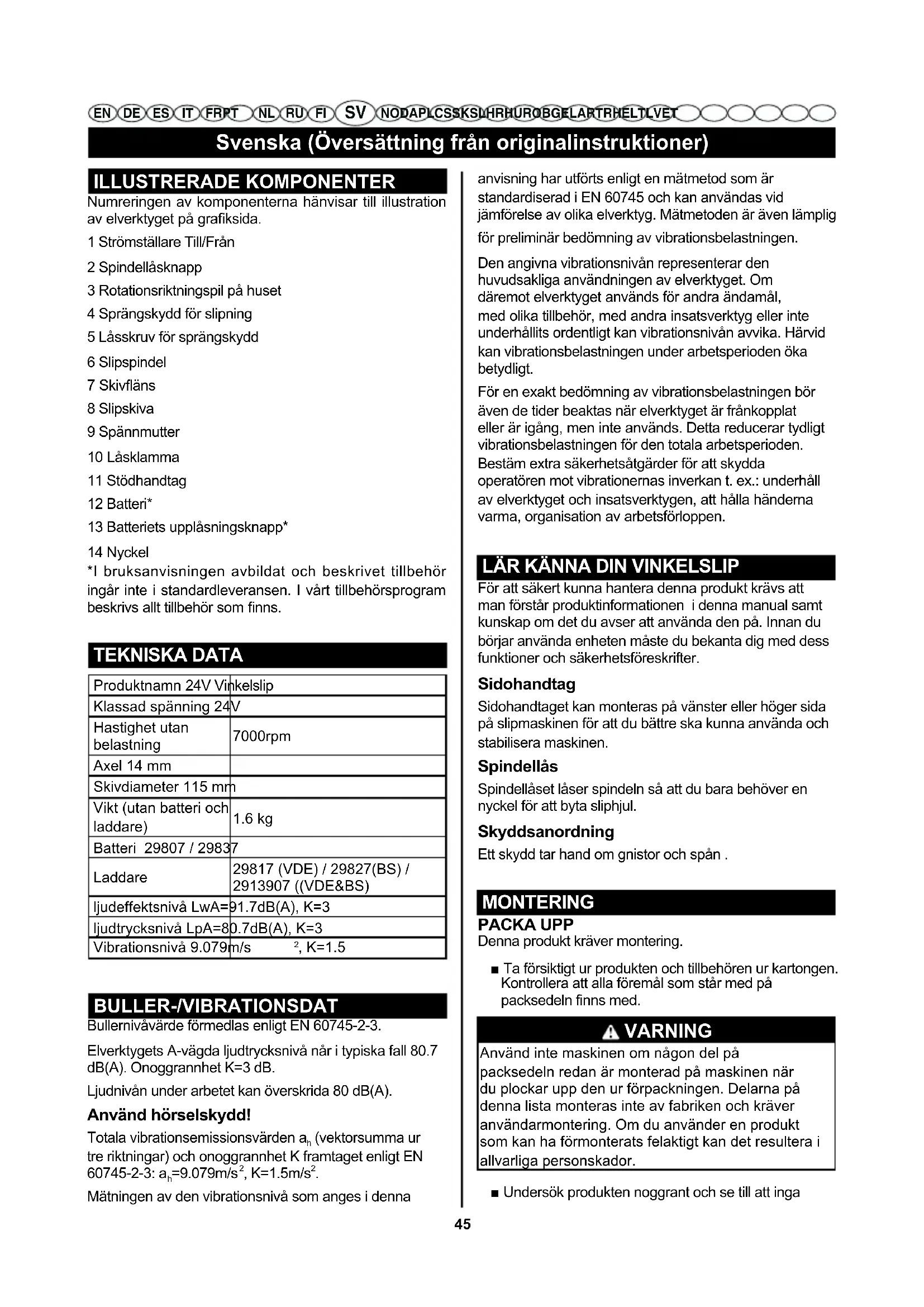 NO DA PL CS SK SL HR HU RO BG EL AR TR HE LT LV ET ILLUSTRERADE KOMPONENTER Numreringen av komponenterna hänvisar till illustration av elverktyget på graksida. 1 Strömställare Till/Från 2 Spindellåsknapp 3 Rotationsriktningspil på huset 4 Sprängskydd för slipning 5 Låsskruv för sprängskydd 6 Slipspindel 7 Skiväns 8 Slipskiva 9 Spännmutter 10 Låsklamma 11 Stödhandtag 12 Batteri* 13 Batteriets upplåsningsknapp* 14 Nyckel *I bruksanvisningen avbildat och beskrivet tillbehör ingår inte i standardleveransen. I vårt tillbehörsprogram beskrivs allt tillbehör som nns. TEKNISKA DATA Produktnamn 24V Vinkelslip Klassad spänning 24V Hastighet utan belastning 7000rpm Axel 14 mm Skivdiameter 115 mm Vikt (utan batteri och laddare)
