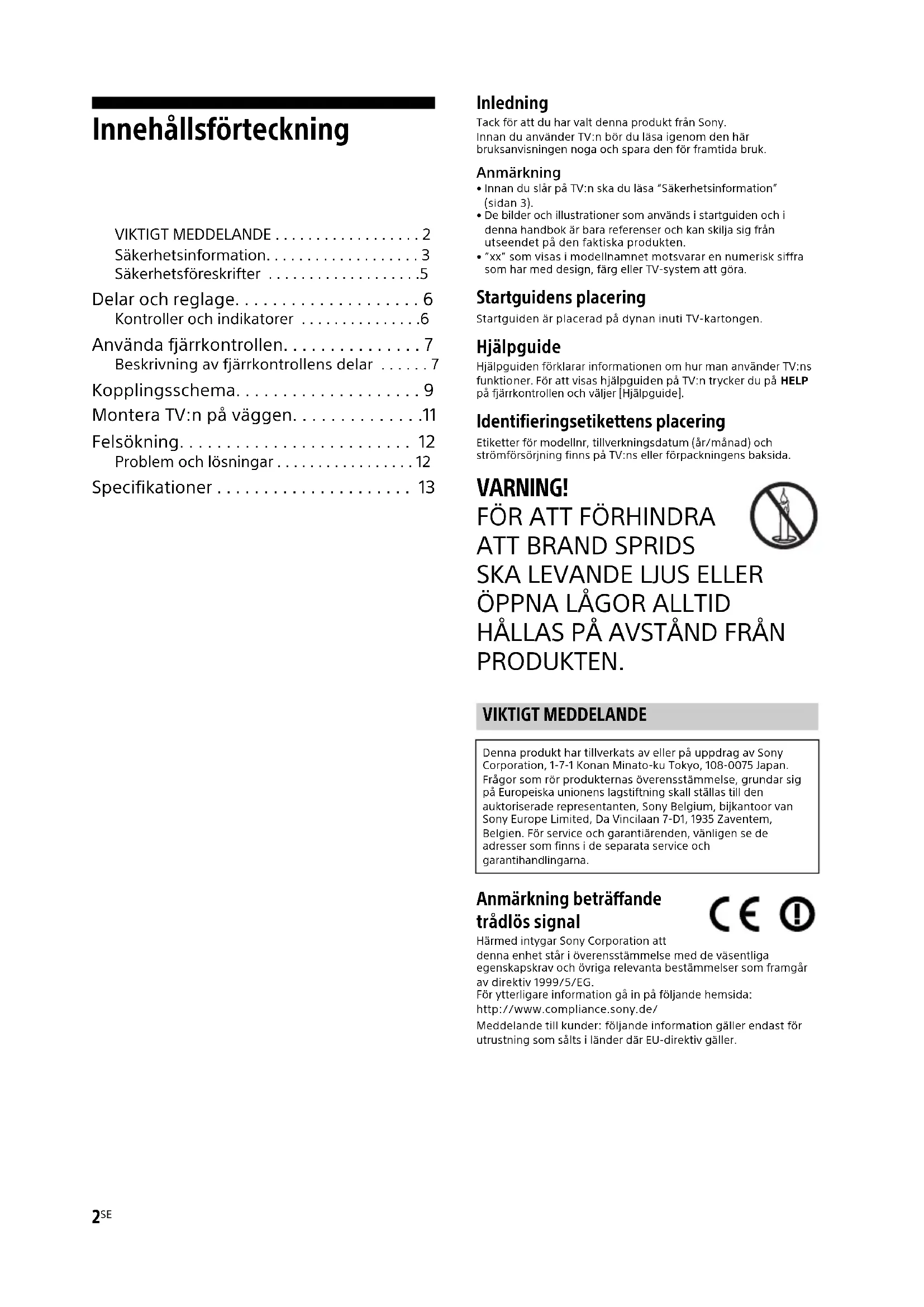 - Specifikationer Inledning Tack för att du har valt denna produkt från Sony. Innan du använder TV:n bör du läsa igenom den här bruksanvisningen noga och spara den för framtida bruk. Anmärkning p. 13