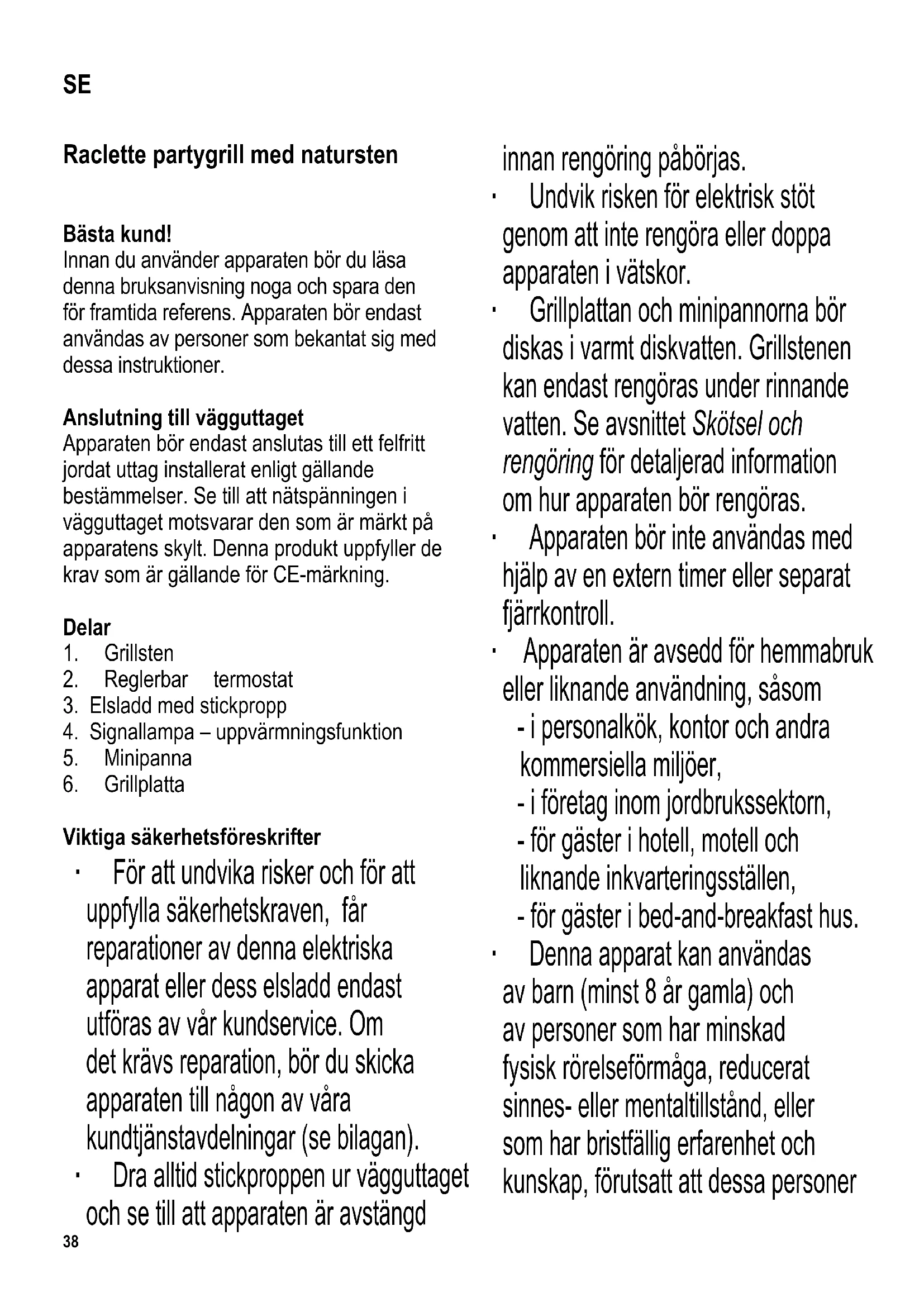 Viktiga säkerhetsföreskrifter ∙ För att undvika risker och för att uppfylla säkerhetskraven, får reparationer av denna elektriska apparat eller dess elsladd endast utföras av vår kundservice. Om det krävs reparation, bör du skicka apparaten till någon av våra kundtjänstavdelningar (se bilagan). ∙ Dra alltid stickproppen ur vägguttaget och se till att apparaten är avstängd innan rengöring påbörjas. ∙ Undvik risken för elektrisk stöt genom att inte rengöra eller doppa apparaten i vätskor. ∙ Grillplattan och minipannorna bör diskas i varmt diskvatten. Grillstenen kan endast rengöras under rinnande vatten. Se avsnittet Skötsel och rengöring för detaljerad information om hur apparaten bör rengöras. ∙ Apparaten bör inte användas med hjälp av en extern timer eller separat fjärrkontroll. ∙ Apparaten är avsedd för hemmabruk eller liknande användning, såsom - i personalkök, kontor och andra kommersiella miljöer, - i företag inom jordbrukssektorn, - för gäster i hotell, motell och liknande inkvarteringsställen, - för gäster i bed-and-breakfast hus. ∙ Denna apparat kan användas av barn (minst 8 år gamla) och av personer som har minskad fysisk rörelseförmåga, reducerat sinnes- eller mentaltillstånd, eller som har bristfällig erfarenhet och kunskap, förutsatt att dessa personer SE39 är under uppsyn eller har fått tillräckliga instruktioner beträffande apparatens användning och vet vilka risker och säkerhetsåtgärder som användningen innefattar. ∙ Barn bör inte tillåtas leka med apparaten. ∙ Barn bör inte tillåtas rengöra eller göra service på apparaten ifall de inte är övervakade och minst 8 år gamla. ∙ Apparaten och dess elsladd bör hållas utom räckhåll för barn under 8 år. ∙ Varning: Håll barn på avstånd från apparatens förpackningsmaterial eftersom fara eventuellt kan uppstå. Det fi nns t.ex. risk för kvävning. ∙ Kontrollera noga om apparatens hölje, elsladd samt övriga tillbehör har skadats innan du tar apparaten i användning. Om apparaten t.ex. har tappats på en hård yta, eller om elsladden utsatts för våldsam kraft, får den inte längre användas. Även osynliga skador kan försämra apparatens driftsäkerhet. ∙ Sladden måste hållas på säkert avstånd från apparatens heta delar. ∙ Varning: Risk för brännskada. Höljet, grillytorna och minipannorna blir heta under användning. ∙ Apparaten bör alltid vara under uppsikt när den är i användning. ∙ Under användningen bör apparaten placeras på en värmebeständig yta, som tål stänk och fl äckar. När man tillreder mat som innehåller mycket fett eller vätska kan man ibland inte undvika stänk. ∙ Placera inte grillen nära en vägg eller i en vrå och se till att det inte fi nns lättantändliga material i närheten. ∙ Före användning bör grillstenen och grillplattan placeras ovanpå apparaten, ovanför värmeelementen. ∙ Varning: Använd inte apparaten utomhus. ∙ Dra alltid stickproppen ur vägguttaget - efter användning, - ifall apparaten skulle krångla, - innan apparaten rengörs. ∙ Ta stickproppen ur vägguttaget genom att dra i stickproppen, aldrig i sladden. ∙ Denna apparat bör endast användas med den utrustning som medföljt apparaten. ∙ Låt alltid apparaten kyla ner innan du avlägsnar grillstenen och grillplattan och innan du rengör apparaten eller sätter den i förvaring. ∙ Om apparaten använts felaktigt eller om bruksanvisningen inte följts, kan inga krav ställas mot leverantören eller försäljaren. Hur du använder din raclettegrill Innan första användningen Avlägsna allt förpackningsmaterial fullständigt. Innan du använder grillen för första gången bör du rengöra grillstenen, grillplattan och minipannorna med en fuktad duk. Vi rekommenderar att du låter apparaten och minipannorna värma upp ca. 10 minuter utan några matprodukter för att få bort den “nya” lukt som kan uppstå när apparaten kopplas på för första gången. En liten mängd rök kan också synas och därför bör du vädra rummet40 under denna uppvärmning. Stenen ∙ Placera stenen på grillen ovanför värmeelementet, med den polerade sidan uppåt. Se till att du passar in fördjupningarna på stenens undersida med ramens skenor så att stenen inte kan röra sig. ∙ Varning: undvik att placera en kall sten på ett hett element. ∙ Stenen kan användas för att tillreda grönsaker, skivat kött eller skivad fi sk etc. ∙ Stenen är gjord av naturmaterial. Små sprickor som uppstått p.g.a. naturlig utvidgning och minskning under upphettning och avsvalning samt färgförändring till en mörkare färg är normala och har inga skadliga effekter. ∙ Placera inte fryst mat eller produkter som innehåller ättika (såsom ättiksgurkor eller senap) på stenen. Grillplattan ∙ Lägg plattan ovanpå apparaten och ovanför värmeelementet med den räffl ade sidan uppåt innan du kopplar på apparaten. ∙ Se till att fördjupningarna på undersidan passar över ramens skenor. För därefter grillplattan något i sidled för att låsa den på plats. Observera grillplattans markeringar. ∙ Grillplattan kan användas för att tillaga grönsaker, kött eller fi sk. Reglerbar termostat ∙ Den variabla termostaten kontrollerar värmeelementets funktionstid och signallampan visar den aktuella funktionen. Värmeelementet påkopplat = signallampan tänd Värmeelementet stängt = signallampan släckt ∙ När du smälter ost eller grillar bör maximal inställning användas (termostaten vriden fullt till höger). ∙ För att endast hålla maten varm bör du justera termostaten till en lägre inställning (termostaten längre till vänster). ∙ Vrid termostaten till vänster så långt det går och dra stickproppen ur eluttaget efter användningen. Användning ∙ Placera grillplattan och grillstenen på enheten på det sätt som beskrivs ovan. ∙ Anslut stickproppen till ett lämpligt elutta