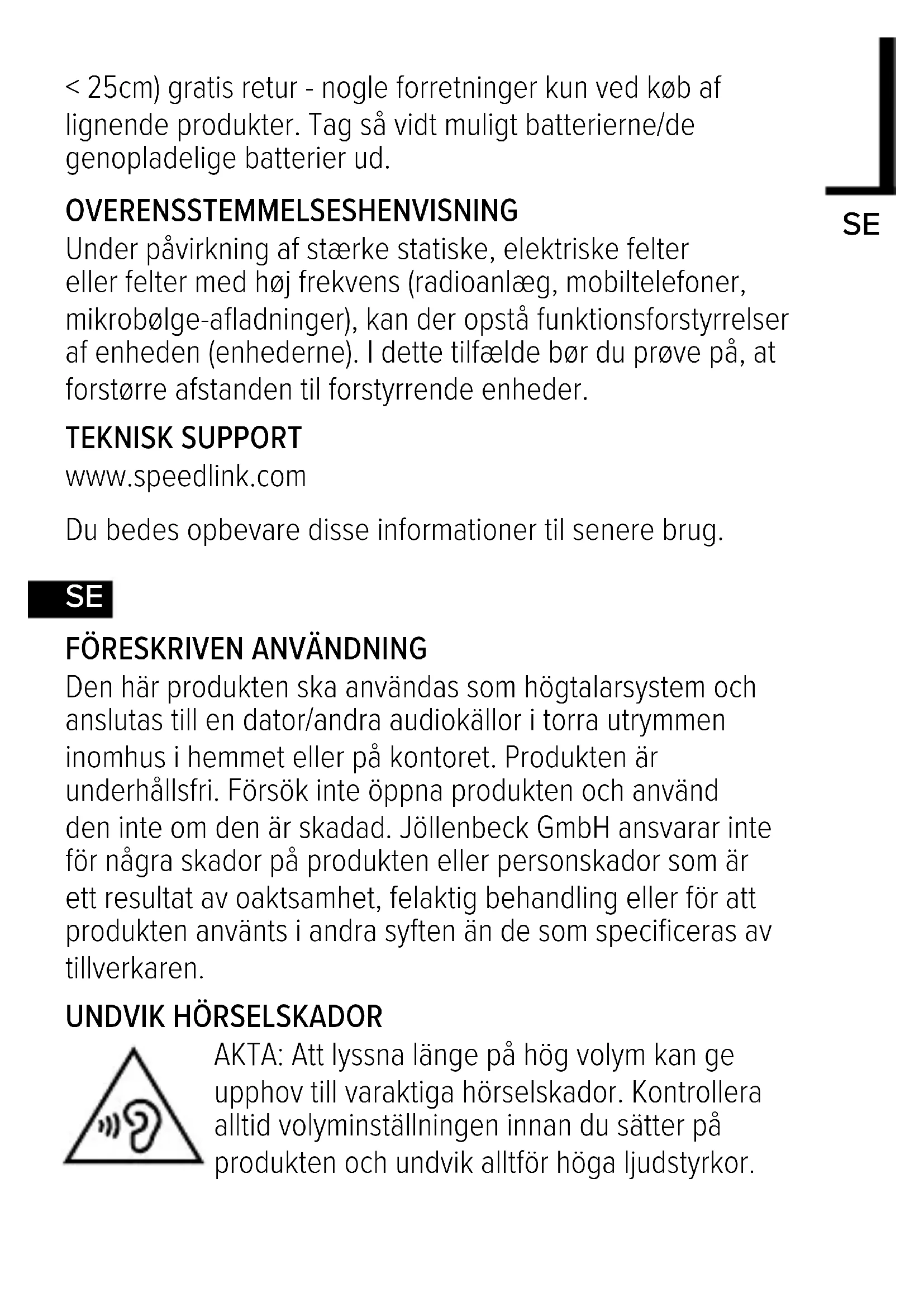 Den härprodukten ska användas som högtalarsystem och anslutas till en dator/andra audiokällor i torra utrymmen inomhus i hemmet eller på kontoret. Produktten ar unterhällsfri. Försök inte öppnaprodukten och använd den inte om den ar skadad. Jöllenbeck GmbH ansvarar inte für nagra skador påprodukten eller personskador som arett resultat av oaktsamhet, felaktig behandling erler for attprodukten använts i andra syften an de som specificeras av tillverkaren.