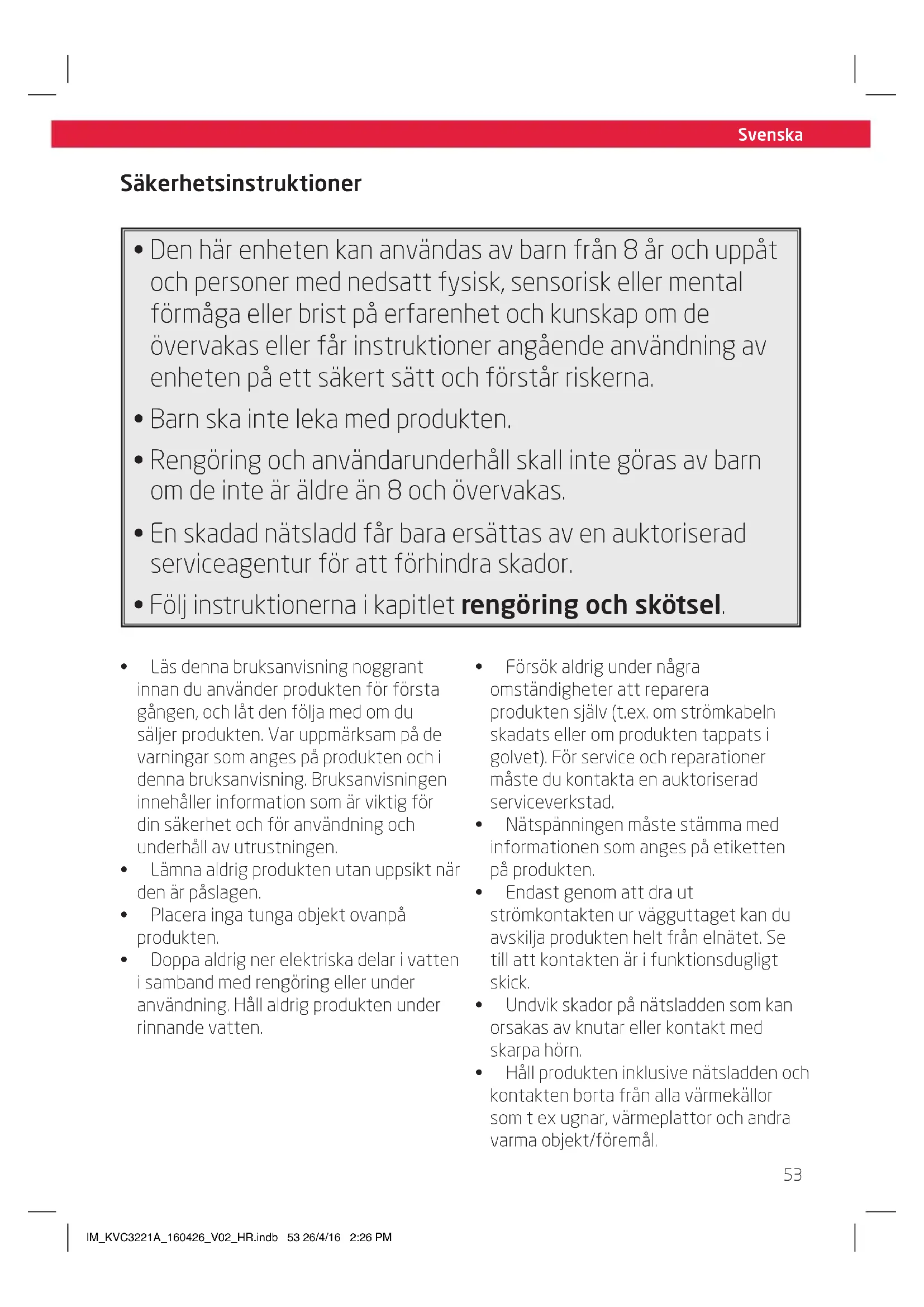 - Håll produkten inklusive nätsladden och kontakten borta från alla värmekällor som t ex ugnar, värmeplattor och andra varma objekt/föremål. IM_KVC3221A_160426_V02_HR.indb 53 26/4/16 2:26 PMSvenska