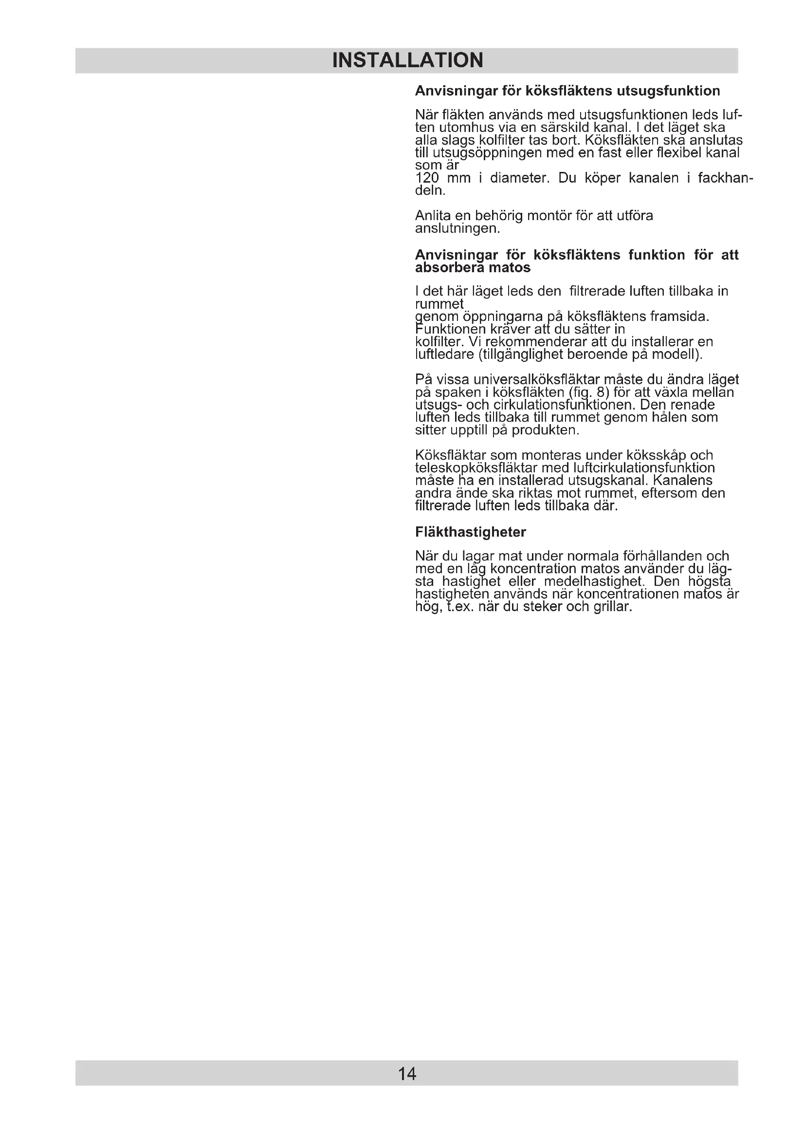 l Tillverkaren övertar in- get ansvar för skador som uppstår på grund av felaktig installation eller om köksäkten inte används enligt an- visningarna i denna ma- nual. l Köksäkten är avsedd för att avlägsna matos. Använd inte köksäkten för andra ändamål. l Anslut en köksäkt med utsugsfunktion till en passande ventila- tionskanal (anslut INTE till rök- eller rökgaska- naler som används). Det krävs att en luftut- sugskanal som leder utomhus installeras. Ka- nalen (i regel 120 eller 150 mm i diameter) bör inte vara längre än 4–5 m. En luftutsugskanal krävs även för köksäk- tar i teleskoputförande eller äktar som mon- teras under köksskåp om dessa är luftcirkula- tionsäktar. l Köksäktar med luftcirkulationsfunktion måste ha ett installerat aktivkollter. I så fall be- hövs ingen utsugskanal, men vi rekommenderar att du installerar en lu- ftledare (endast köks- äkt av skorstenstyp).