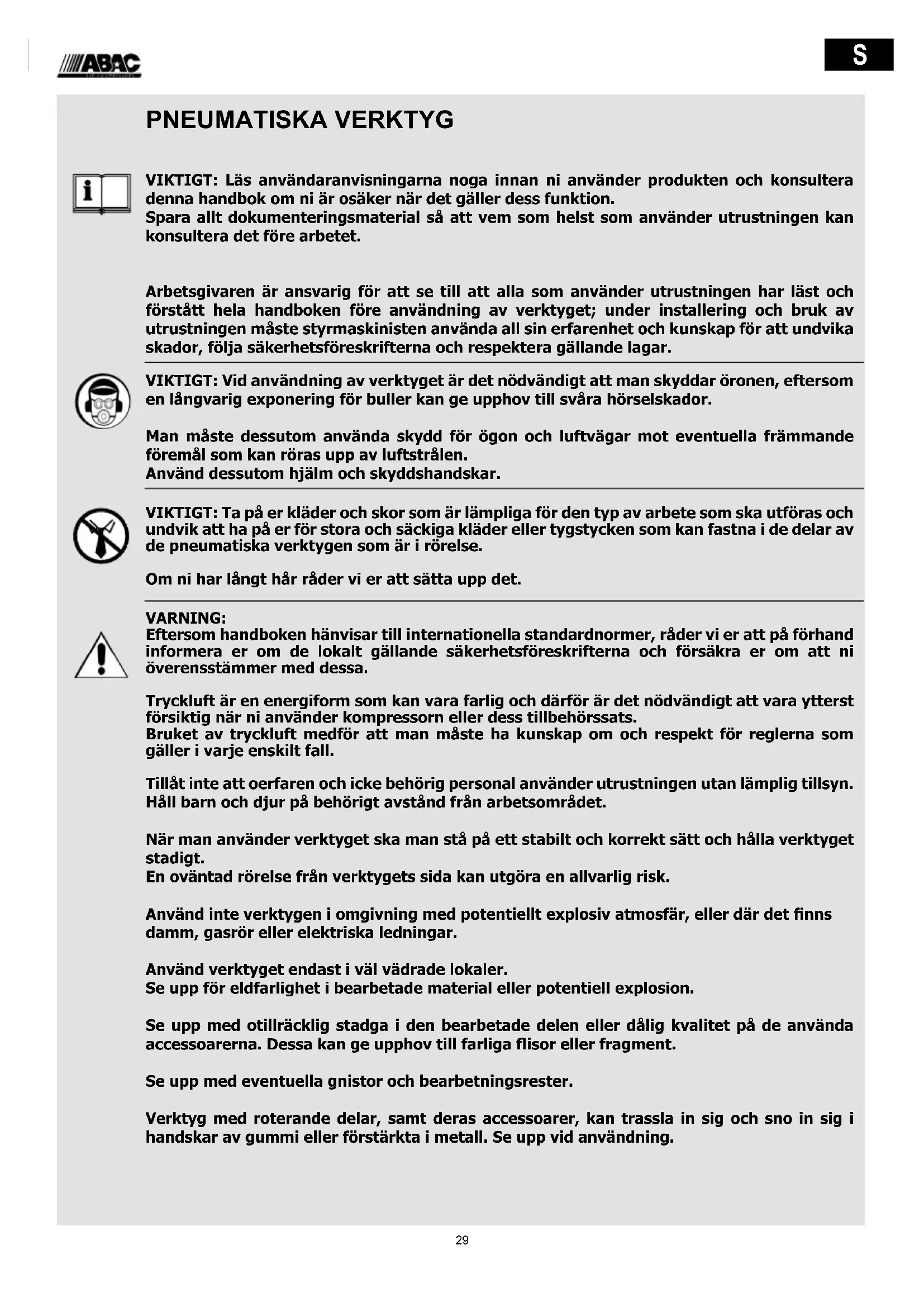 PNEUMATISKA VERKTYG VIKTIGT: Läs användaranvisningarna noga innan ni använder produkten och konsultera denna handbok om ni är osäker när det gäller dess funktion. Spara allt dokumenteringsmaterial så att vem som helst som använder utrustningen kan konsultera det före arbetet. Arbetsgivaren är ansvarig för att se till att alla som använder utrustningen har läst och förstått hela handboken före användning av verktyget; under installering och bruk av utrustningen måste styrmaskinisten använda all sin erfarenhet och kunskap för att undvika skador, följa säkerhetsföreskrifterna och respektera gällande lagar. VIKTIGT: Vid användning av verktyget är det nödvändigt att man skyddar öronen, eftersom en långvarig exponering för buller kan ge upphov till svåra hörselskador. Man måste dessutom använda skydd för ögon och luftvägar mot eventuella främmande föremål som kan röras upp av luftstrålen. Använd dessutom hjälm och skyddshandskar. VIKTIGT: Ta på er kläder och skor som är lämpliga för den typ av arbete som ska utföras och undvik att ha på er för stora och säckiga kläder eller tygstycken som kan fastna i de delar av de pneumatiska verktygen som är i rörelse. Om ni har långt hår råder vi er att sätta upp det. VARNING: Eftersom handboken hänvisar till internationella standardnormer, råder vi er att på förhand informera er om de lokalt gällande säkerhetsföreskrifterna och försäkra er om att ni överensstämmer med dessa. Tryckluft är en energiform som kan vara farlig och därför är det nödvändigt att vara ytterst försiktig när ni använder kompressorn eller dess tillbehörssats. Bruket av tryckluft medför att man måste ha kunskap om och respekt för reglerna som gäller i varje enskilt fall. Tillåt inte att oerfaren och icke behörig personal använder utrustningen utan lämplig tillsyn. Håll barn och djur på behörigt avstånd från arbetsområdet. När man använder verktyget ska man stå på ett stabilt och korrekt sätt och hålla verktyget stadigt. En oväntad rörelse från verktygets sida kan utgöra en allvarlig risk. Använd inte verktygen i omgivning med potentiellt explosiv atmosfär, eller där det nns damm, gasrör eller elektriska ledningar. Använd verktyget endast i väl vädrade lokaler. Se upp för eldfarlighet i bearbetade material eller potentiell explosion. Se upp med otillräcklig stadga i den bearbetade delen eller dålig kvalitet på de använda accessoarerna. Dessa kan ge upphov till farliga isor eller fragment. Se upp med eventuella gnistor och bearbetningsrester. Verktyg med roterande delar, samt deras accessoarer, kan trassla in sig och sno in sig i handskar av gummi eller förstärkta i metall. Se upp vid användning.30