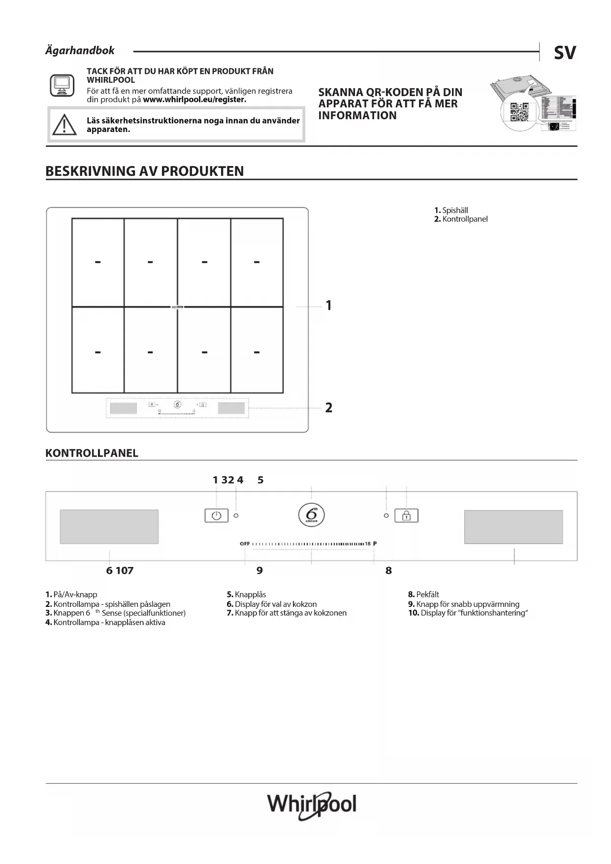 Sense (specialfunktioner)4. Kontrollampa - knapplåsen aktiva5. Knapplås6. Display för val av kokzon7. Knapp för att stänga av kokzonen8. Pekfält9. Knapp för snabb uppvärmning10. Display för “funktionshantering“TILLBEHÖR