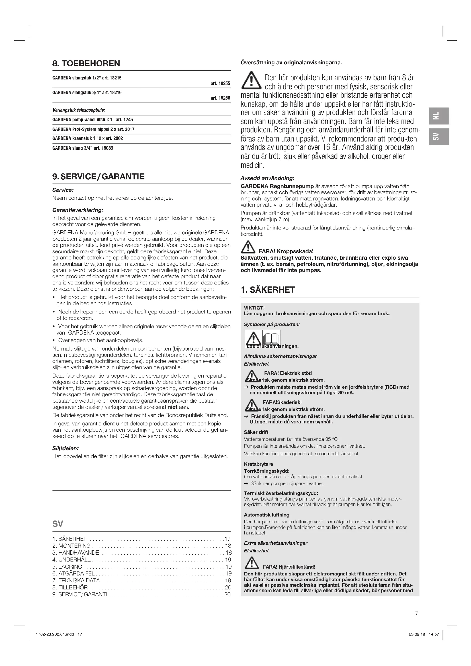 FARA! Elektrisk stöt! Genom en avskuren nätkontakt kan fukt tränga in via nätkabeln i elsyste- met och leda till kortslutning. v Skär därför inte av nätkontakten (t. ex. för att dra genom en vägg). v Dra inte i nätkabeln när Du ska dra ur stickkontakten. v Om nätkabeln till apparaten skadas måste den bytas ut av tillverkaren eller tillverkarens kundtjänst eller någon person med liknande kvalifikationer för att undvika faror. Nätkontakter och kopplingar skall vara strilsäkra. De elektriska anslutningarna får inte sänkas ned i vattnet. Skydda nätkontakten och nätanslutningen från värme, olja och vassa kanter. Observera nätspänningen. Uppgifterna på typskylten måste överensstämma med nätuppgifterna. Vid användning i simbassäng, tillse att kontakten är urtagen innan någon vistas i vattnet. Elkabeln får inte användas för att montera eller transportera pumpen. Pumpen skall sänkas nedoch dras upp med hjälp av teleskopröret. Som alter- nativ kan en lina fästas på pumpen för att sänka ner, dra upp och säkra regntun- nepumpen. Kontrollera med jämna mellanrum anslutnings kabeln. Innan pumpen tas i bruk skall man alltid göra en visuell kontroll (särskilt vad gäller nätkabeln och nätkontakten). Defekta pumpar får inte användas. Skicka alltid defekta pumpar till GARDENA Service för kontroll. Demontera inte pumpen mer än statusen den har vid leveransen. Se till att alla delar är fastskruvade innan pumpen används efter underhållet. Används våra pumpar med en generator ska generatortillverkarens varningsinfor- mation följas. Personlig säkerhet FARA! Kvävningsfara! Mindre delar kan lätt sväljas. Plastpåsar innebär kvävningsfara för små barn. Håll små barn borta under monteringen. Observera den lägsta vattennivån enligt pumpspecifikationen. Endast för art. 1762 / 1764: Låt inte pumpen vara i gång mer än 10 minuter med stängd trycksida. Sand och andra föroreningar i vattnet sliter på pumpen och nedsätter kapaciteten. Pumpen får inte användas utan filtret. Flottörbrytaren får endast användas utanför vattnet. Slangen får inte dras bort under driften. Låt pumpen svalna innan fel åtgärdas.