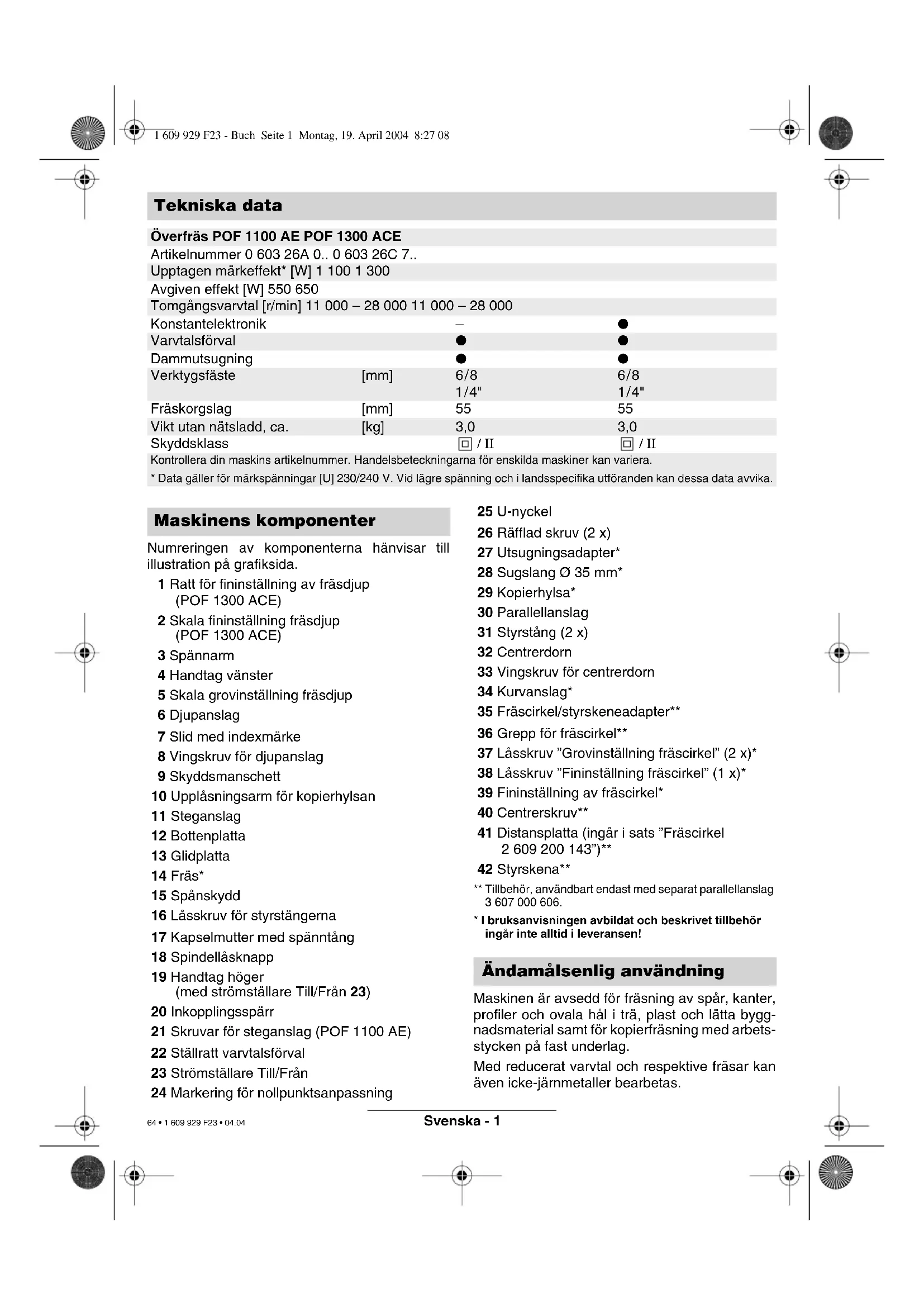 Miljøbeskyttelse Støj-/vibrationsinformation Service og kunderådgiver Overensstemmelses- erklæring 1 609 929 F23 - Buch Seite 6 Montag, 19. April 2004 8:27 08 63 • 1 609 929 F23 • 04.04Svenska - 1 Numreringen av komponenterna hänvisar till illustration på grafiksida. 1 Ratt för fininställning av fräsdjup (POF 1300 ACE) 2 Skala fininställning fräsdjup (POF 1300 ACE) 3 Spännarm 4 Handtag vänster 5 Skala grovinställning fräsdjup 6 Djupanslag 7 Slid med indexmärke 8 Vingskruv för djupanslag 9 Skyddsmanschett 10 Upplåsningsarm för kopierhylsan 11 Steganslag 12 Bottenplatta 13 Glidplatta 14 Fräs* 15 Spånskydd 16 Låsskruv för styrstängerna 17 Kapselmutter med spänntång 18 Spindellåsknapp 19 Handtag höger (med strömställare Till/Från 23) 20 Inkopplingsspärr 21 Skruvar för steganslag (POF 1100 AE) 22 Ställratt varvtalsförval 23 Strömställare Till/Från 24 Markering för nollpunktsanpassning 25 U-nyckel 26 Räfflad skruv (2 x) 27 Utsugningsadapter* 28 Sugslang Ø 35 mm* 29 Kopierhylsa* 30 Parallellanslag 31 Styrstång (2 x) 32 Centrerdorn 33 Vingskruv för centrerdorn 34 Kurvanslag* 35 Fräscirkel/styrskeneadapter** 36 Grepp för fräscirkel** 37 Låsskruv ”Grovinställning fräscirkel” (2 x)* 38 Låsskruv ”Fininställning fräscirkel” (1 x)* 39 Fininställning av fräscirkel* 40 Centrerskruv** 41 Distansplatta (ingår i sats ”Fräscirkel 2 609 200 143”)** 42 Styrskena** ** Tillbehör, användbart endast med separat parallellanslag