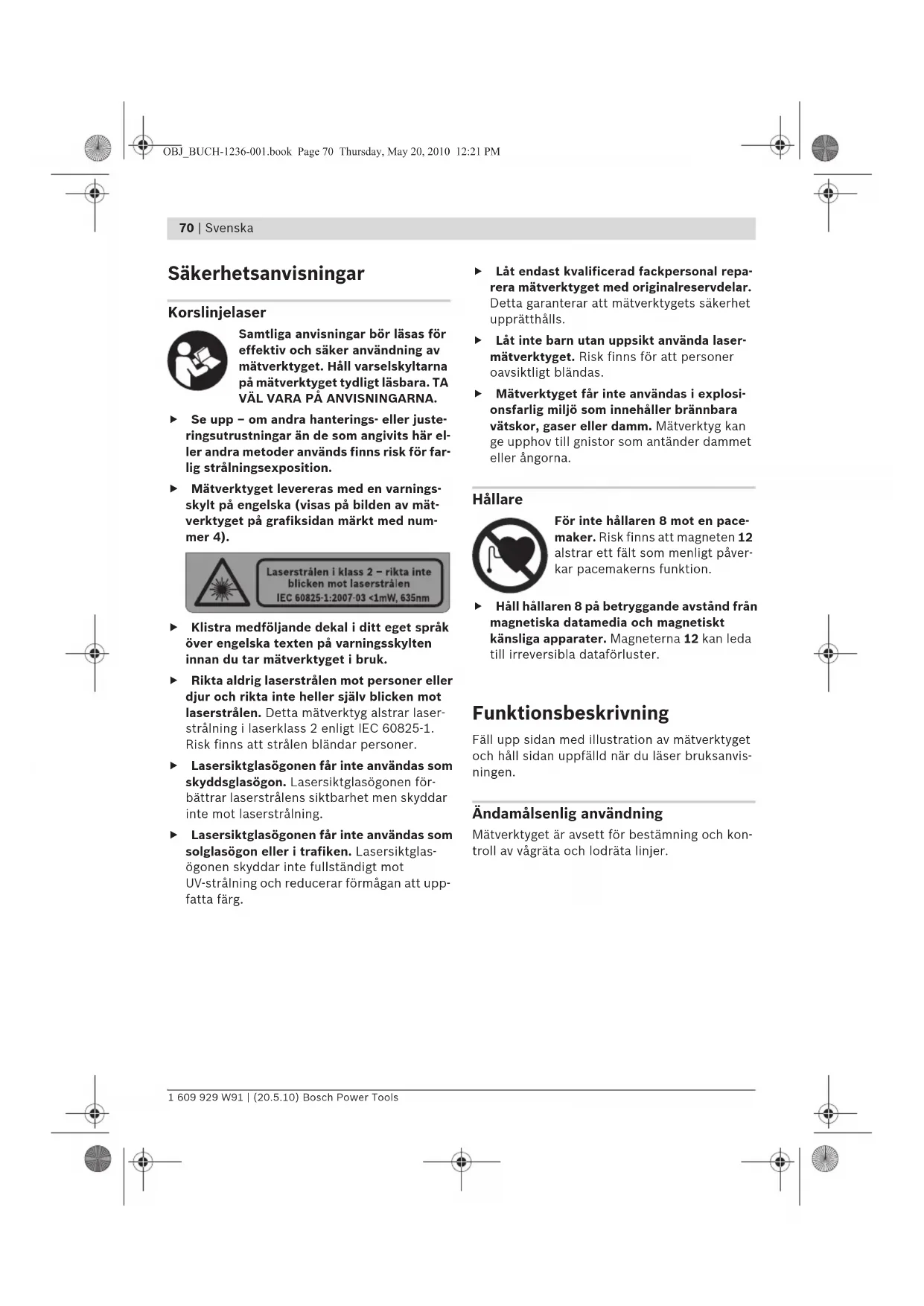 Säkerhetsanvisningar Korslinjelaser Samtliga anvisningar bör läsas för effektiv och säker användning av mätverktyget. Håll varselskyltarna på mätverktyget tydligt läsbara. TA VÄL VARA PÅ ANVISNINGARNA. f Se upp – om andra hanterings- eller juste- ringsutrustningar än de som angivits här el- ler andra metoder används finns risk för far- lig strålningsexposition. f Mätverktyget levereras med en varnings- skylt på engelska (visas på bilden av mät- verktyget på grafiksidan märkt med num- mer 4). f Klistra medföljande dekal i ditt eget språk över engelska texten på varningsskylten innan du tar mätverktyget i bruk. f Rikta aldrig laserstrålen mot personer eller djur och rikta inte heller själv blicken mot laserstrålen. Detta mätverktyg alstrar laser- strålning i laserklass 2 enligt IEC 60825-1. Risk finns att strålen bländar personer. f Lasersiktglasögonen får inte användas som skyddsglasögon. Lasersiktglasögonen för- bättrar laserstrålens siktbarhet men skyddar inte mot laserstrålning. f Lasersiktglasögonen får inte användas som solglasögon eller i trafiken. Lasersiktglas- ögonen skyddar inte fullständigt mot UV-strålning och reducerar förmågan att upp- fatta färg. f Låt endast kvalificerad fackpersonal repa- rera mätverktyget med originalreservdelar. Detta garanterar att mätverktygets säkerhet upprätthålls. f Låt inte barn utan uppsikt använda laser- mätverktyget. Risk finns för att personer oavsiktligt bländas. f Mätverktyget får inte användas i explosi- onsfarlig miljö som innehåller brännbara vätskor, gaser eller damm. Mätverktyg kan ge upphov till gnistor som antänder dammet eller ångorna. Hållare För inte hållaren 8 mot en pace- maker. Risk finns att magneten 12 alstrar ett fält som menligt påver- kar pacemakerns funktion. f Håll hållaren 8 på betryggande avstånd från magnetiska datamedia och magnetiskt känsliga apparater. Magneterna 12 kan leda till irreversibla dataförluster. Funktionsbeskrivning Fäll upp sidan med illustration av mätverktyget och håll sidan uppfälld när du läser bruksanvis- ningen. Ändamålsenlig användning Mätverktyget är avsett för bestämning och kon- troll av vågräta och lodräta linjer. OBJ_BUCH-1236-001.book Page 70 Thursday, May 20, 2010 12:21 PMSvenska | 71 Bosch Power Tools 1 609 929 W91 | (20.5.10) Tekniska data Illustrerade komponenter Numreringen av komponenterna hänvisar till il- lustration av mätverktyget på grafiksidan. 1 Utloppsöppning för laserstrålning 2 Stativfäste 1/4" 3 Strömställare Till/Från 4 Laservarningsskylt 5 Serienummer 6 Spärr på batterifackets lock 7 Batterifackets lock 8 Hållare 9 Låsskruv för hållaren 10 Hållarens skruvhål 11 Remgejd 12 Magneter 13 Stativgängfäste 1/4" på hållaren 14 Stativgängfäste 5/8" på hållaren 15 Skyddsfodral 16 Lasersiktglasögon* 17 Mätplatta med fot* 18 Stativ*