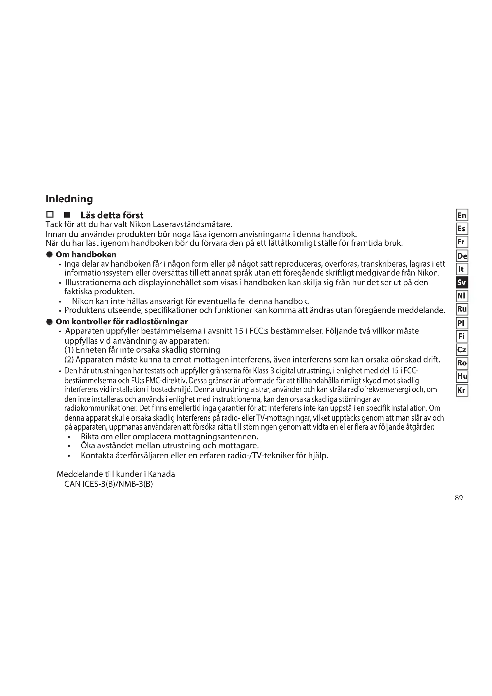 Inledning Läs detta först Tack för att du har valt Nikon Laseravståndsmätare. Innan du använder produkten bör noga läsa igenom anvisningarna i denna handbok. När du har läst igenom handboken bör du förvara den på ett lättåtkomligt ställe för framtida bruk. l Om handboken