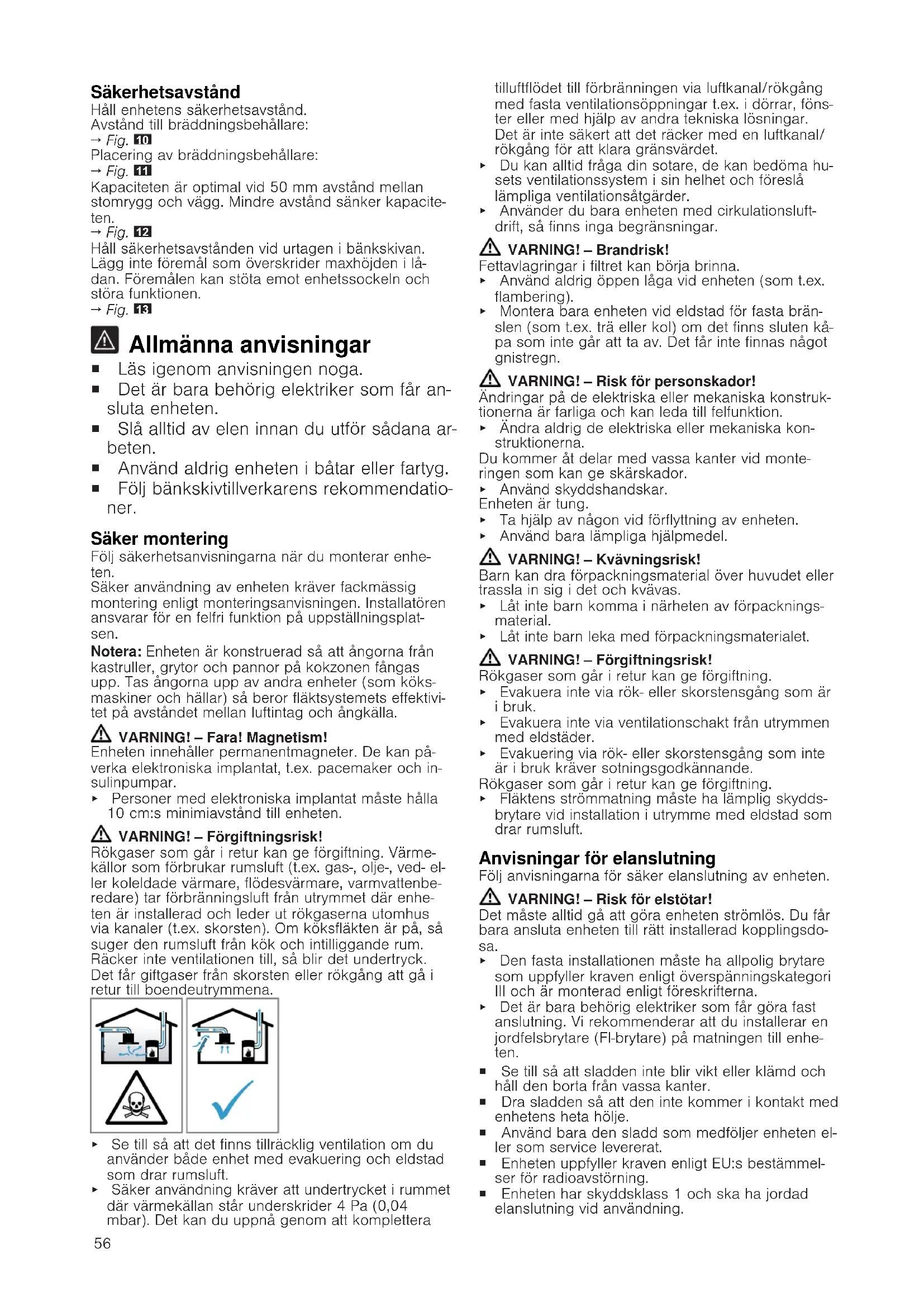 Allmänna anvisningar ¡ Läs igenom anvisningen noga. ¡ Det är bara behörig elektriker som får an- sluta enheten. ¡ Slå alltid av elen innan du utför sådana ar- beten. ¡ Använd aldrig enheten i båtar eller fartyg. ¡ Följ bänkskivtillverkarens rekommendatio- ner. Säker montering Följ säkerhetsanvisningarna när du monterar enhe- ten. Säker användning av enheten kräver fackmässig montering enligt monteringsanvisningen. Installatören ansvarar för en felfri funktion på uppställningsplat- sen. Notera:Enheten är konstruerad så att ångorna från kastruller, grytor och pannor på kokzonen fångas upp. Tas ångorna upp av andra enheter (som köks- maskiner och hällar) så beror fläktsystemets effektivi- tet på avståndet mellan luftintag och ångkälla. VARNING!‒Fara! Magnetism! Enheten innehåller permanentmagneter. De kan på- verka elektroniska implantat, t.ex. pacemaker och in- sulinpumpar. ▶ Personer med elektroniska implantat måste hålla 10cm:s minimiavstånd till enheten. VARNING!‒Förgiftningsrisk! Rökgaser som går i retur kan ge förgiftning. Värme- källor som förbrukar rumsluft (t.ex. gas-, olje-, ved- el- ler koleldade värmare, flödesvärmare, varmvattenbe- redare) tar förbränningsluft från utrymmet där enhe- ten är installerad och leder ut rökgaserna utomhus via kanaler (t.ex. skorsten). Om köksfläkten är på, så suger den rumsluft från kök och intilliggande rum. Räcker inte ventilationen till, så blir det undertryck. Det får giftgaser från skorsten eller rökgång att gå i retur till boendeutrymmena. ▶ Se till så att det finns tillräcklig ventilation om du använder både enhet med evakuering och eldstad som drar rumsluft. ▶ Säker användning kräver att undertrycket i rummet där värmekällan står underskrider 4 Pa (0,04 mbar). Det kan du uppnå genom att komplettera tilluftflödet till förbränningen via luftkanal/rökgång med fasta ventilationsöppningar t.ex. i dörrar, föns- ter eller med hjälp av andra tekniska lösningar. Det är inte säkert att det räcker med en luftkanal/ rökgång för att klara gränsvärdet. ▶ Du kan alltid fråga din sotare, de kan bedöma hu- sets ventilationssystem i sin helhet och föreslå lämpliga ventilationsåtgärder. ▶ Använder du bara enheten med cirkulationsluft- drift, så finns inga begränsningar. VARNING!‒Brandrisk! Fettavlagringar i filtret kan börja brinna. ▶ Använd aldrig öppen låga vid enheten (som t.ex. flambering). ▶ Montera bara enheten vid eldstad för fasta brän- slen (som t.ex. trä eller kol) om det finns sluten kå- pa som inte går att ta av. Det får inte finnas något gnistregn. VARNING!‒Risk för personskador! Ändringar på de elektriska eller mekaniska konstruk- tionerna är farliga och kan leda till felfunktion. ▶ Ändra aldrig de elektriska eller mekaniska kon- struktionerna. Du kommer åt delar med vassa kanter vid monte- ringen som kan ge skärskador. ▶ Använd skyddshandskar. Enheten är tung. ▶ Ta hjälp av någon vid förflyttning av enheten. ▶ Använd bara lämpliga hjälpmedel. VARNING!‒Kvävningsrisk! Barn kan dra förpackningsmaterial över huvudet eller trassla in sig i det och kvävas. ▶ Låt inte barn komma i närheten av förpacknings- material. ▶ Låt inte barn leka med förpackningsmaterialet. VARNING!‒Förgiftningsrisk! Rökgaser som går i retur kan ge förgiftning. ▶ Evakuera inte via rök- eller skorstensgång som är i bruk. ▶ Evakuera inte via ventilationschakt från utrymmen med eldstäder. ▶ Evakuering via rök- eller skorstensgång som inte är i bruk kräver sotningsgodkännande. Rökgaser som går i retur kan ge förgiftning. ▶ Fläktens strömmatning måste ha lämplig skydds- brytare vid installation i utrymme med eldstad som drar rumsluft. Anvisningar för elanslutning Följ anvisningarna för säker elanslutning av enheten. VARNING!‒Risk för elstötar! Det måste alltid gå att göra enheten strömlös. Du får bara ansluta enheten till rätt installerad kopplingsdo- sa. ▶ Den fasta installationen måste ha allpolig brytare som uppfyller kraven enligt överspänningskategori III och är monterad enligt föreskrifterna. ▶ Det är bara behörig elektriker som får göra fast anslutning. Vi rekommenderar att du installerar en jordfelsbrytare (FI-brytare) på matningen till enhe- ten. ¡ Se till så att sladden inte blir vikt eller klämd och håll den borta från vassa kanter. ¡ Dra sladden så att den inte kommer i kontakt med enhetens heta hölje. ¡ Använd bara den sladd som medföljer enheten el- ler som service levererat. ¡ Enheten uppfyller kraven enligt EU:s bestämmel- ser för radioavstörning. ¡ Enheten har skyddsklass 1 och ska ha jordad elanslutning vid användning.57 ¡ Tillverkaren tar inget ansvar för driftstörningar eller ev. skador som beror på felaktig elinstallation. Förbereda elanslutningen Krav:Det är bara utbildad servicetekniker som får arbeta inuti enheten och byta sladd.