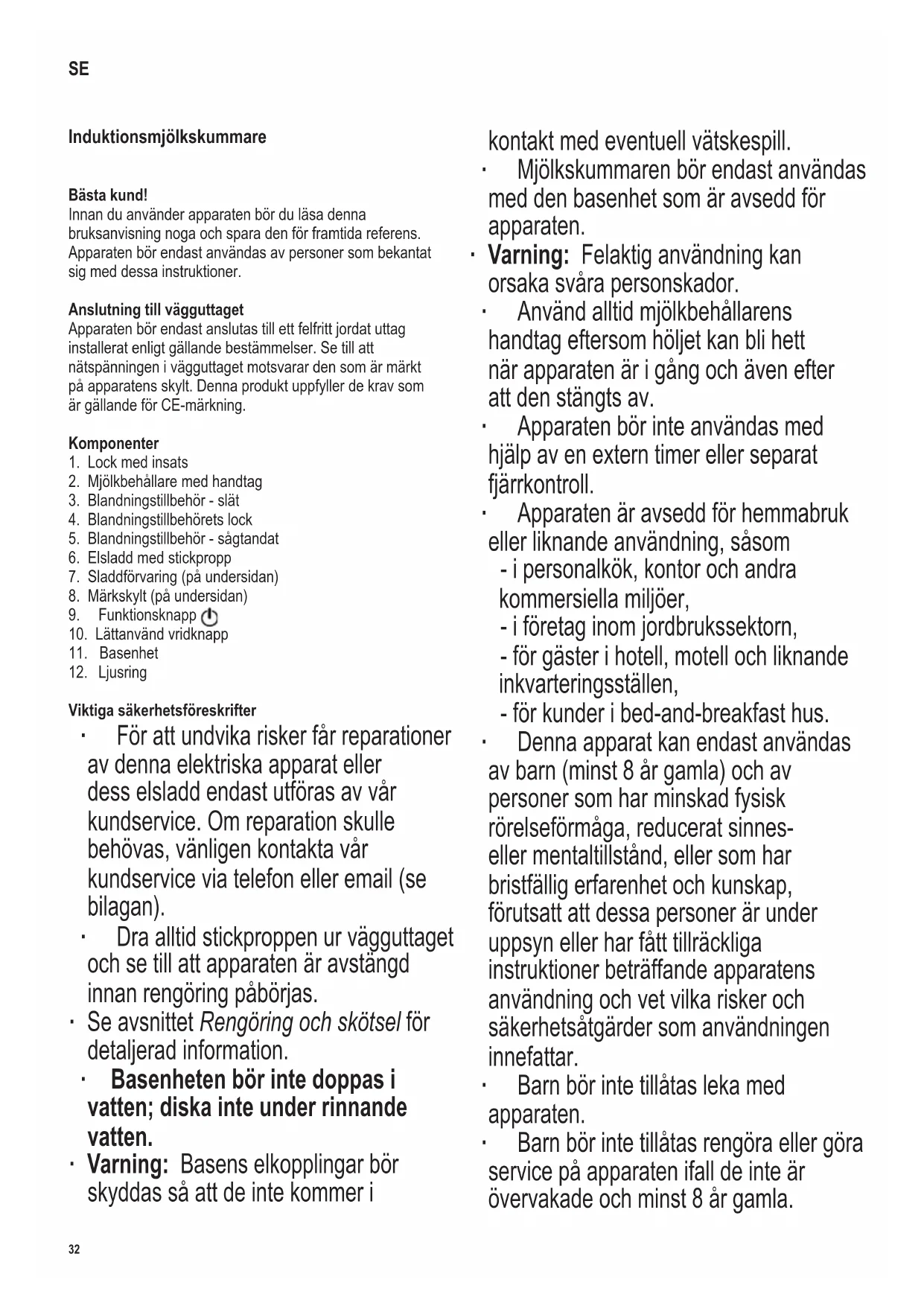 Viktiga säkerhetsföreskrifter ∙ För att undvika risker får reparationer av denna elektriska apparat eller dess elsladd endast utföras av vår kundservice. Om reparation skulle behövas, vänligen kontakta vår kundservice via telefon eller email (se bilagan). ∙ Dra alltid stickproppen ur vägguttaget och se till att apparaten är avstängd innan rengöring påbörjas. ∙ Se avsnittet Rengöring och skötsel för detaljerad information. ∙ Basenheten bör inte doppas i vatten; diska inte under rinnande vatten. ∙ Varning: Basens elkopplingar bör skyddas så att de inte kommer i kontakt med eventuell vätskespill. ∙ Mjölkskummaren bör endast användas med den basenhet som är avsedd för apparaten. ∙ Varning: Felaktig användning kan orsaka svåra personskador. ∙ Använd alltid mjölkbehållarens handtag eftersom höljet kan bli hett när apparaten är i gång och även efter att den stängts av. ∙ Apparaten bör inte användas med hjälp av en extern timer eller separat fjärrkontroll. ∙ Apparaten är avsedd för hemmabruk eller liknande användning, såsom - i personalkök, kontor och andra kommersiella miljöer, - i företag inom jordbrukssektorn, - för gäster i hotell, motell och liknande inkvarteringsställen, - för kunder i bed-and-breakfast hus. ∙ Denna apparat kan endast användas av barn (minst 8 år gamla) och av personer som har minskad fysisk rörelseförmåga, reducerat sinnes- eller mentaltillstånd, eller som har bristfällig erfarenhet och kunskap, förutsatt att dessa personer är under uppsyn eller har fått tillräckliga instruktioner beträffande apparatens användning och vet vilka risker och säkerhetsåtgärder som användningen innefattar. ∙ Barn bör inte tillåtas leka med apparaten. ∙ Barn bör inte tillåtas rengöra eller göra service på apparaten ifall de inte är övervakade och minst 8 år gamla. SE33 142 x 208 mm ∙ Apparaten och dess elsladd bör hållas utom räckhåll för barn under 8 år. ∙ Varning: Håll barn på avstånd från apparatens förpackningsmaterial eftersom fara eventuellt kan uppstå.Detnnst.ex.riskförkvävning. ∙ Innan varje användning bör apparaten samt dess elsladd och monterade tillbehör inspekteras noga så att de inte har några skador. Om apparaten t ex har tappats på en hård yta, eller om elsladden har utsatts för alltför hård kraft, bör den inte längre användas: Även osynliga skador kan försämra apparatens driftsäkerhet. ∙ Apparaten är endast ämnad för uppvärmning och skumning av mjölk, varm choklad och kakao. Häll inte någon annan vätska eller fasta matprodukter i behållaren. ∙ Lämna inte mjölkskummaren utan uppsikt när den är påkopplad. ∙ Observera alltid min- och max-märkningarna på insidan av behållaren. ∙ Utbuktningen i behållarens botten (min. nivåmärket) bör täckasmedmjölk.Omdetintennstillräckligtmedmjölk kan apparaten överhettas. ∙ Varning: Om du fyller behållaren för mycket kan det uppstå fara om skummande mjölk hamnar utanför. ∙ Varning: Locket måste alltid vara på plats under användning. ∙ Täck inte ventilationsöppningarna på baksidan. ∙ Apparaten kan endast användas med originaltillbehören som tillhandahålls av tillverkaren. ∙ Apparaten bör alltid placeras på en fast och jämn yta. ∙ Låt inte höljet eller elsladden komma i kontakt med öppen eld eller heta ytor såsom spisplattor. ∙ Låt inte elsladden hänga fritt; sladden måste hållas på säkert avstånd från apparatens heta delar. ∙ Dra alltid stickproppen ur vägguttaget - ifall apparaten skulle krångla, - efter användning, - innan apparaten rengörs. ∙ Ta stickproppen ur vägguttaget genom att dra i stickproppen, aldrig i sladden. ∙ Inget ansvar godtas om skada uppkommer till följd av felaktig användning, eller om dessa instruktioner inte följts. Innan första användningen ∙ Ta bort allt kvarvarande förpackningsmaterial och reklamklistermärkenochkontrolleraattalladelarnns med. ∙ Innan produkten används för första gången, eller om den inte använts under en lång tid, bör den rengöras noggrant enligt avsnittet Rengöring och skötsel. Sladdförvaring ∙ Detnnsettförvaringsfackförelsladdenibasenheten. ∙ Vira ut sladden till den önskade längden före användning. ∙ Vira upp elsladden igen efter användningen. Användning Lock ∙ Locket måste alltid vara på plats under användning. ∙ Då du vill tillsätta ingredienser under användningen bör du vrida på och ta bort locket från insatsen. ∙ Vid förvaring kan det släta blandningstillbehöret monteras på lockinsatsen. Ljusring Röd En funktion med uppvärmning är vald. Blå En funktion utan uppvärmning är vald. Konstant ljus Tillagning pågår. Blinkande rött eller blått Enheten väntar på input, tillagningen är klar eller det har uppstått ett fel (se Problemlösning i slutet av instruktionerna). Val av blandningstillbehör Följandeblandningstillbehörnns: è jämnt è sågtandat