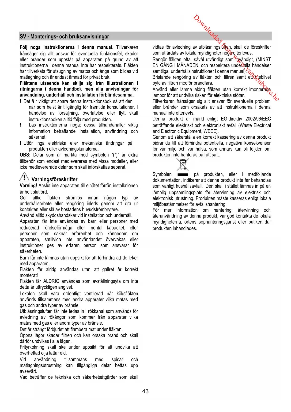 Downloaded from www.vandenborre.be43 SV - Monterings- och bruksanvisningar Följ noga instruktionerna i denna manual. Tillverkaren frånsäger sig allt ansvar för eventuella funktionsfel, skador eller bränder som uppstår på apparaten på grund av att instruktionerna i denna manual inte har respekterats. Fläkten har tillverkats för utsugning av matos och ånga som bildas vid matlagning och är endast ämnad för privat bruk. Fläktens utseende kan skilja sig från illustrationen i ritningarna i denna handbok men alla anvisningar för användning, underhåll och installation förblir desamma. ! Det ä r viktigt att spara denna instruktionsbok så att den när som helst är tillgänglig för framtida konsultationer. I händelse av försäljning, överlåtelse eller flytt skall instruktionsboken alltid följa med produkten. ! Läs instruktionerna noga: dessa tillhandahåller viktig information beträffande installation, användning och säkerhet. ! Utför inga elektriska eller mekaniska ändringar på produkten eller avledningskanalerna. OBS: Delar som är märkta med symbolen “(*)” är extra tillbehör som endast medlevereras med vissa modeller, eller icke medlevererade delar som skall införskaffas separat. Varningsföreskrifter Varning! Anslut inte apparaten till elnätet förrän installationen är helt slutförd. Gör alltid fläkten strömlös innan någon typ av underhållsarbete eller rengöring inleds genom att dra ur kontakten eller slå av bostadens huvudströmbrytare. Använd alltid skyddshandskar vid installation och underhåll. Apparaten får inte användas av barn eller personer med reducerad rörelseförmåga eller mental kapacitet, eller personer som saknar erfarenhet och kännedom om apparaten, såtillvida inte användandet övervakas eller instruktioner ges av erfaren person som ansvarar för säkerheten. Barn får inte lämnas utan uppsikt för att förhindra att de leker med apparaten. Fläkten får alridg användas utan att gallret är korrekt monterat! Fläkten får ALDRIG användas som avställningsyta om inte detta är uttryckligen angivet. Lokalen skall vara ordentligt ventilerad när köksfläkten används tillsammans med andra apparater vilka matas med gas och andra typer av bränsle. Utblåsningsluften får inte ledas in i rökkanal som används för avledning av rökångor som kommer från apparater vilka matas med gas eller andra typer av bränsle. Det är strängt förbjudet att flambera mat under fläkten. Öppna lågor skadar filtren och kan orsaka brand och skall därför undvikas i alla lägen. Frityrkokning skall ske under uppsikt för att undvika att överhettad olja fattar eld. Vid användning tillsammans med spisar och matlagningsutrustning kan tillgängliga delar hettas upp avsevärt. Vad beträffar de tekniska och säkerhetsåtgärder som skall vidtas för avledning av utblåsningsluften, skall de föreskrifter som utfärdats av lokala myndigheter noga efterlevas. Rengör fläkten ofta, såväl utvändigt som invändigt, (MINST EN GÅNG I MÅNADEN, och respektera under alla händelser samtliga underhållsinstruktioner i denna manual). Bristande rengöring av fläkten och filtren samt ett uteblivet byte av filtren medför brandfara. Använd eller lämna aldrig fläkten utan korrekt imonterade lampor för att undvika risken för elektriska stötar. Tillverkaren frånsäger sig allt ansvar för eventuella problem eller bränder som orsakats av att instruktionerna i denna manual inte efterlevts. Denna produkt är märkt enligt EG-direktiv 2002/96/EEC beträffande elektriskt och elektroniskt avfall (Waste Electrical and Electronic Equipment, WEEE). Genom att säkerställa en korrekt kassering av denna produkt bidrar du till att förhindra potentiella, negativa konsekvenser för vår miljö och vår hälsa, som annars kan bli följden om produkten inte hanteras på rätt sätt. Symbolen på produkten, eller i medföljande dokumentation, indikerar att denna produkt inte får behandlas som vanligt hushållsavfall. Den skall i stället lämnas in på en lämplig uppsamlingsplats för återvinning av elektrisk och elektronisk utrustning. Produkten måste kasseras enligt lokala miljöbestämmelser för avfallshantering. För mer information om hantering, återvinning och återanvändning av denna produkt, var god kontakta de lokala myndigheterna, ortens sophanteringstjänst eller butiken där produkten inhandlades. Downloaded from www.vandenborre.be44 Användning Fläkten har tillverkats för att användas som utsugningsversion med utvändig evakuering eller som filterversion med intern återcirkulation. Utsugningsversion Matoset leds ut ur lokalen med hjälp av ett avledningsrör som är fixerat på anslutningsflänsen. Avledningsröret skall ha samma diameter som anslutningsflänsen. Varning! Avledningsröret medlevereras inte och skall införskaffas separat. Röret skall, även när det är horisontellt draget, alltid luta lätt (cirka 10°) uppåt, så att luften lätt kan ledas ut ur lokalen. I det fall fläkten är försedd med kolfilter skall dessa tas ur. Rören och utloppsöppningarna i väggen med vilka fläkten skall anslutas bör ha samma diameter som luftutsläppet (anslutningsflänsen). I det fall man använder rör och utloppsöppningar i väggen med mindre diameter medför detta en lägre utblåsprestanda och en drastisk förhöjning av bullernivån. Vi avsäger oss därför allt ansvar gällande denna typ av problem. ! Använd ett så kort rör som möjligt. ! Röret skall vara så rakt som möjligt (högsta tillåtna vinkel på böjarna 90°). ! Undvik stora skillnader i rörets tvärsnittsarea. ! Använd rör vars insida är så slät som möjligt. ! Röret skall vara tillverkat av i lag godkända material. Filterversion Den utsugna luften avfettas och befrias från odörer innan den leds ut i lokalen igen. När fläkten används med denna version är det nödvändigt att installera ett extra aktivt kolfiltersystem.