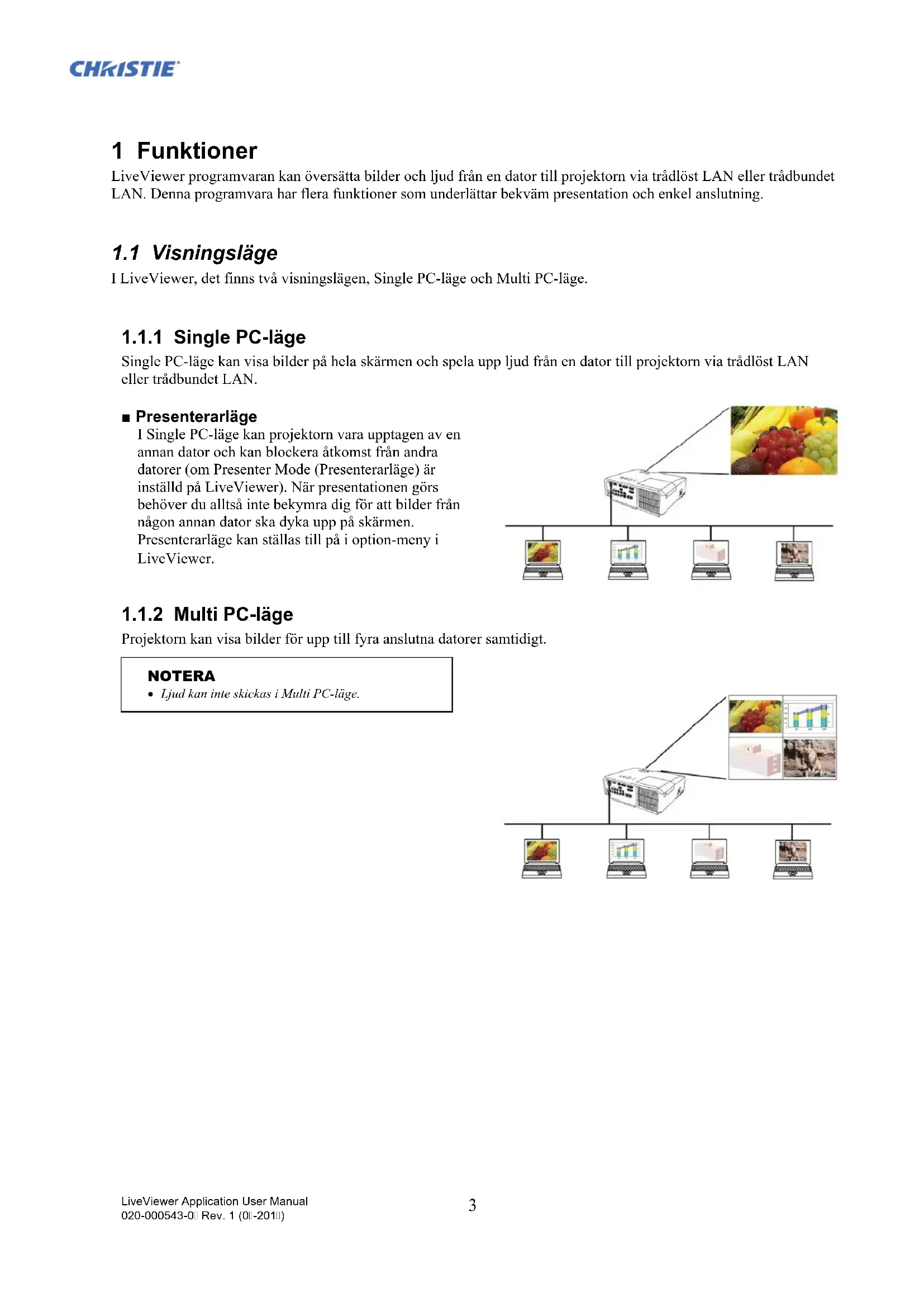 Ontrollera och hämta den senaste versionen på Christie Webbplatsen. http://www.christiedigital.com En del funktioner som förklaras i den här handboken kräver “LiveViewer” version 6.xx. (“x” i versionsnumret betyder 0 eller mer. ) LiveViewer Application User Manual 020-000543-0 Rev. 1 (0-201)7 3 Starta med LiveViewer Detta avsnitt förklarar hur man använder LiveViewer. Översikt över förfarande enligt följande: STEG 1. Installera LiveViewer programmet ( nedan) STEG 2. Anslut till nätverk ( 9) Snabb anslutning förbereder några alternativ för att ansluta till projektorn. Välj det som passar dina krav. Välj från listan Passcode för anslutning Profil för anslutning Historik för anslutning Manuell anslutning Min anslutning I en del fall är flera projektorer anslutna i samma nätverk. Innan du skickar iväg din bild, se till att rätt projektor är vald. STEG 3. Starta Nätverkspresentation ( 24) LiveViewer huvudmeny visas på skärmen. Nu är det klart att sända dina bilder till projektorn via nätverket.