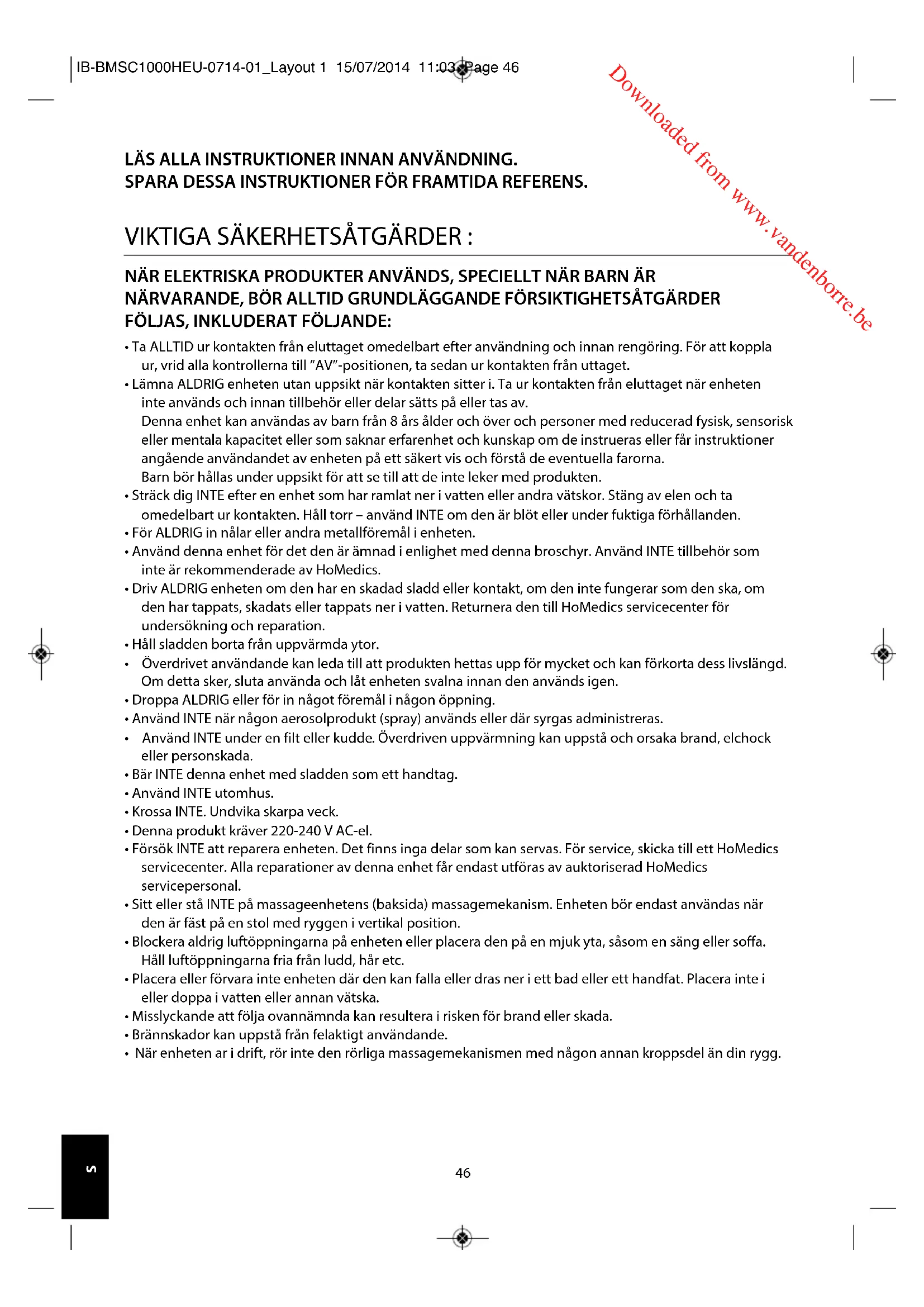 - När enheten ar i drift, rör inte den rörliga massagemekanismen med någon annan kroppsdel än din rygg. IB-BMSC1000HEU-0714-01_Layout 1 15/07/2014 11:03 Page 46 Downloaded from www.vandenborre.be47