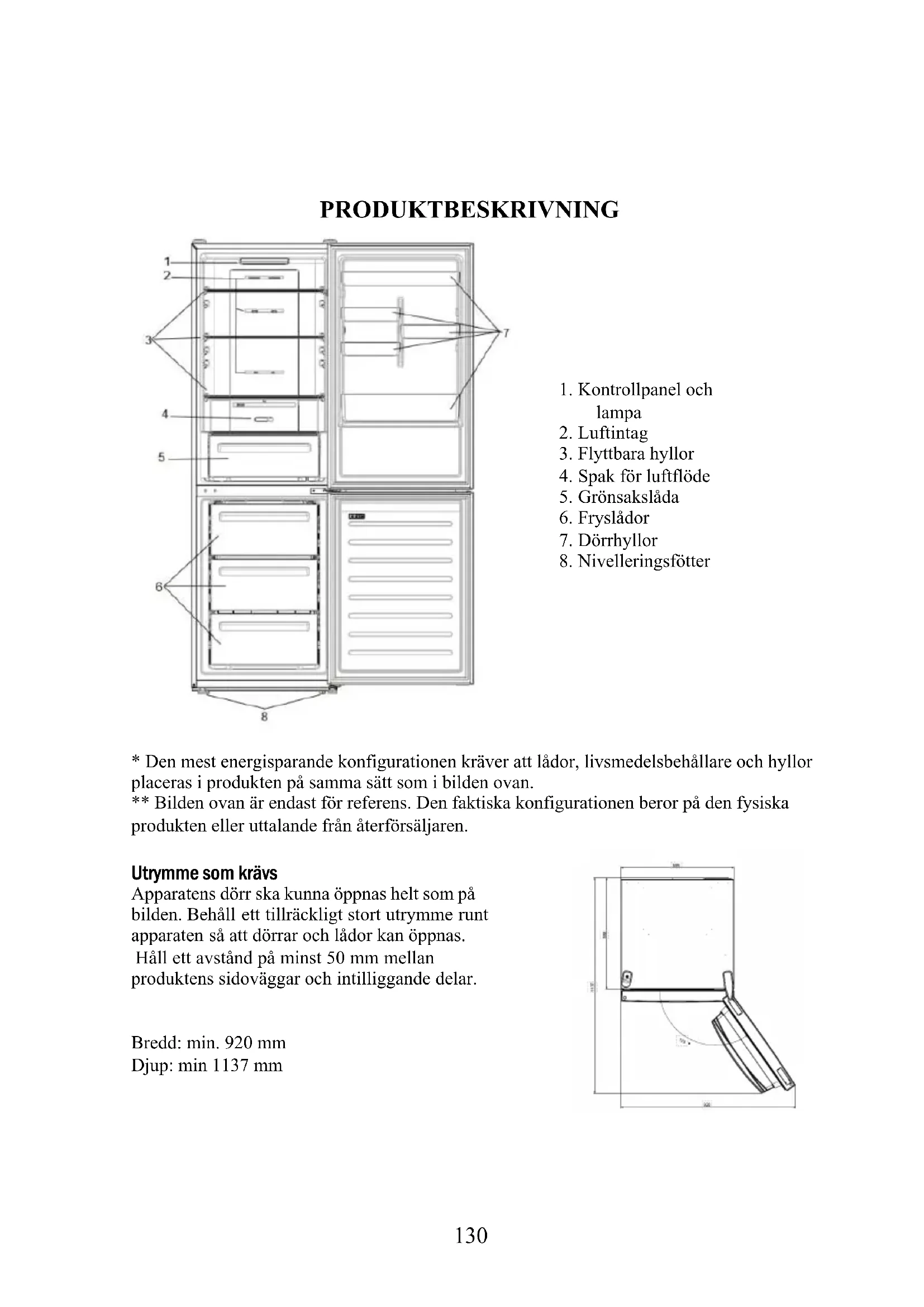 - Den mest energisparande konfigurationen kräver att lådor, livsmedelsbehållare och hyllor placeras i produkten på samma sätt som i bilden ovan. ** Bilden ovan är endast för referens. Den faktiska konfigurationen beror på den fysiska produkten eller uttalande från återförsäljaren. Utrymme som krävs Apparatens dörr ska kunna öppnas helt som på bilden. Behåll ett tillräckligt stort utrymme runt apparaten så att dörrar och lådor kan öppnas. Håll ett avstånd på minst 50 mm mellan produktens sidoväggar och intilliggande delar. Bredd: min. 920 mm Djup: min 1137 mm131 ANVÄNDNING PÅ/AV-knappen används för att slå på/av apparaten. Set-knappen används för att justera temperaturen eller för att välja Super Cool-funktionen. Super Cool-ikonen, visar om funktionen är aktiverad.