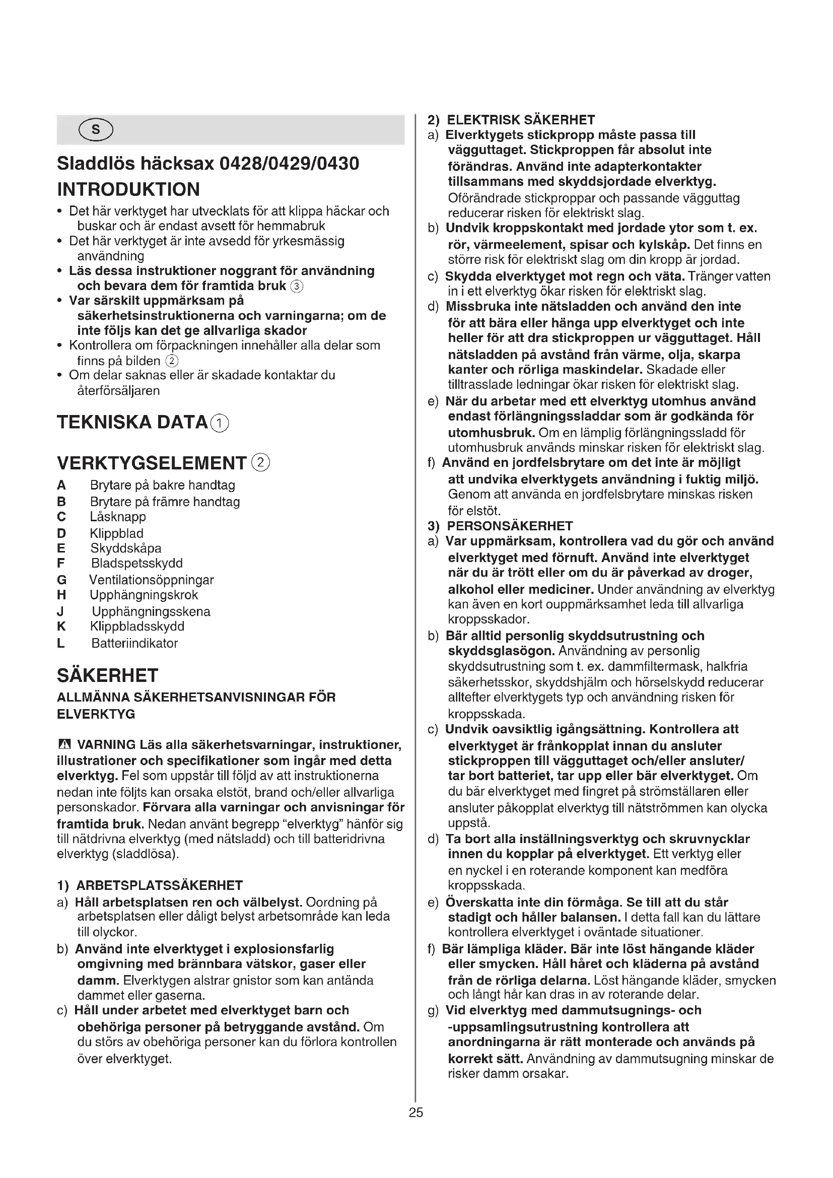e) Hall endast hacksaxen i de isolerade greppytorna, dà bladet kan komma i kontakt med dolda sladdar. Blad somkommen ikontakt med en stromforande ledning kan medfora att hacksaxens exponerade metalldelar blir stromforande och leda till att användaren fár en elektrisk stöt.