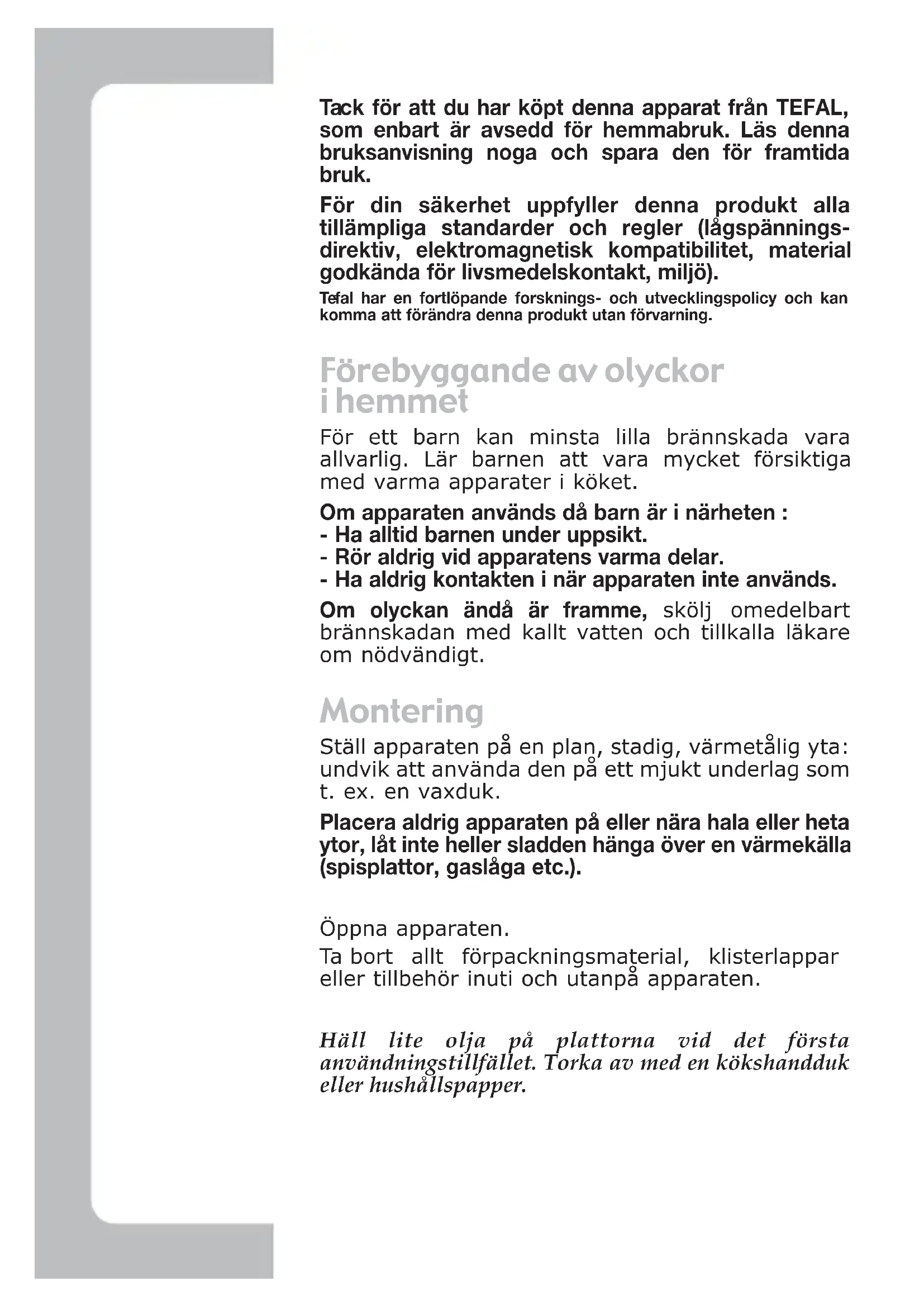 - 250 g Mehl • 10 g Backpulver • 1 Prise Salz • 2 Stückchen Zucker • 75 g Butter • 2 Eier • 1/4 l Milch • 1 Glas Cognac • Vanille-Eis • Schokolade Verrühren Sie Backpulver, Zucker und ein Glas Wasser, lassen es 15 Minuten stehen. Rühren Sie dies anschließend unter die Eier und die Butter. Geben Sie dann Milch, Mehl, Cognac und Salz hinzu, bis Sie eine flüssige Mixtur haben. Lassen Sie diesen Teig ca. 3 Stunden in einem warmen Raum stehen. Vor dem Servieren geben Sie 2 Kugeln Vanilleeis mit etwas heißer Schokolade hinzu (Man kann auch Puderzucker oder Marmelade dazu servieren). Waffeln Gaufr ultracomp 08/05 12/10/05 16:57 Page 17Tack för att du har köpt denna apparat från TEFAL, som enbart är avsedd för hemmabruk. Läs denna bruksanvisning noga och spara den för framtida bruk. För din säkerhet uppfyller denna produkt alla tillämpliga standarder och regler (lågspännings- direktiv, elektromagnetisk kompatibilitet, material godkända för livsmedelskontakt, miljö). Tefal har en fortlöpande forsknings- och utvecklingspolicy och kan komma att förändra denna produkt utan förvarning. Förebyggande av olyckor i hemmet För ett barn kan minsta lilla brännskada vara allvarlig. Lär barnen att vara mycket försiktiga med varma apparater i köket. Om apparaten används då barn är i närheten : - Ha alltid barnen under uppsikt. - Rör aldrig vid apparatens varma delar. - Ha aldrig kontakten i när apparaten inte används. Om olyckan ändå är framme, skölj omedelbart brännskadan med kallt vatten och tillkalla läkare om nödvändigt. Montering Ställ apparaten på en plan, stadig, värmetålig yta: undvik att använda den på ett mjukt underlag som t. ex. en vaxduk. Placera aldrig apparaten på eller nära hala eller heta ytor, låt inte heller sladden hänga över en värmekälla (spisplattor, gaslåga etc.). Öppna apparaten. Ta bort allt förpackningsmaterial, klisterlappar eller tillbehör inuti och utanpå apparaten. Häll lite olja på plattorna vid det första användningstillfället. Torka av med en kökshandduk eller hushållspapper. Gaufr ultracomp 08/05 12/10/05 16:57 Page 18Français Anslutning och förvärmning Stäng igen apparaten. Sätt i stickkontakten i vägguttaget: den röda lampan tänds . Vid det första användningstillfället kan apparaten avge lite os och rök. Detta är helt normalt. Kontrollera att nätspänningen är kompatibel med uppgifterna som är noterade på apparatens märkskylt. Anslut alltid apparaten till ett jordat vägguttag. Om sladden skadas, skall den bytas ut av tillverkaren, dennes serviceagent eller likvärdigt kvalificerad person för att undvika fara. Tillagning Låt apparaten förvärmas, när rätt temperatur är uppnådd tänds den gröna lampan . Rör inte vid apparatens metalldelar under förvärmningen, eftersom de är mycket heta. Välj önskad temperatur med hjälp av termo- staten . Öppna apparaten. Häll ut våffelsmeten mitt på gräddningsplattan