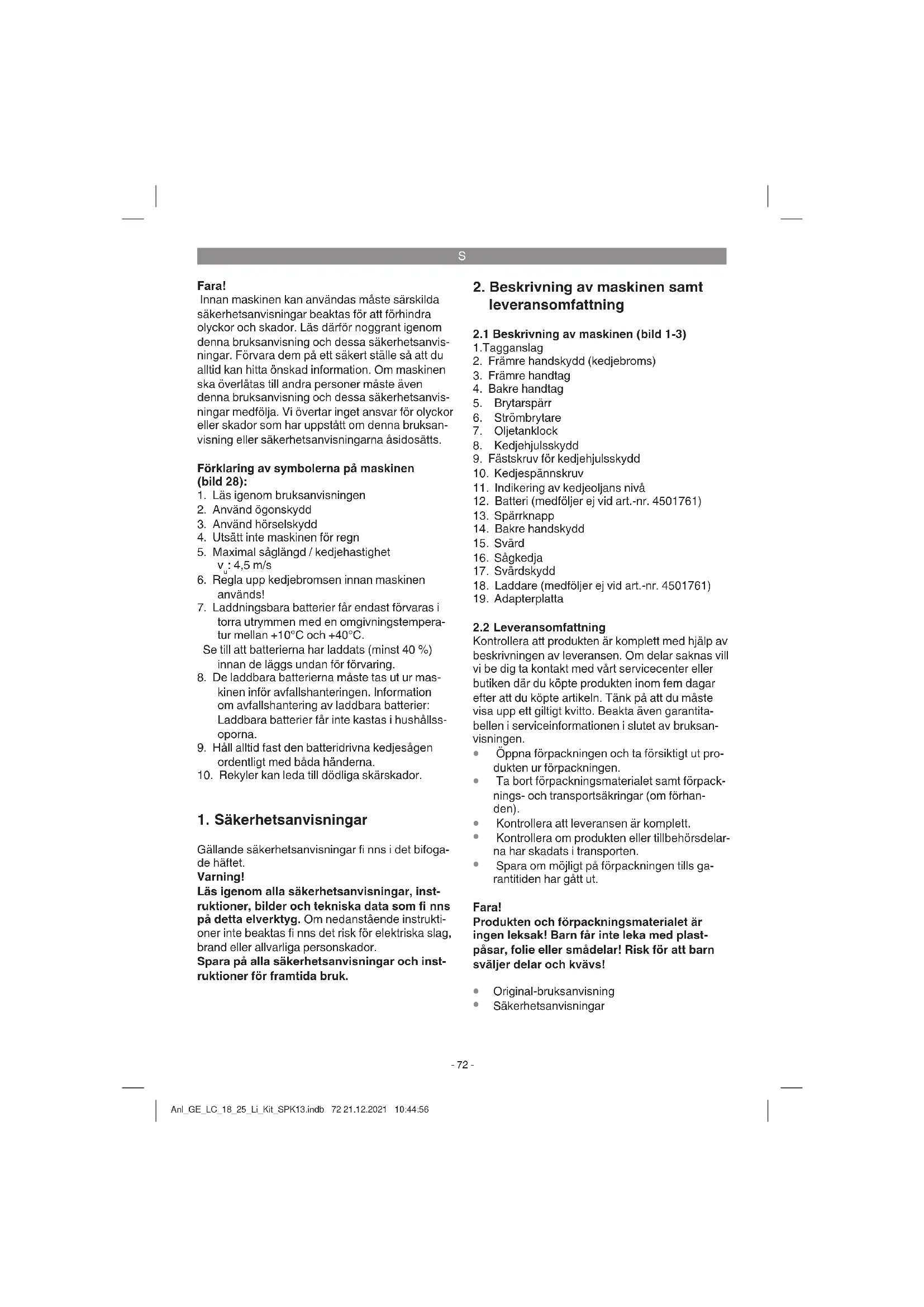 Motorbroms Motorn bromsar genast sågkedjan när strömbry- taren (bild 1/pos. 6) har släppts eller om ström- försörjningen har brutits. Därigenom kan risken för personskador pga. en efterroterande kedja sänkas markant. Kedjebroms Kedjebromsen är en skyddsmekanism som ut- löses av det främre handskyddet (bild 1/pos. 2). Om kedjesågen slungas tillbaka pga. en rekyl, utlöses kedjebromsen varefter sågkedjan stop- pas inom kortare tid än 0,1 sekunder. Kontrollera regelbundet kedjebromsens funktion. Fäll fram handskyddet (bild 1/pos. 2) och försök att slå på kedjesågen. Sågkedjan får inte kunna startas. Dra tillbaka det främre handskyddet (bild 1/pos. 2) tills det snäpper fast för att lossa på kedjebrom- sen. Fara! Sågen får endast användas om skyddsa- nordningarna är intakta. Försök inte att reparera säkerhetsrelevanta skyddsanordningar på egen hand, utan kontakta vår service eller en liknande kvalifi cerad verkstad. Anl_GE_LC_18_25_Li_Kit_SPK13.indb 75 21.12.2021 10:44:57S