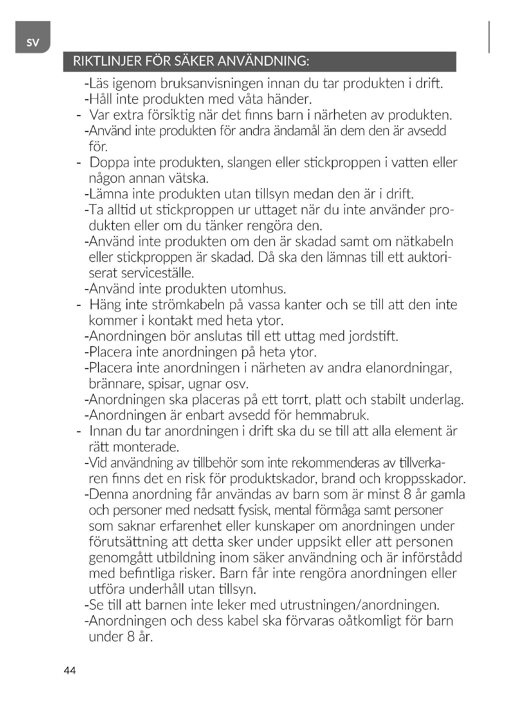Denna anordning får användas av barn som är minst 8 år gamla och personer med nedsa fysisk, mental förmåga samt personer som saknar erfarenhet eller kunskaper om anordningen under förutsäning a dea sker under uppsikt eller a personen genomgå utbildning inom säker användning och är införstådd med bentliga risker. Barn får inte rengöra anordningen eller uöra underhåll utan llsyn. - Se ll a barnen inte leker med utrustningen/anordningen.