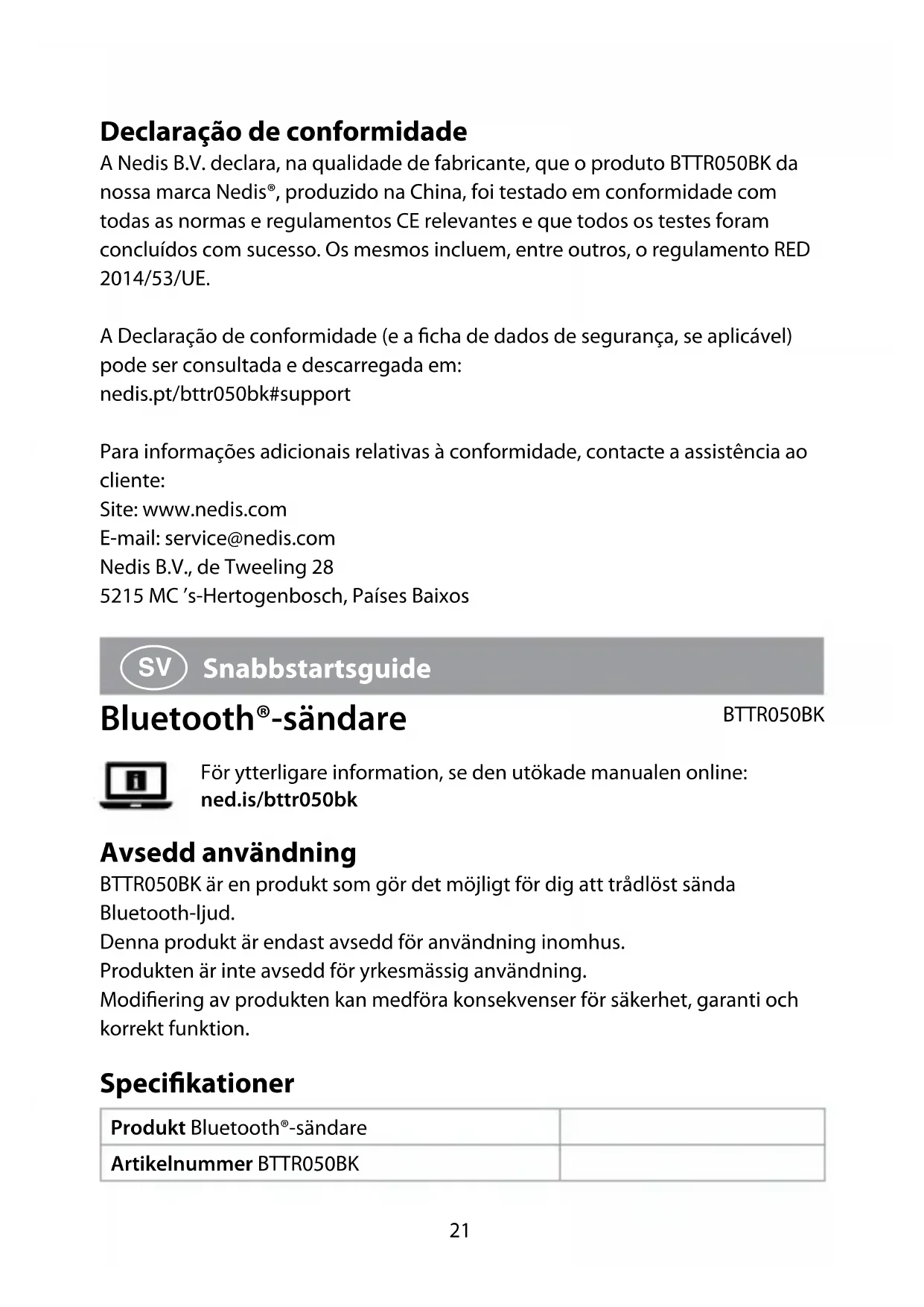 tänds och indikerar att parningen lyckats. Försäkran om överensstämmelse Vi, Nedis B.V., försäkrar som tillverkare att produkten BTTR050BK från vårt varumärke Nedis®, tillverkad i Kina, har testats i enlighet med alla relevanta CE- standarder och föreskrifter och att alla tester genomförts med godkänt resultat. Detta inkluderar, men är inte begränsat till, radioutrustningsdirektivet 2014/53/ EU. Den fullständiga försäkran om överensstämmelse (och säkerhetsdatabladet, om tillämpligt) kan läsas och laddas ned från: nedis.sv/bttr050bk#support För ytterligare information om överensstämmelse, var god kontakta vår kundtjänst: Webbplats: www.nedis.com E-post: service@nedis.com Nedis B.V., de Tweeling 28 5215 MC ’s-Hertogenbosch, Nederländerna24